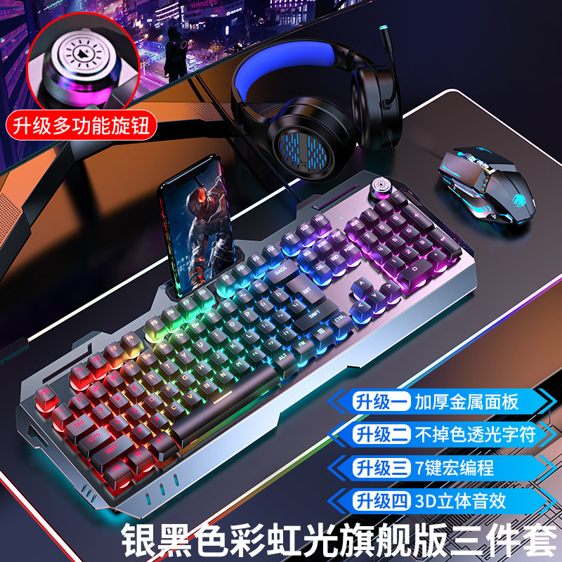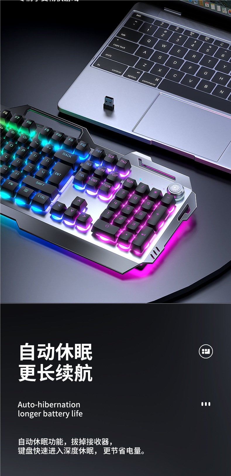 • 메탈 메카니컬 느낌 - 게이밍 전용 - 실버 및 블랙 레인보우 라이트 3종 세트 [무선 듀얼 모드 충전 버전] + 무선 게이밍 마우스 + 헤드폰 - No - 104키 - 공식
