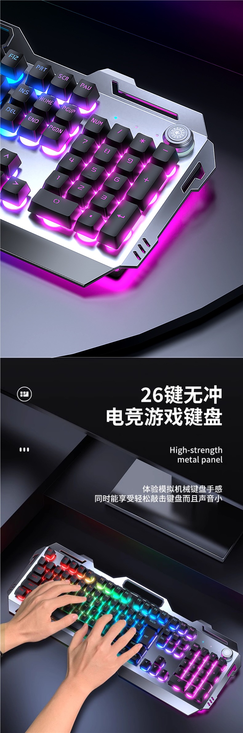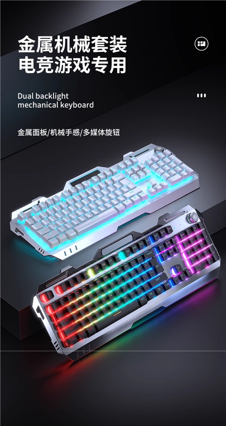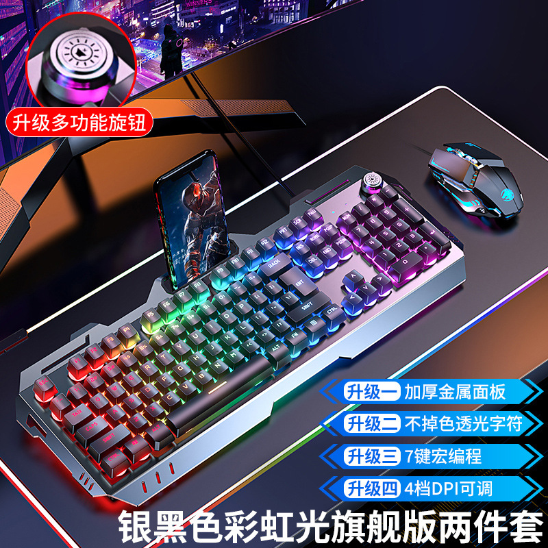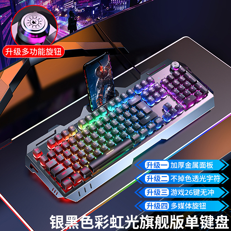 • 메탈 메카니컬 느낌 - 게이밍 전용 - 실버 및 블랙 레인보우 라이트 [럭셔리 업그레이드 버전] + 메카니컬 마우스 - 없음 - 104키 - 공식 규격