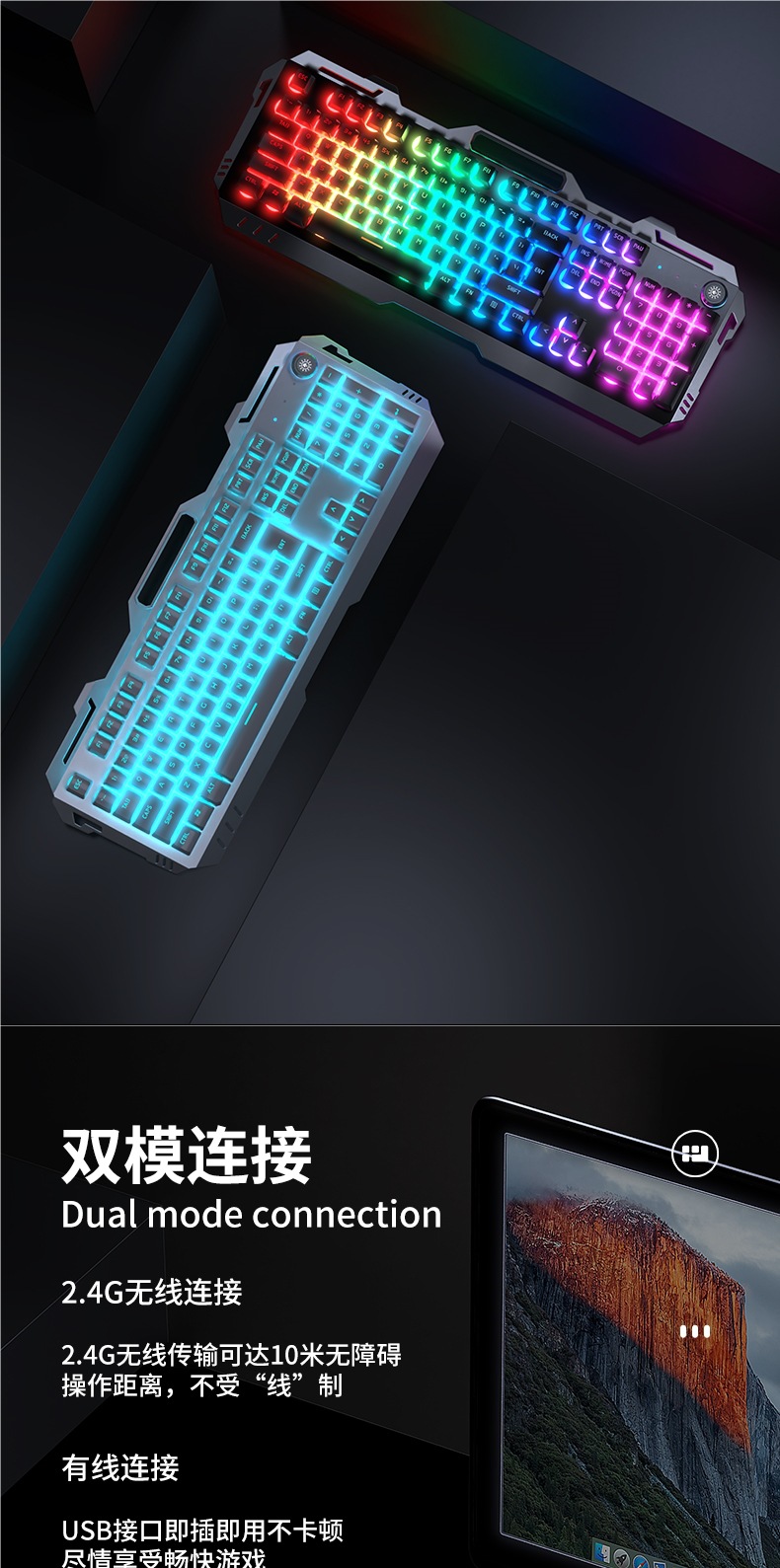 • 메탈 기계식 느낌 - 게임 전용 - 실버 및 블랙 레인보우 라이트 [무선 듀얼 모드 충전 버전] - 아니요 - 104 키 - 공식 표준