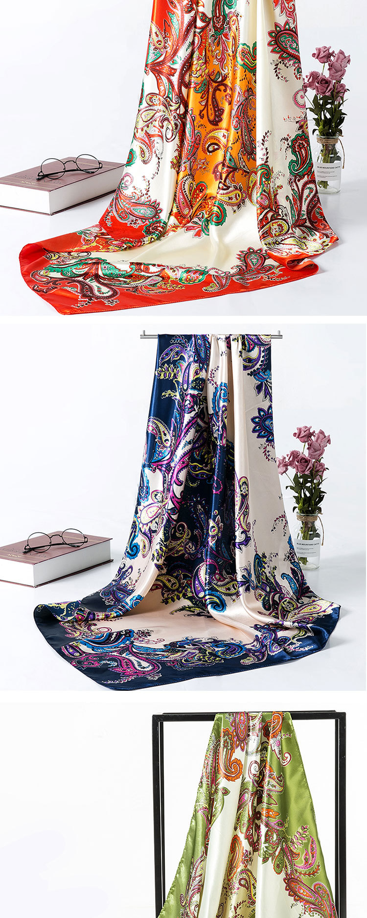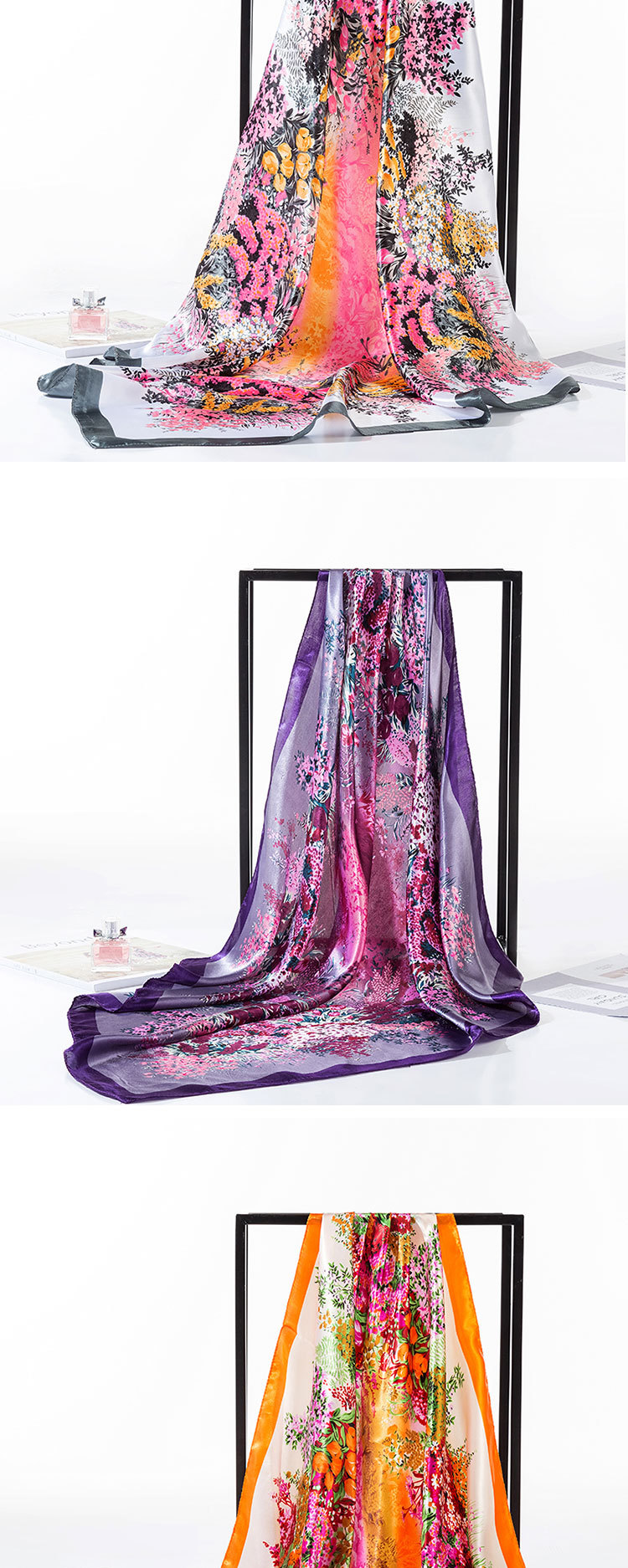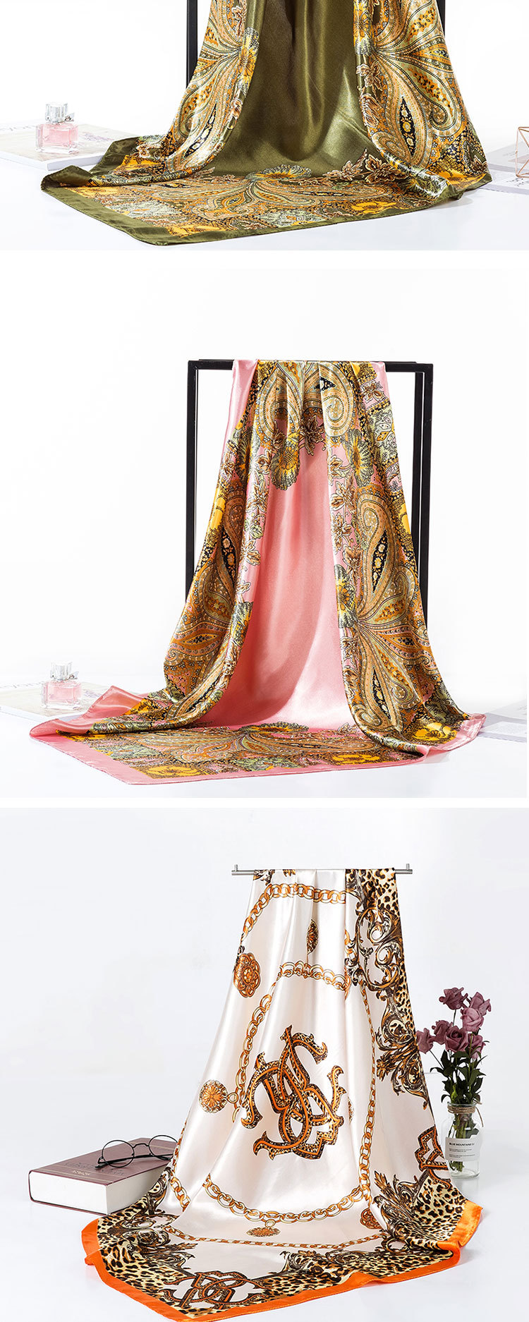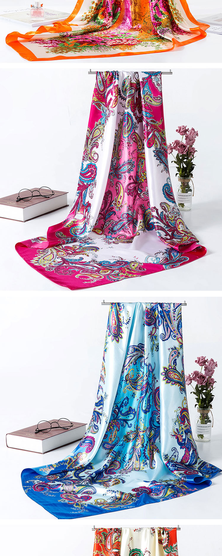 2025 새로운 여성의 모조 실크 스카프 허리 드럼 꽃 시리즈 전문 대형 사각형 스카프 목도리 스카프 도매스토어 가기