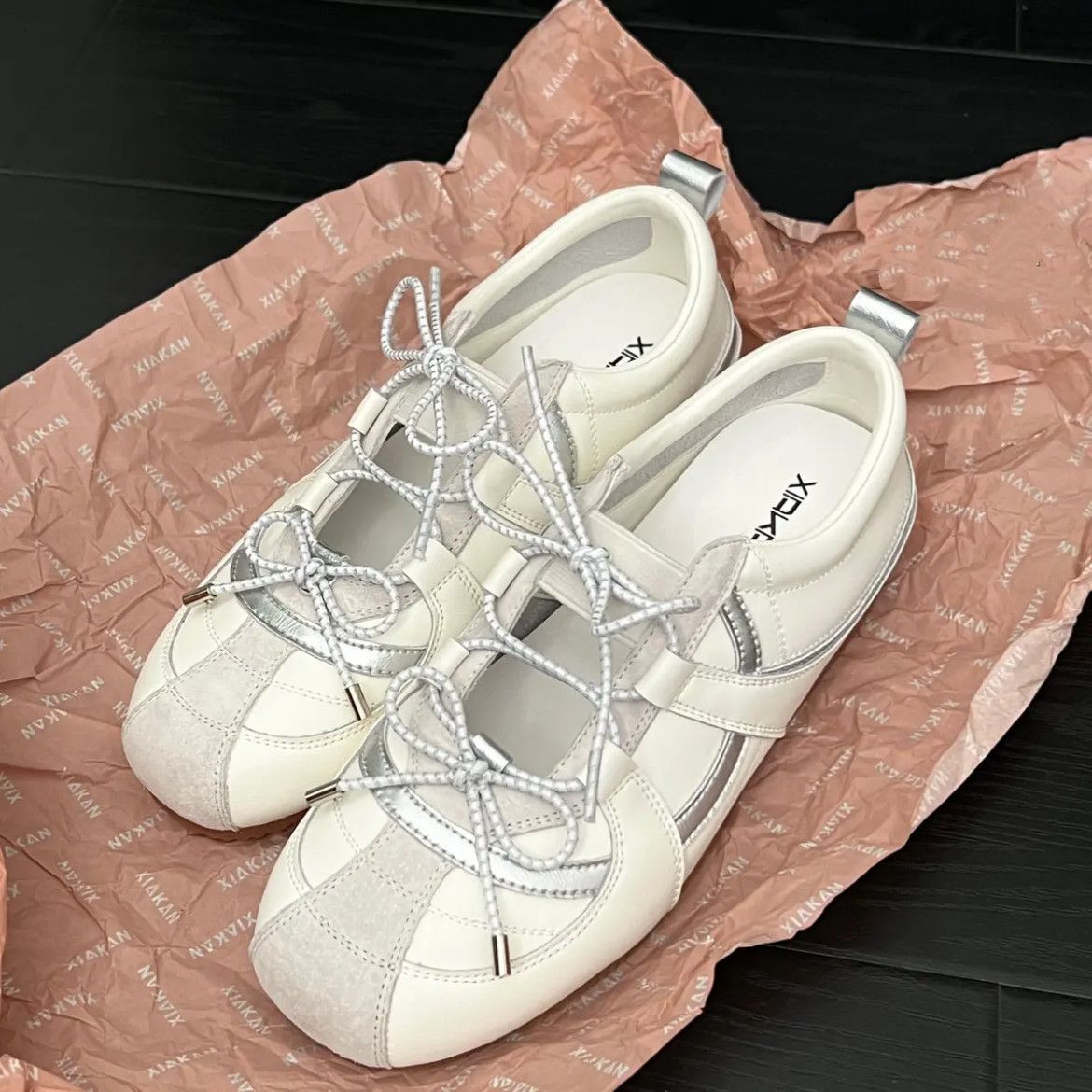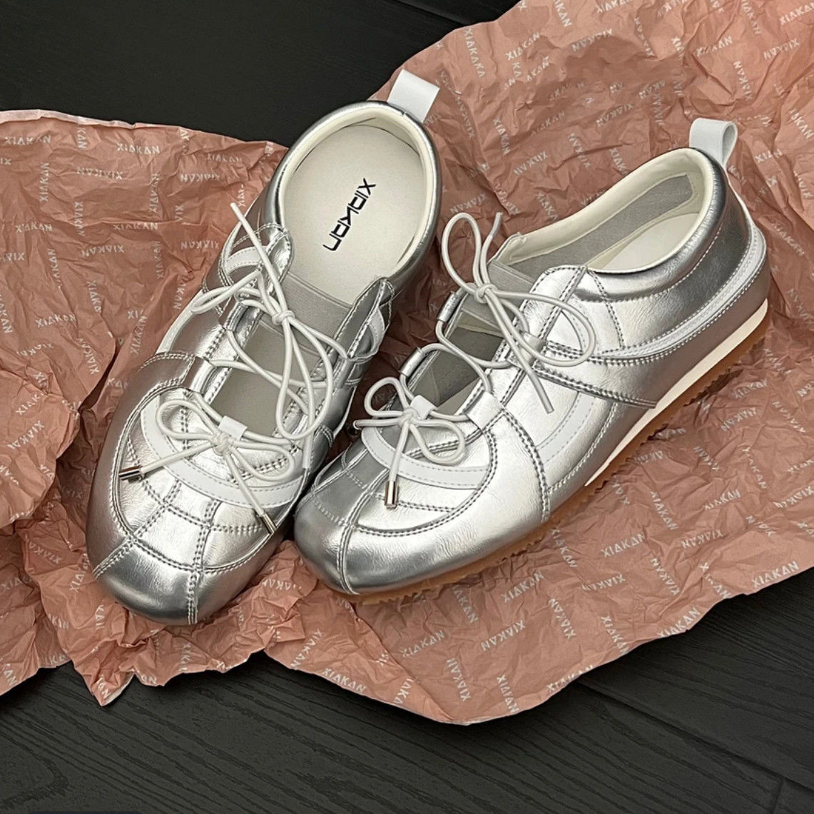 여성 인터넷 연예인과 같은 스타일을위한 실버 발레 슈즈 2025 여름 새로운 한국 스타일 나비 넥타이 통기성 경량 로퍼