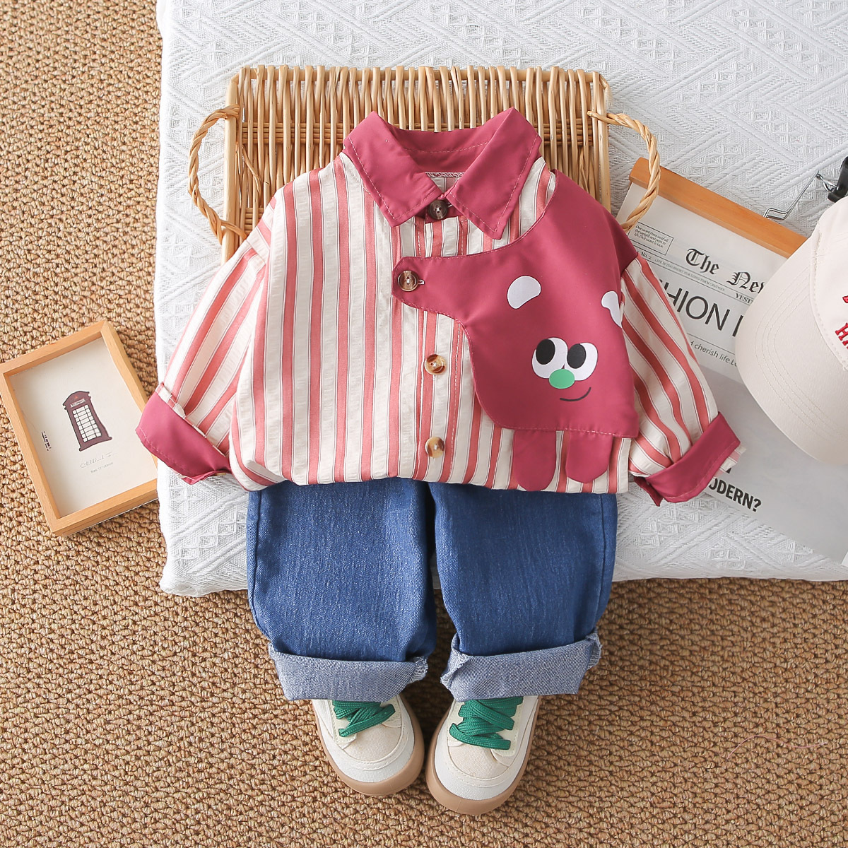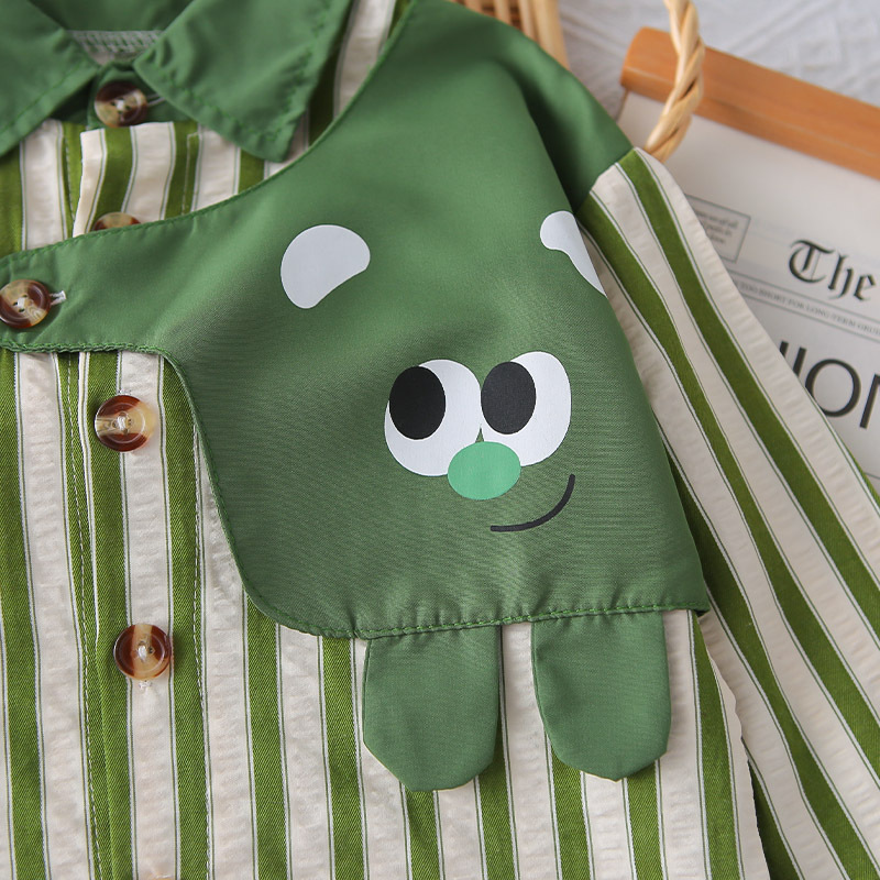 2025 새로운 가을 어린이 옷깃 세로 스트립 셔츠 긴팔 양복 아기 소년 캐주얼 데님 바지 투피스 세트