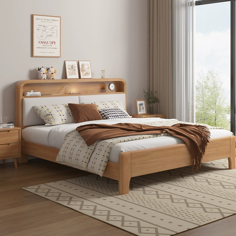 북유럽 단단한 나무 침대 1.8m 마스터 침실 더블 침대 1.5m 조명 USB 현대 간단한 높은 상자 저장 부드러운 가방 침대