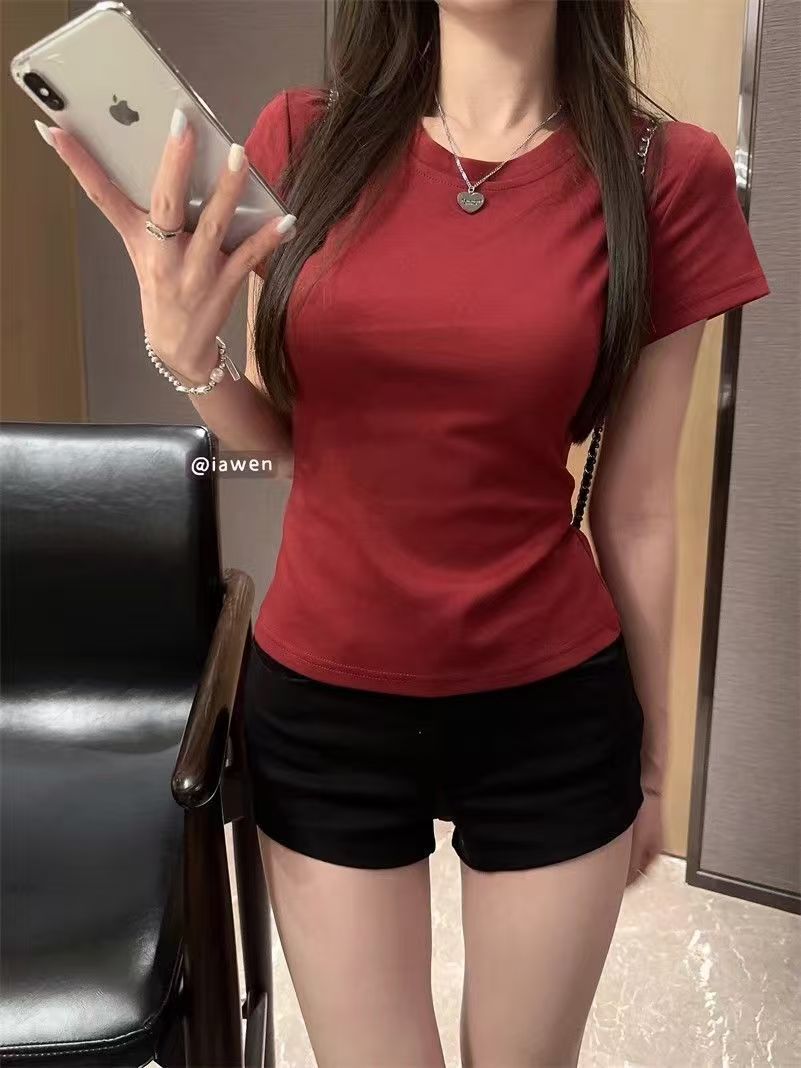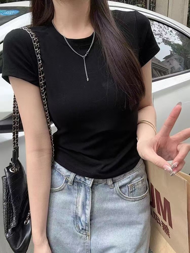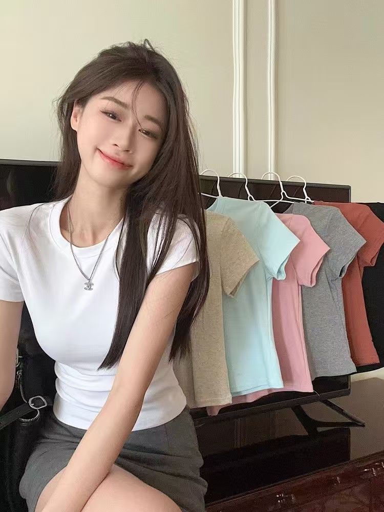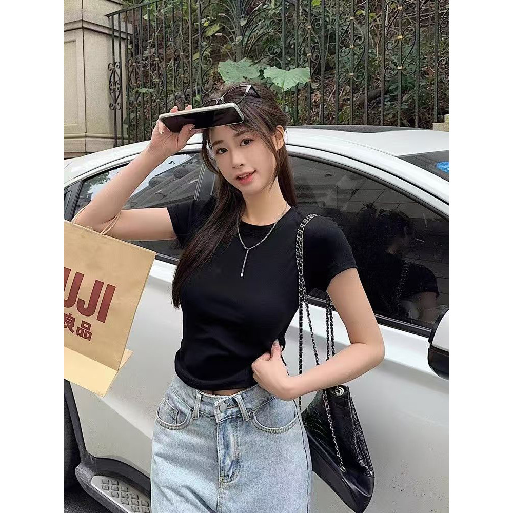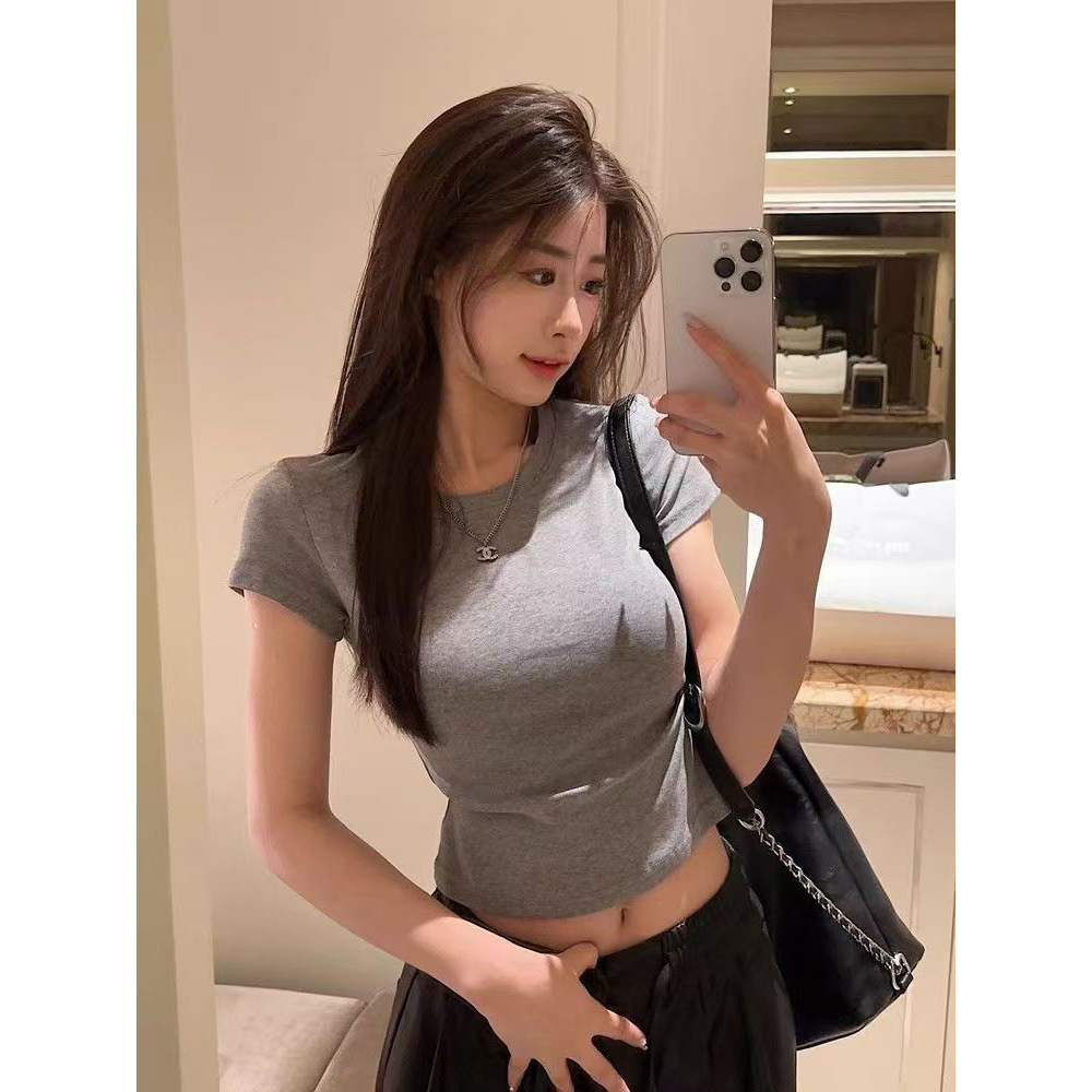 한국 스타일 여성용 슬림핏 반팔 티셔츠 2026 여름 허리라인을 강조한 짧은 단색 여성용 ins 스타일 상의 패셔너블하고 다재다능함스토어 가기