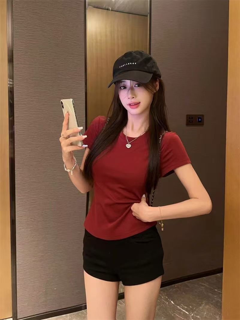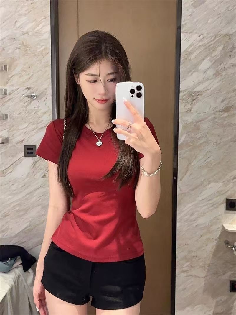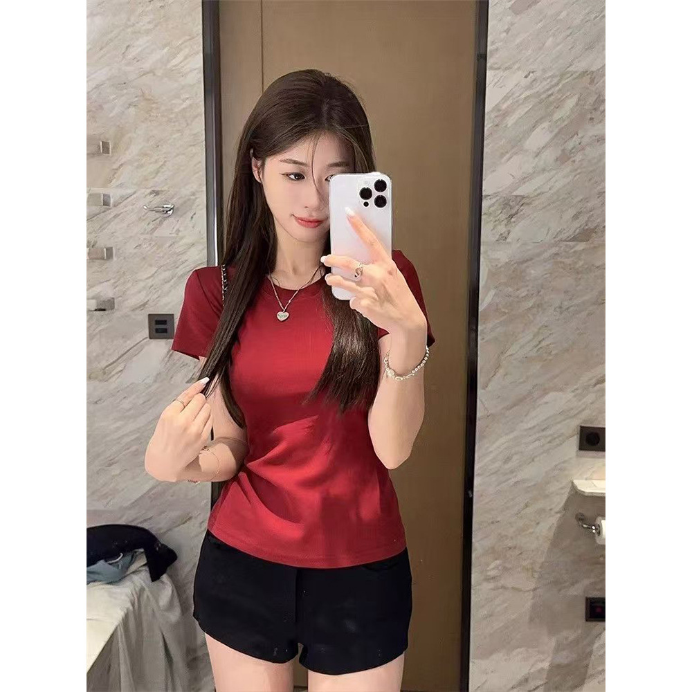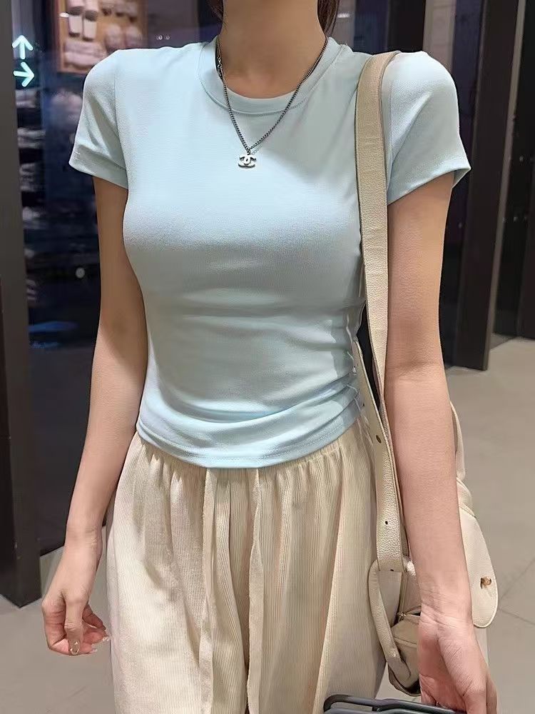 한국 스타일 여성용 슬림핏 반팔 티셔츠 2026 여름 허리라인을 강조한 짧은 단색 여성용 ins 스타일 상의 패셔너블하고 다재다능함
