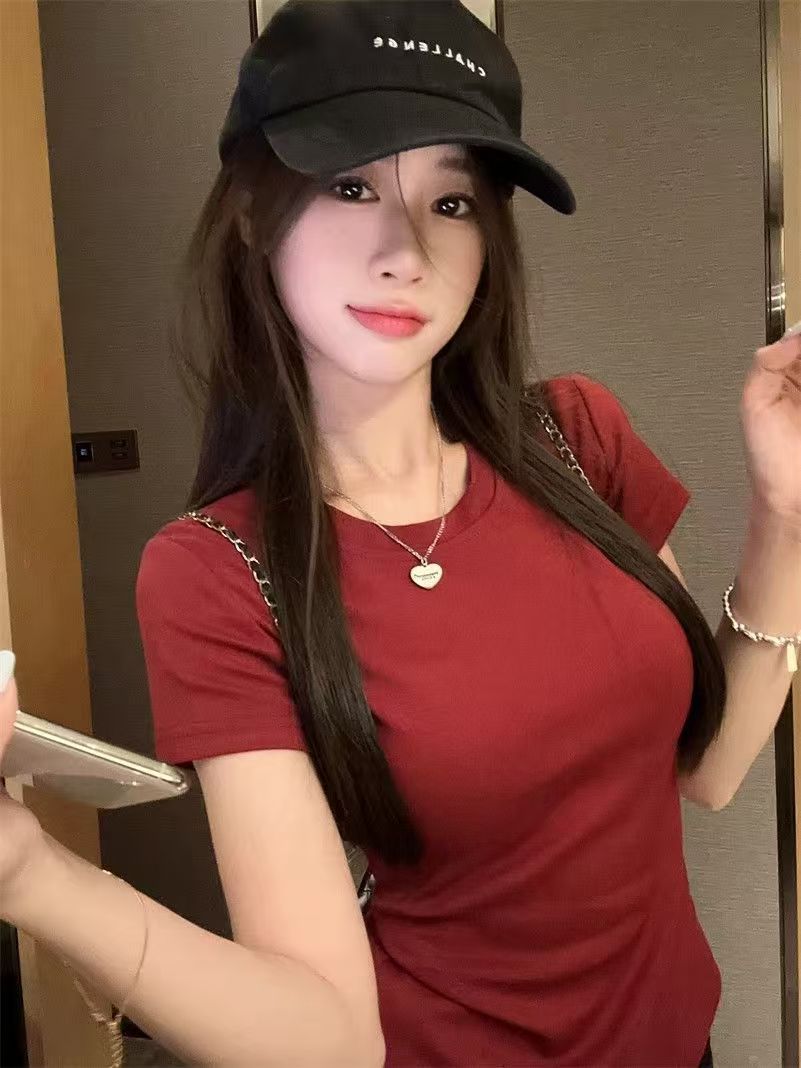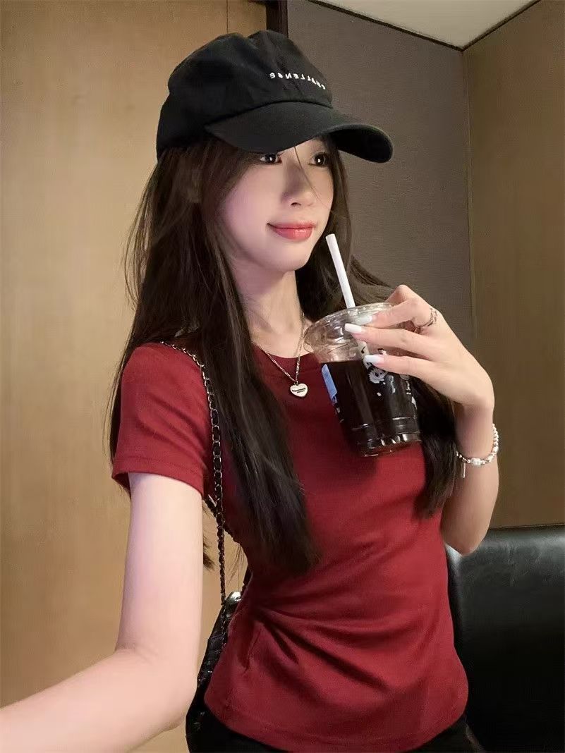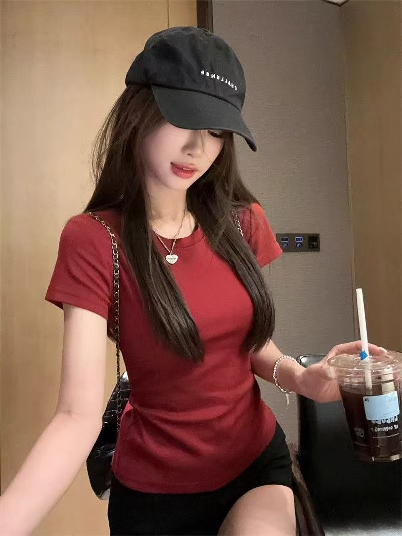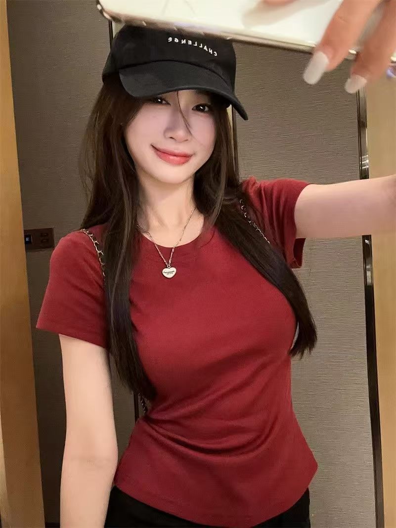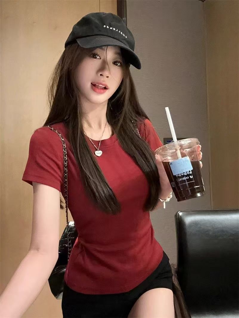 한국 스타일 여성용 슬림핏 반팔 티셔츠 2026 여름 허리라인을 강조한 짧은 단색 여성용 ins 스타일 상의 패셔너블하고 다재다능함