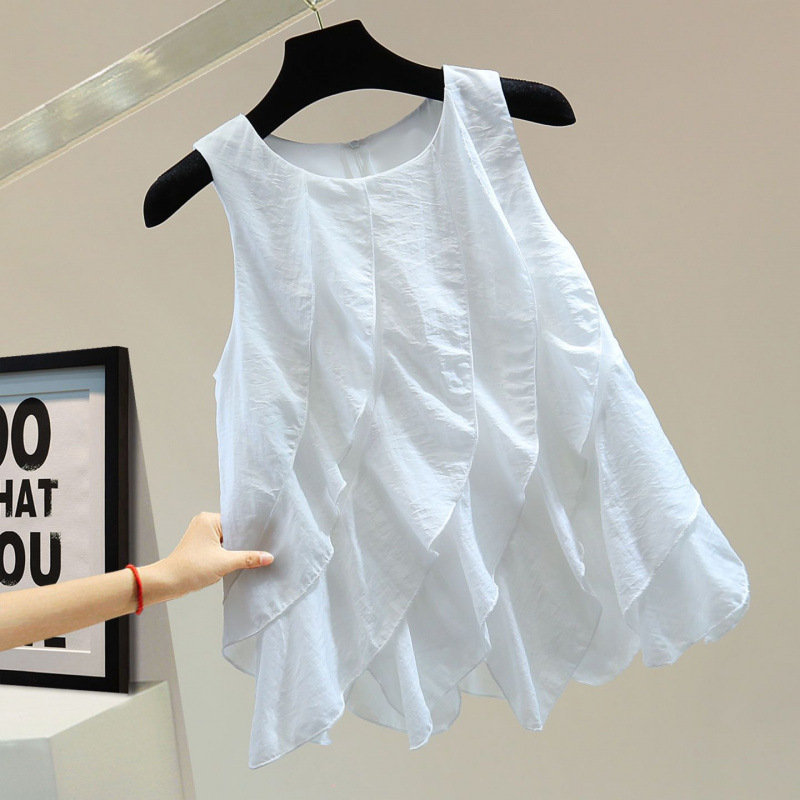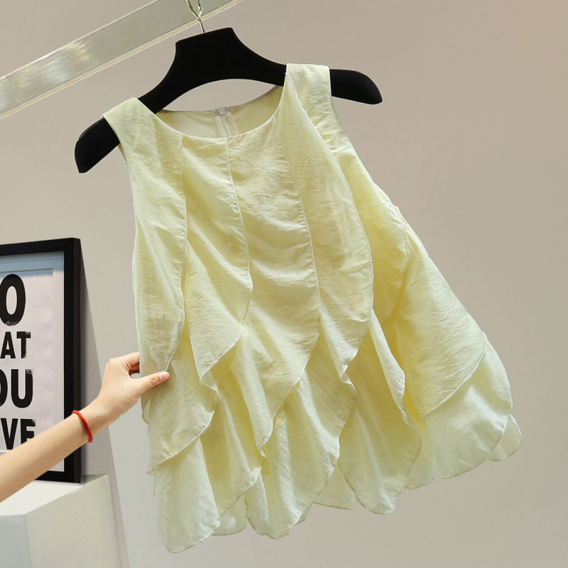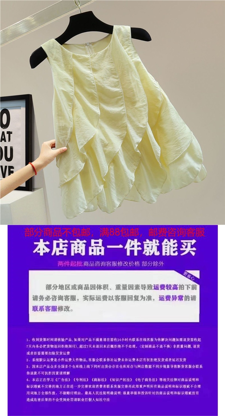 여자 여름 의류 프릴 스플 라이스 라운드 넥 풀오버 셔츠 2025 여름 새로운 스타일 중대형 어린이 쉬폰 조끼 유행스토어 가기