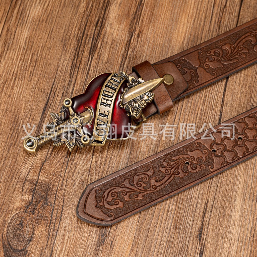 크로스보더 레트로 원세이브 하트 패널 버클 장식 벨트 벨트 데님 유럽과 미국의 스트리트 PU 가죽 엠보싱 벨트