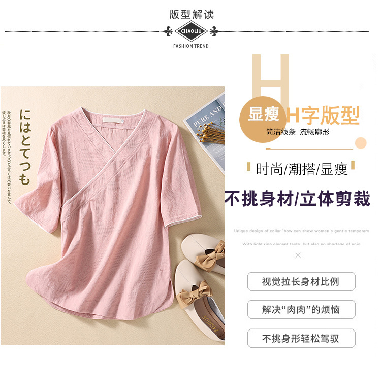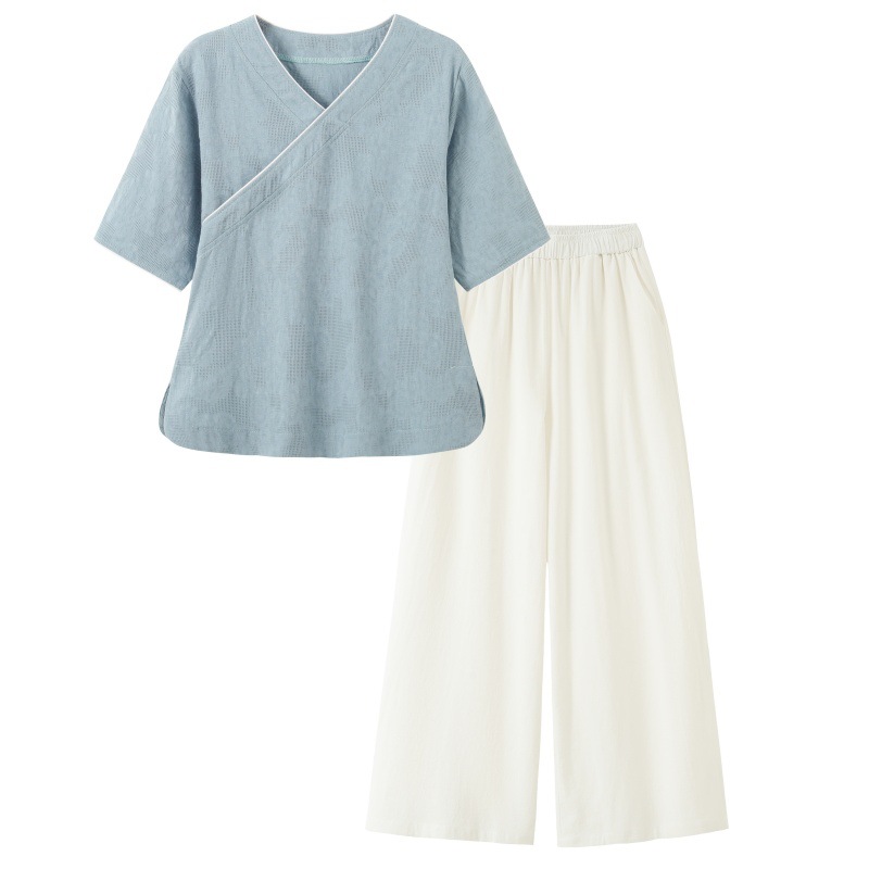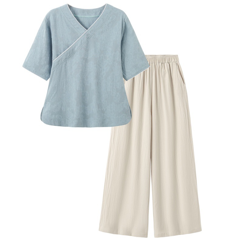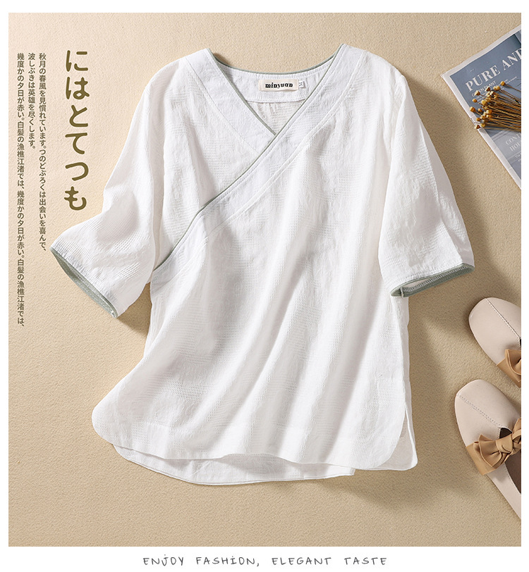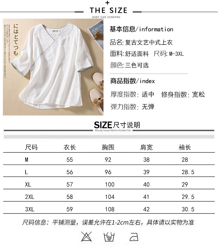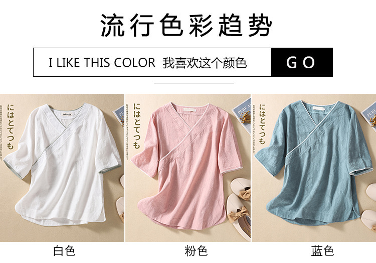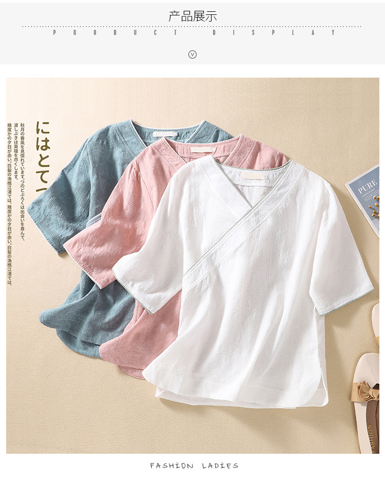 여름 새로운 중국 스타일 여성 의류 예술적 복고풍 코튼 린넨 v 넥 반팔 탑 캐주얼 선 스님 차 정장 세트스토어 가기