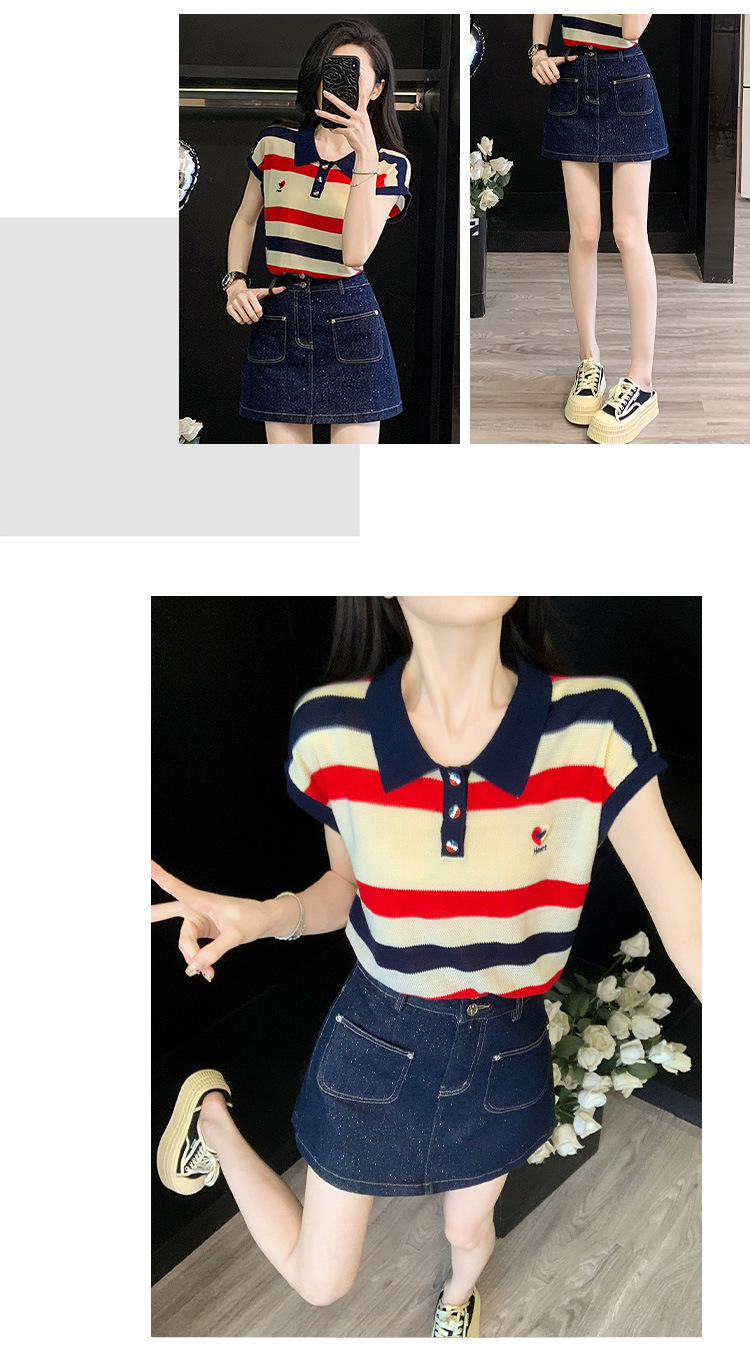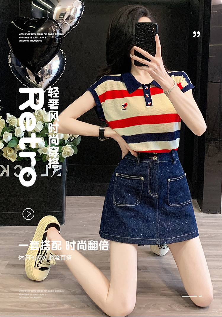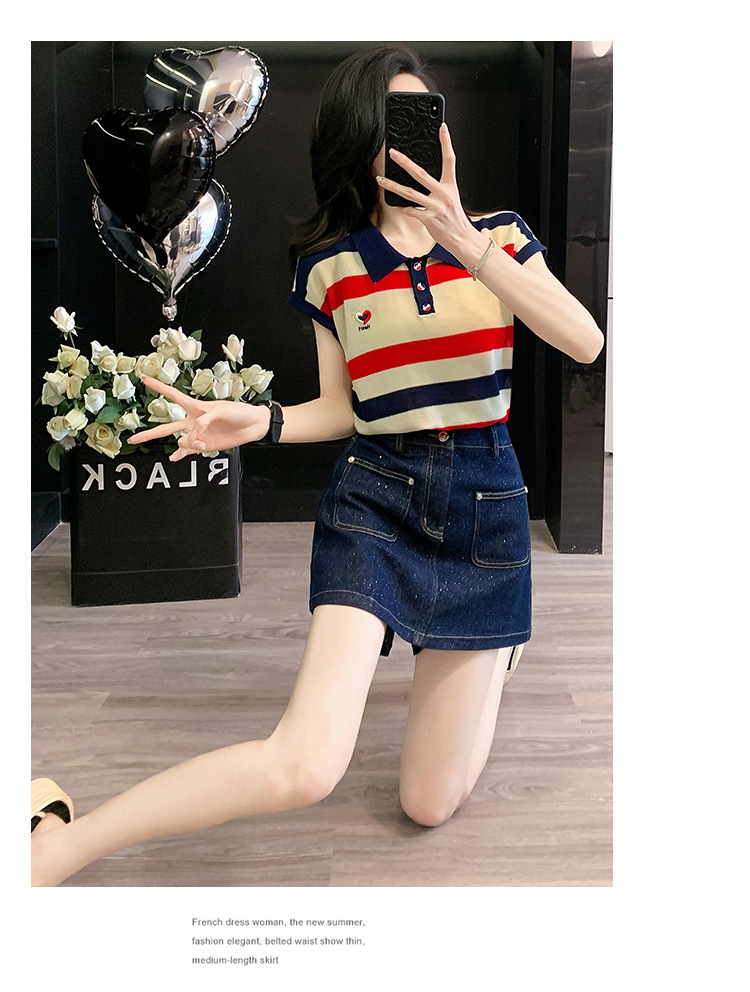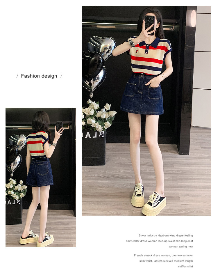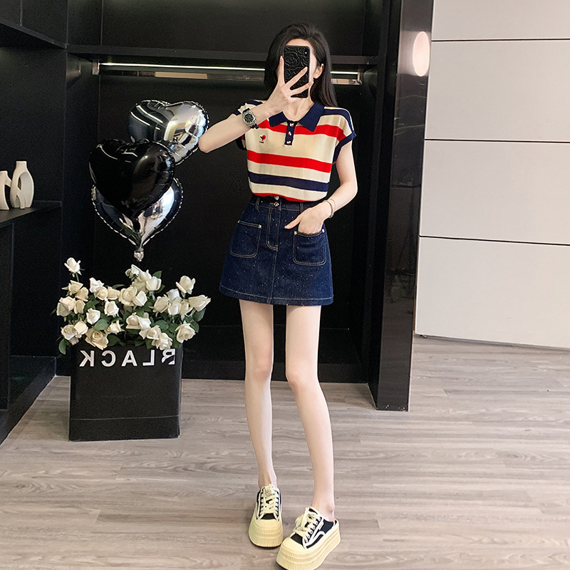 여성용 패셔너블 슈트, 패셔너블한 반팔 스트라이프 니트 탑, 하이웨이스트 슬림 데님 스커트 팬츠, 여름용 투피스 세트스토어 가기