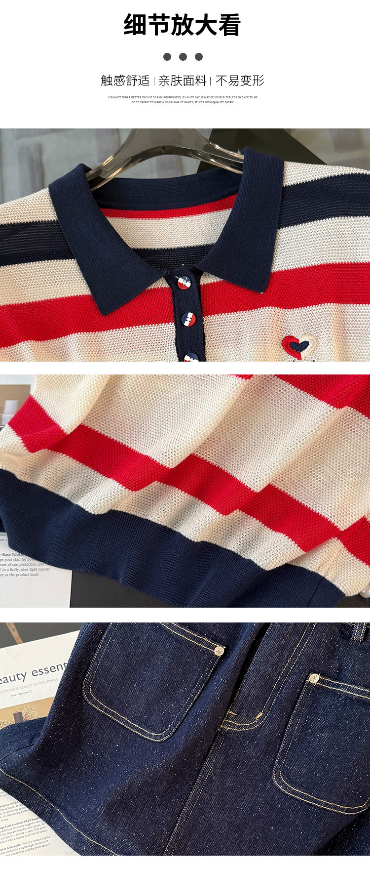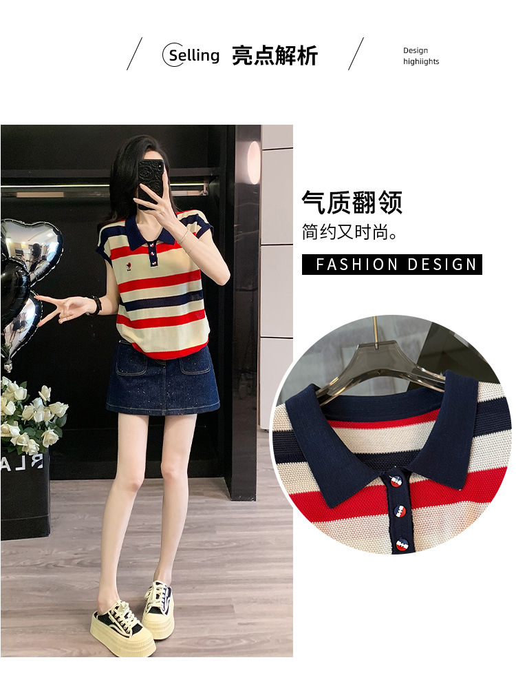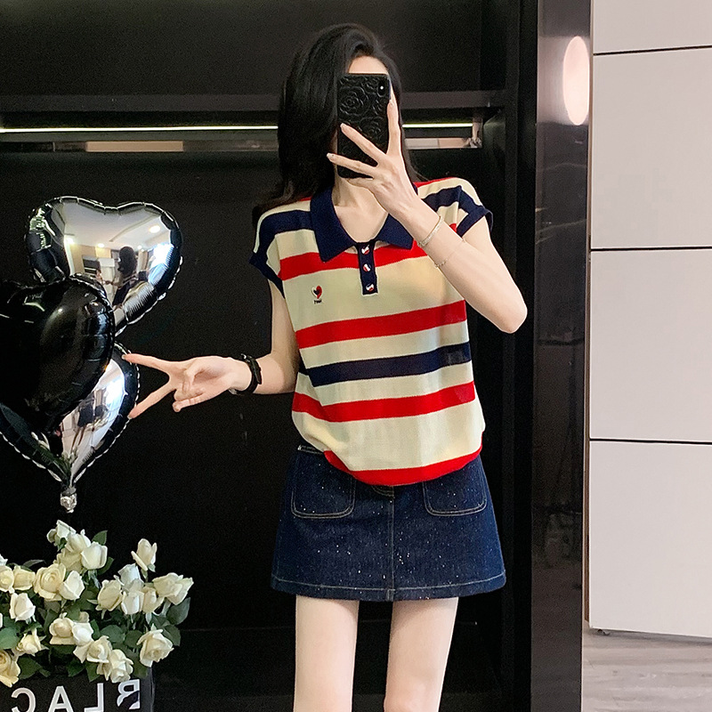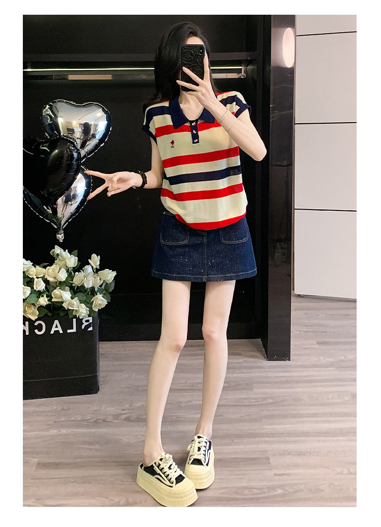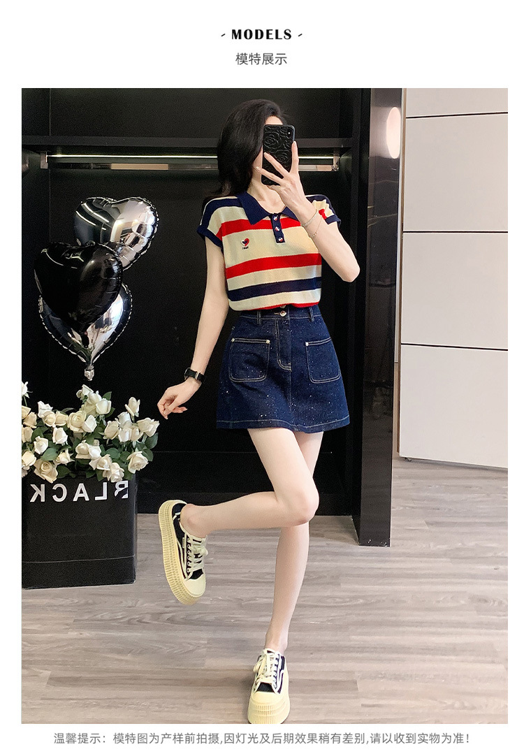 여성용 패셔너블 슈트, 패셔너블한 반팔 스트라이프 니트 탑, 하이웨이스트 슬림 데님 스커트 팬츠, 여름용 투피스 세트스토어 가기