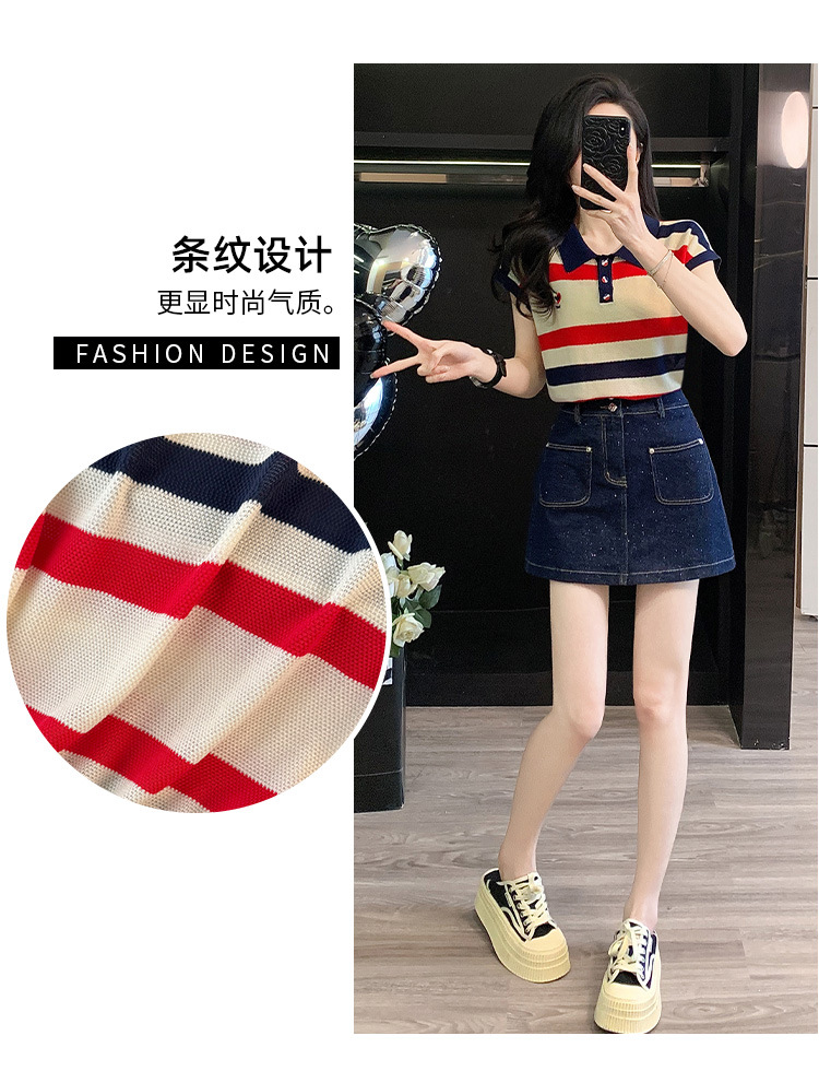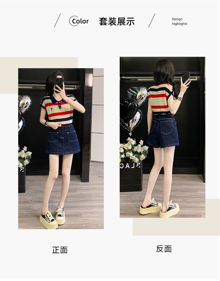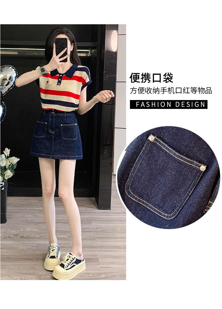 여성용 패셔너블 슈트, 패셔너블한 반팔 스트라이프 니트 탑, 하이웨이스트 슬림 데님 스커트 팬츠, 여름용 투피스 세트