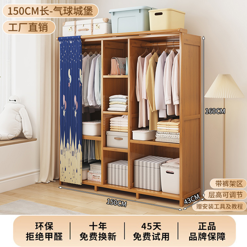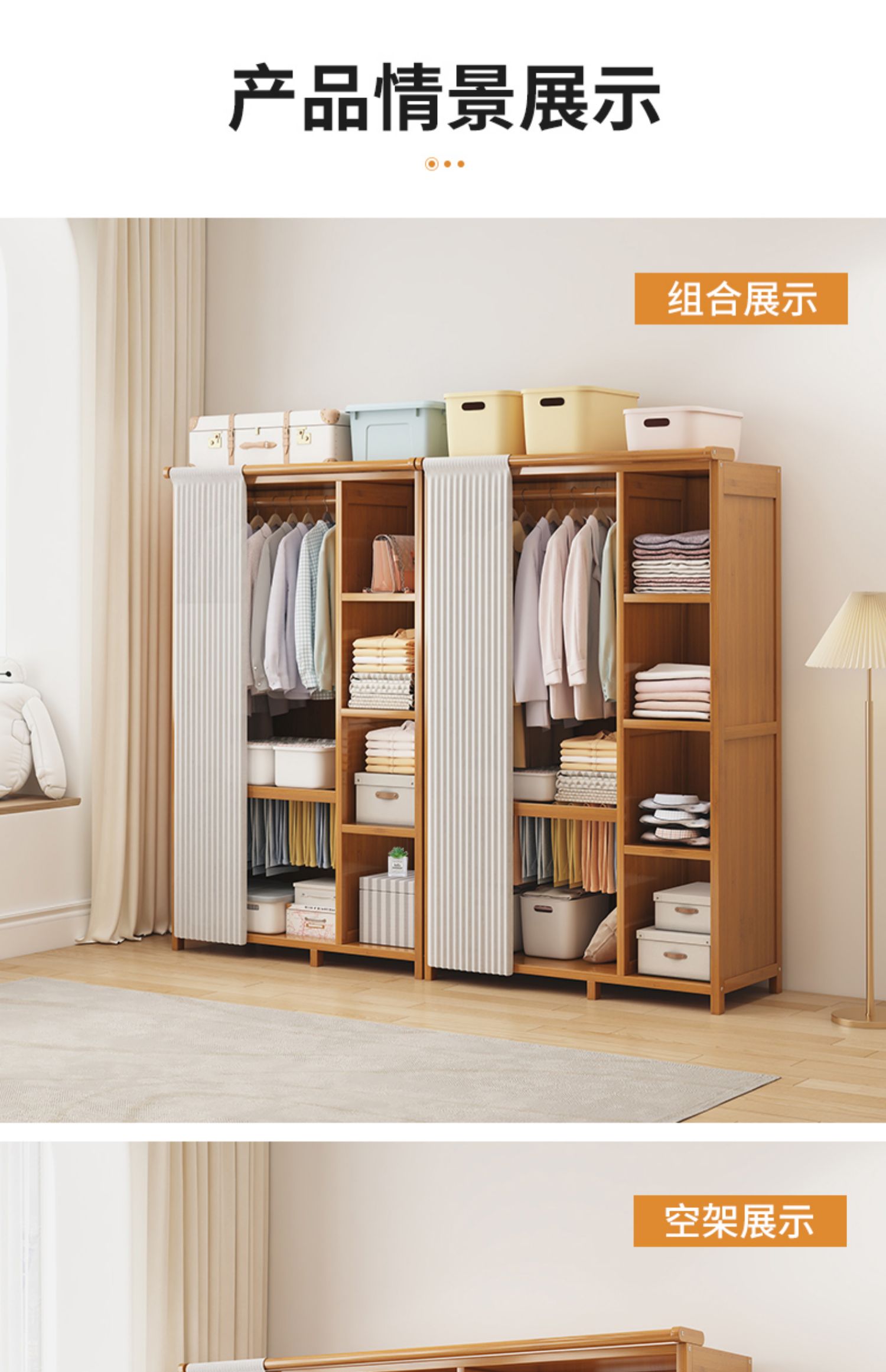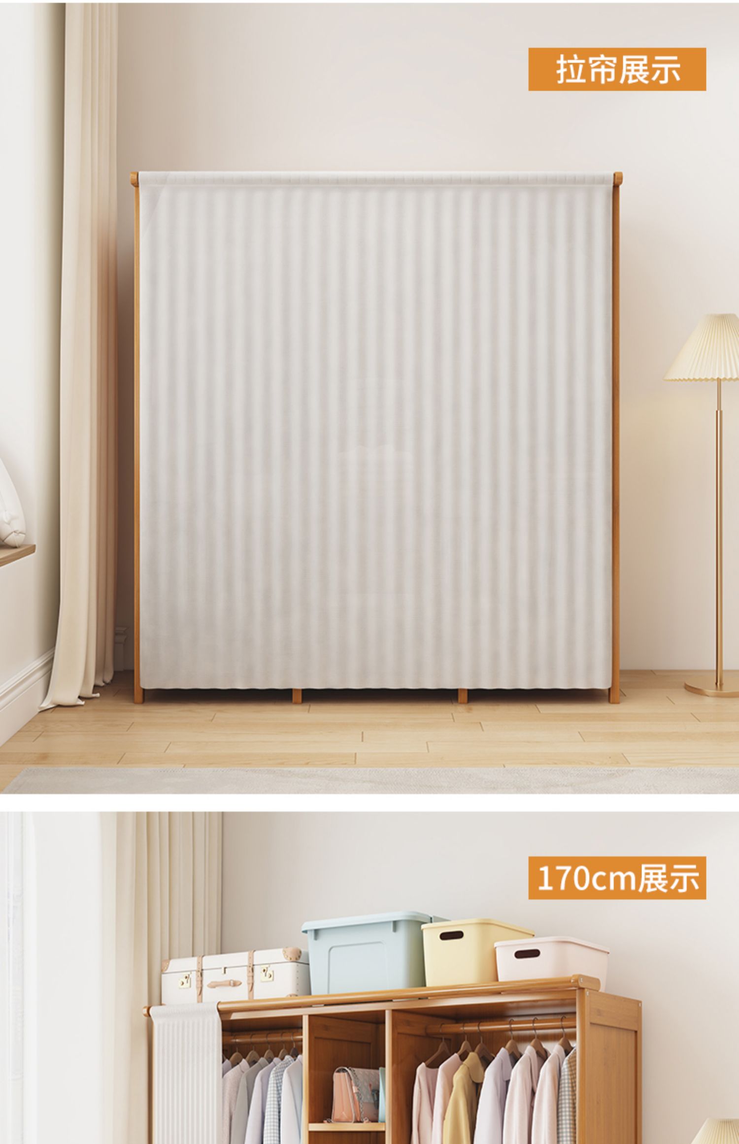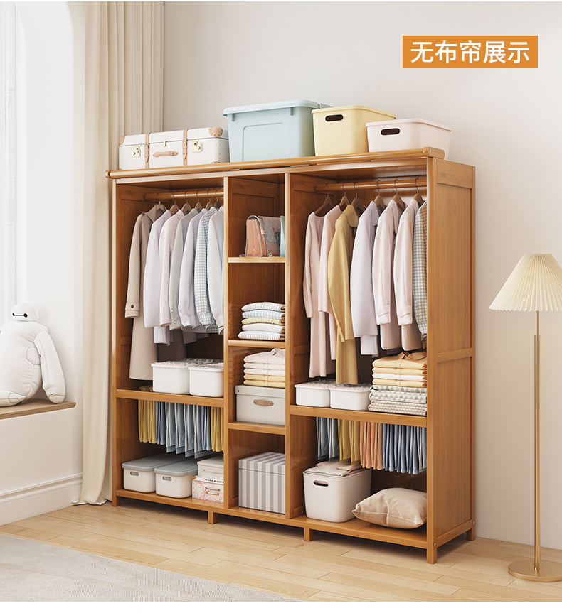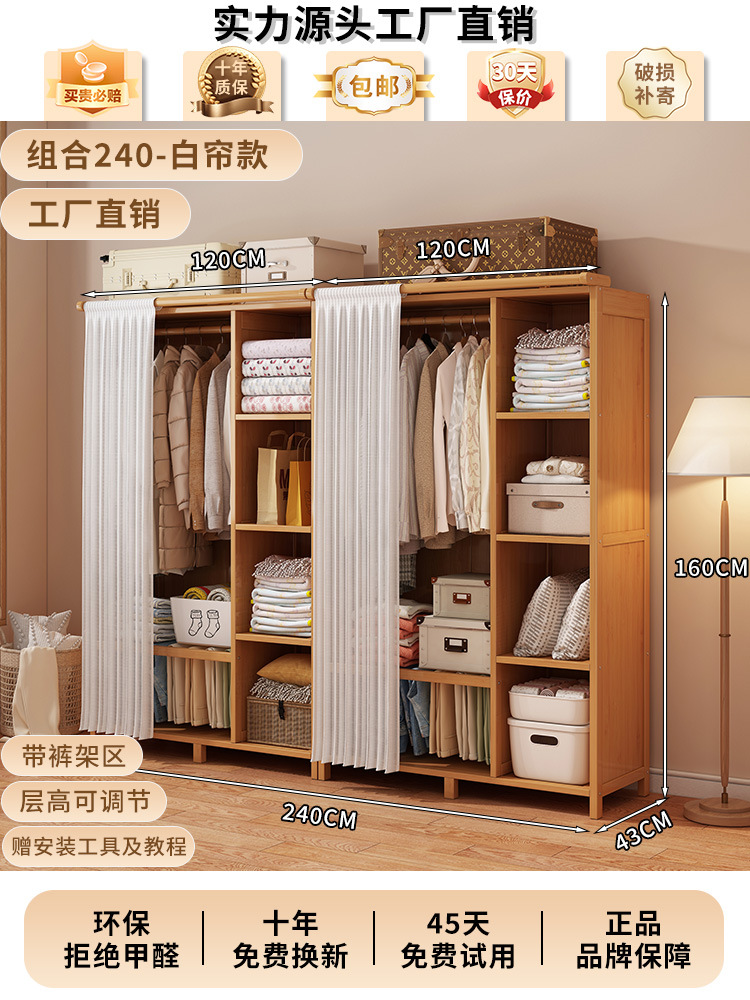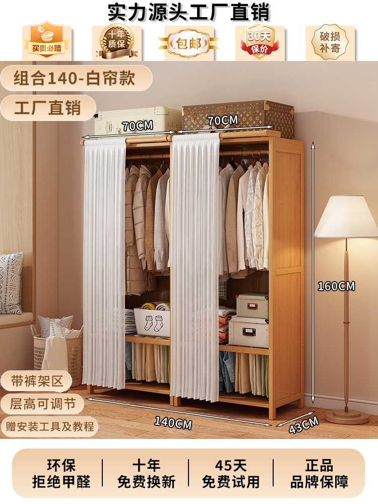 가정용 침실 옷장을 위한 간단한 단단한 나무 옷장 완전히 밀폐된 커튼 천 캐비닛 임대실 조립 두꺼운 코트 랙