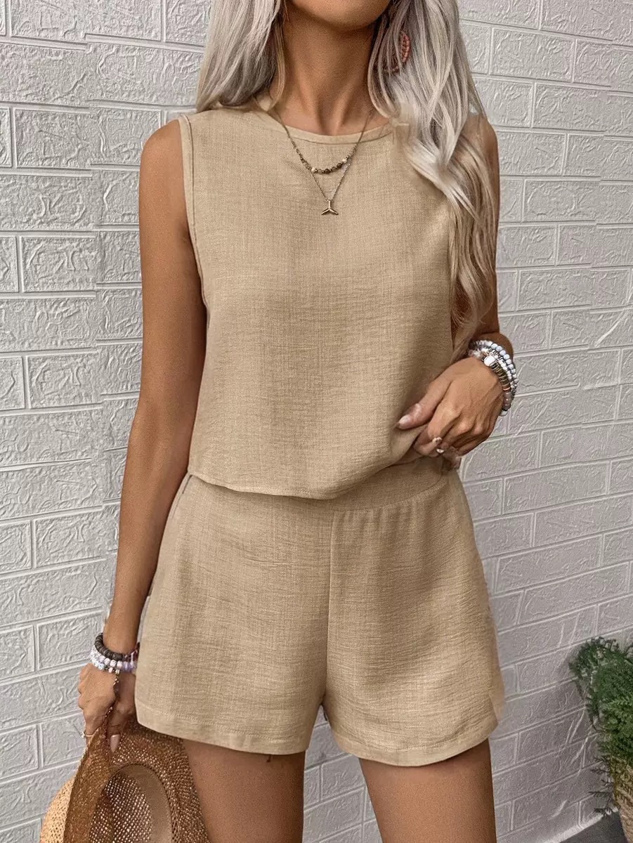 2025 여름 국경 간 핫 스타일 솔리드 컬러 우아한 투피스 라운드 넥 조끼와 와이드 레그 반바지 여성용 세트스토어 가기