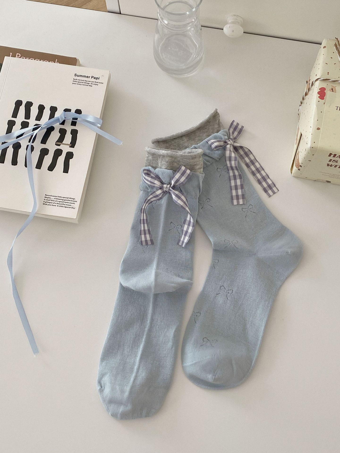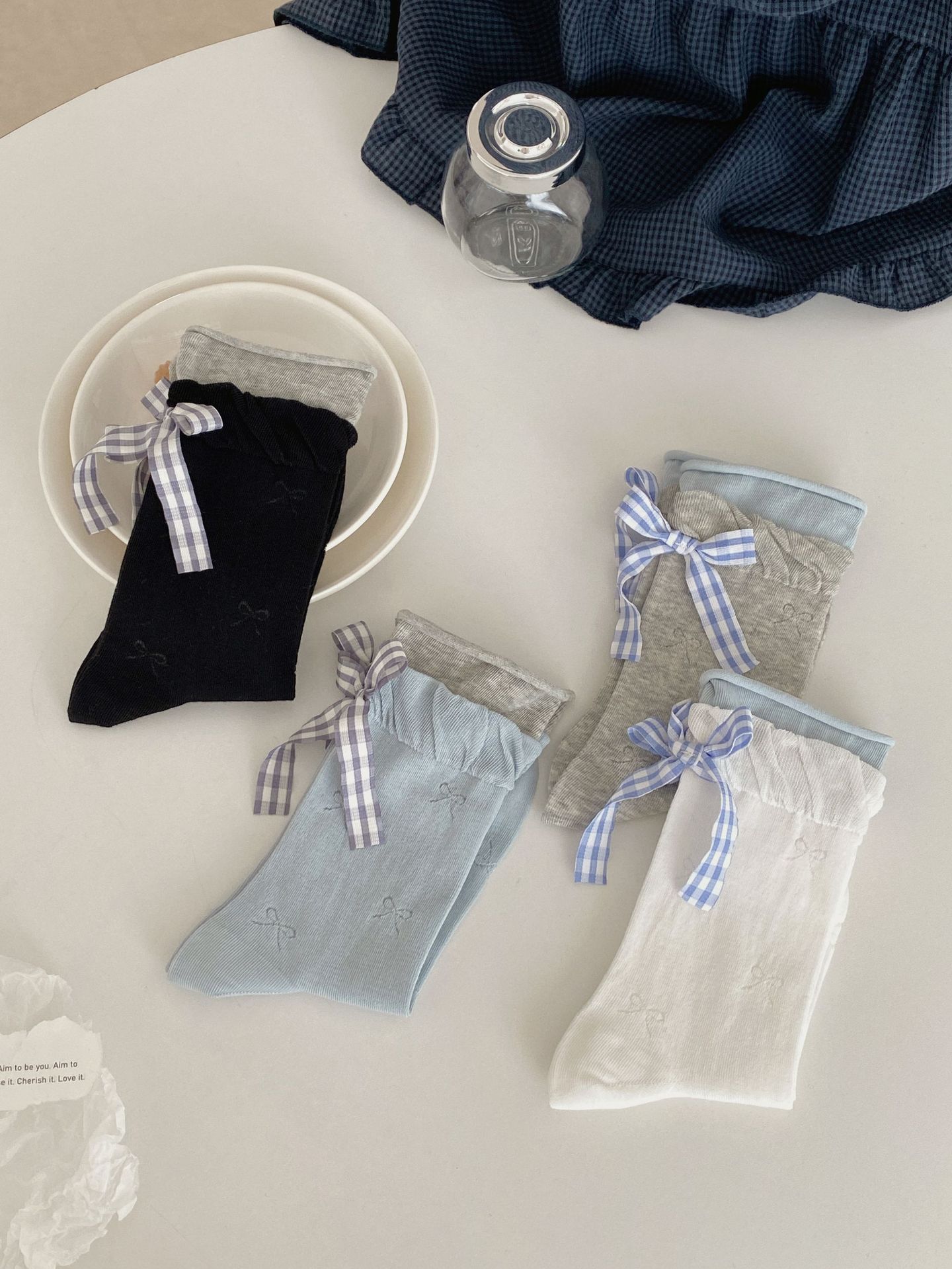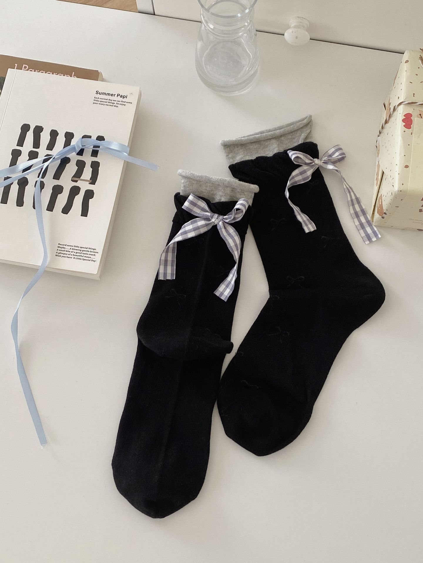양말 여성용 종아리 중간 양말 봄 여름 리본 트렌디 양말 격자 무늬 양말 여성용 로리타 jk 작은 가죽 신발과 여성용 양말