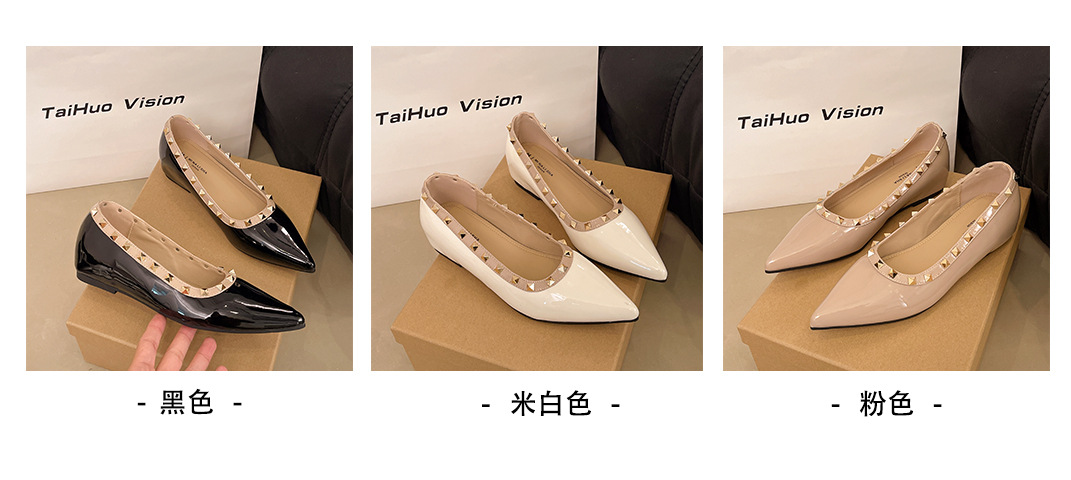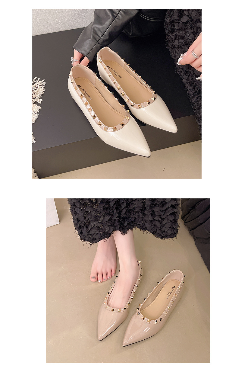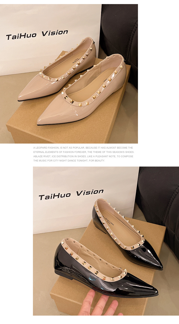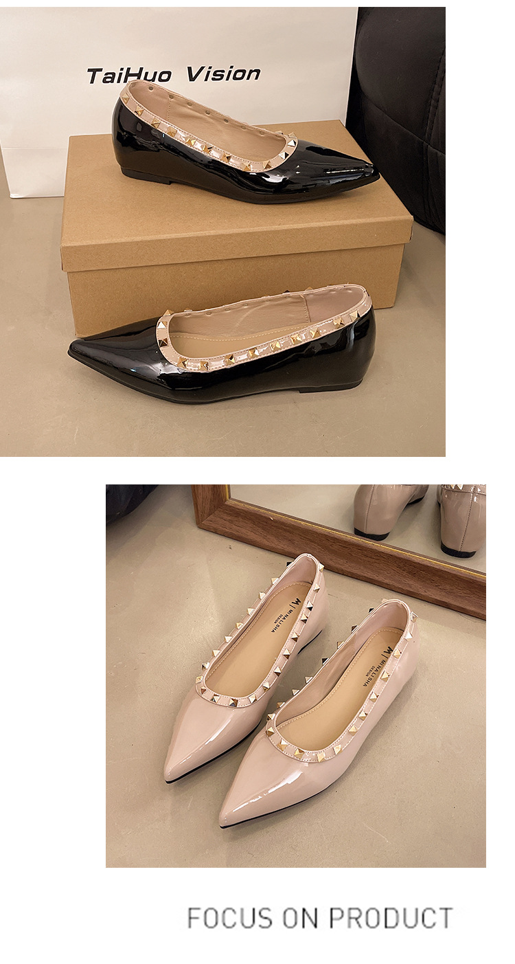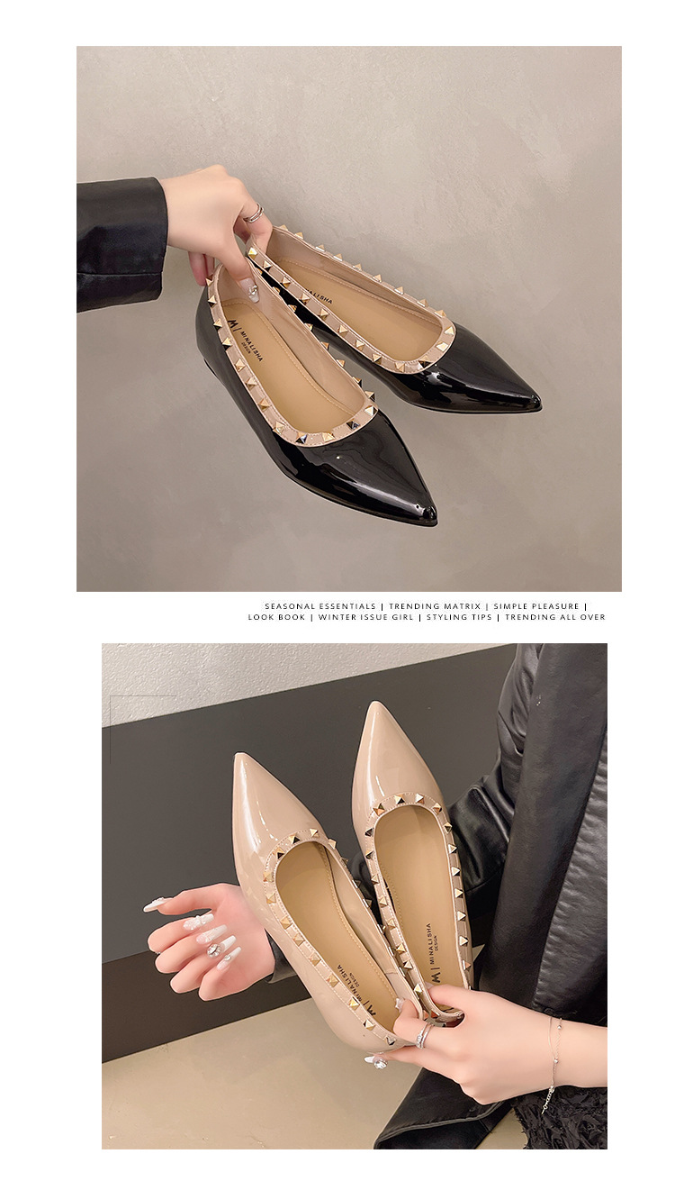 2025년 신상 프렌치 스타일 여성용 뾰족한 구두, 봄, 가을 여성용 리벳 페이턴트 가죽 이브닝 스타일, 부드럽고 부드러운 밑창스토어 가기
