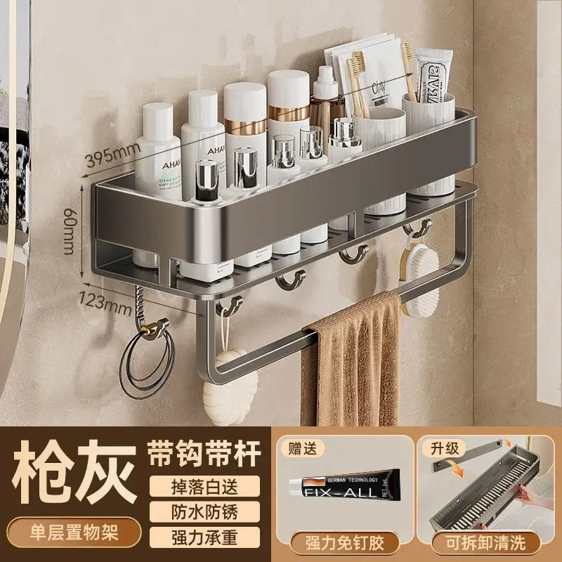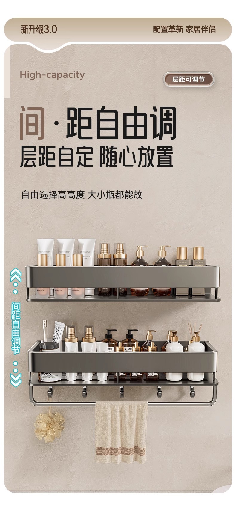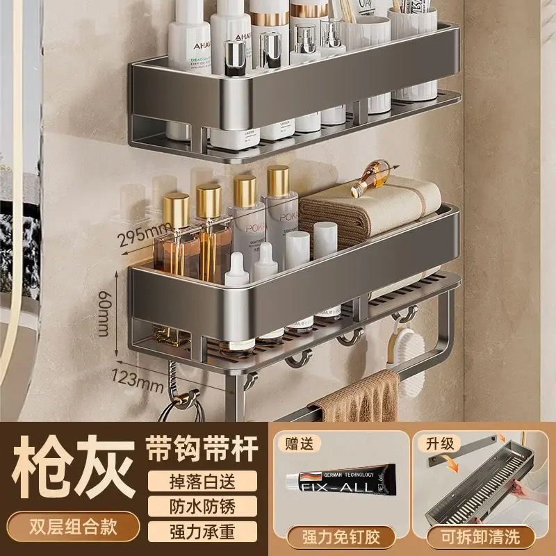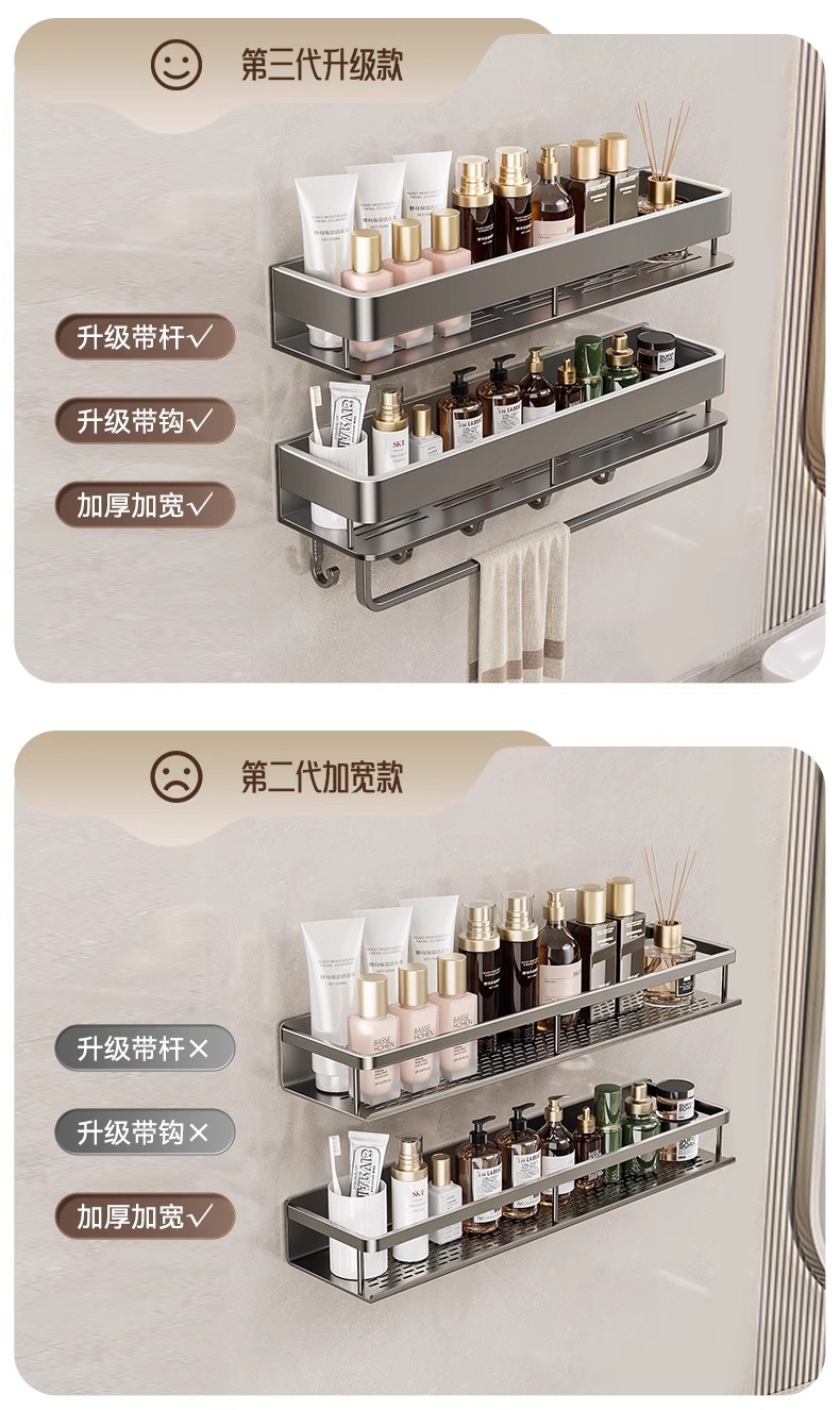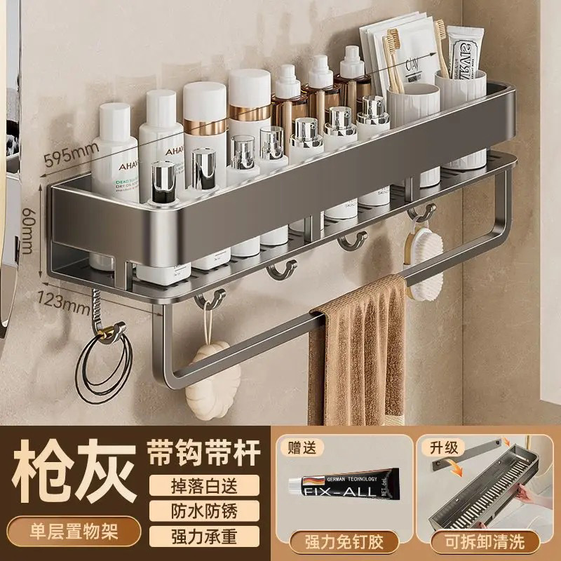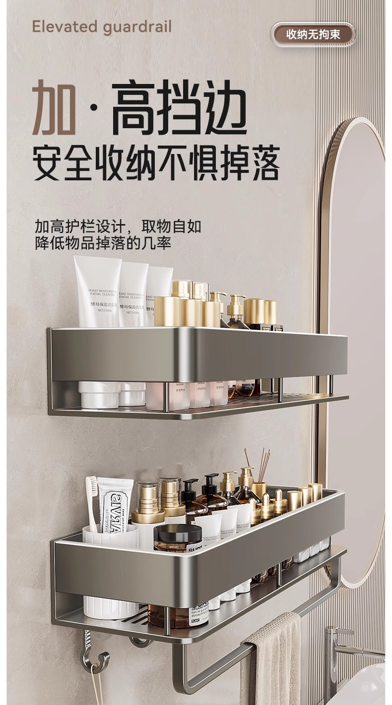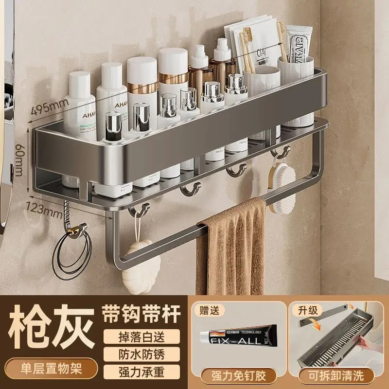 浴室加粗加厚四方篮免打孔墙上置物架可通风沥水挂架带毛巾杆的架子浴室可挂搓澡巾的置物架上下间距可调节置物架加粗加厚方形篮不生锈的浴室收纳神器洗漱用品收纳篮
