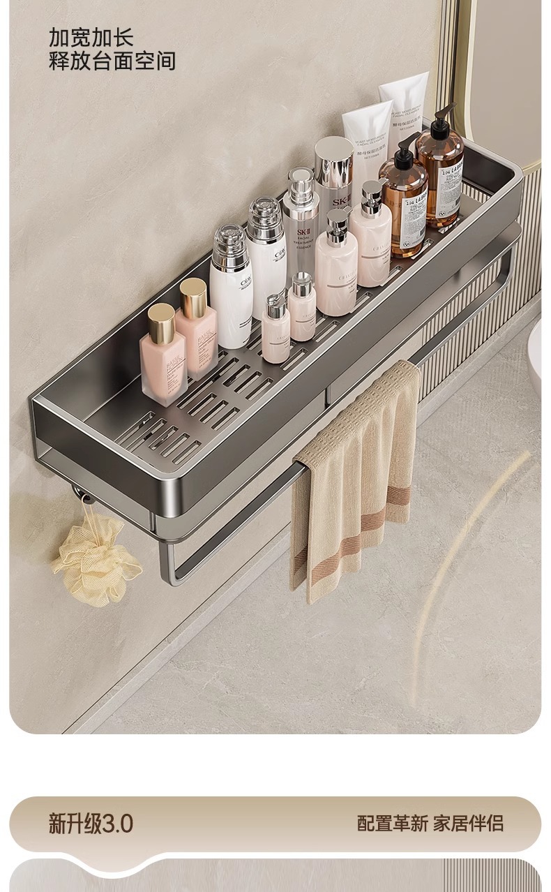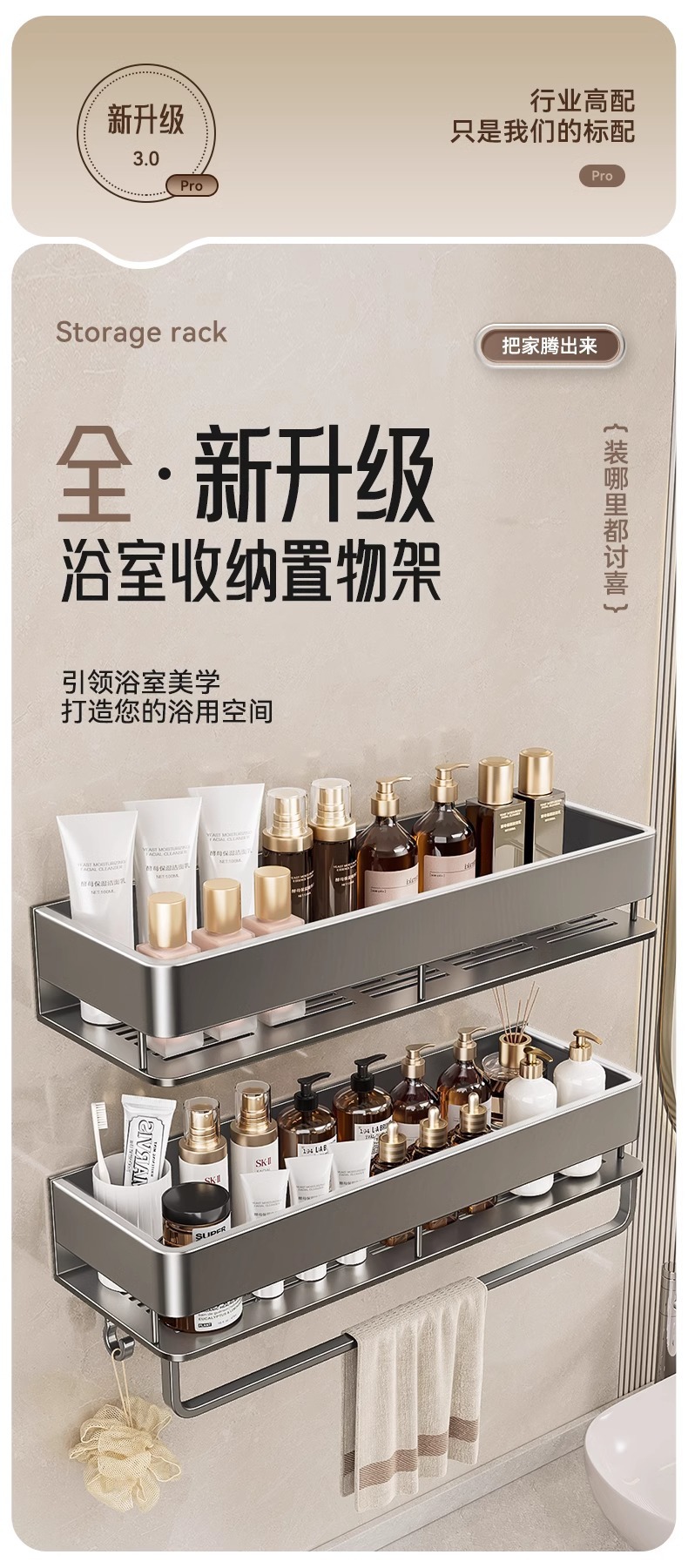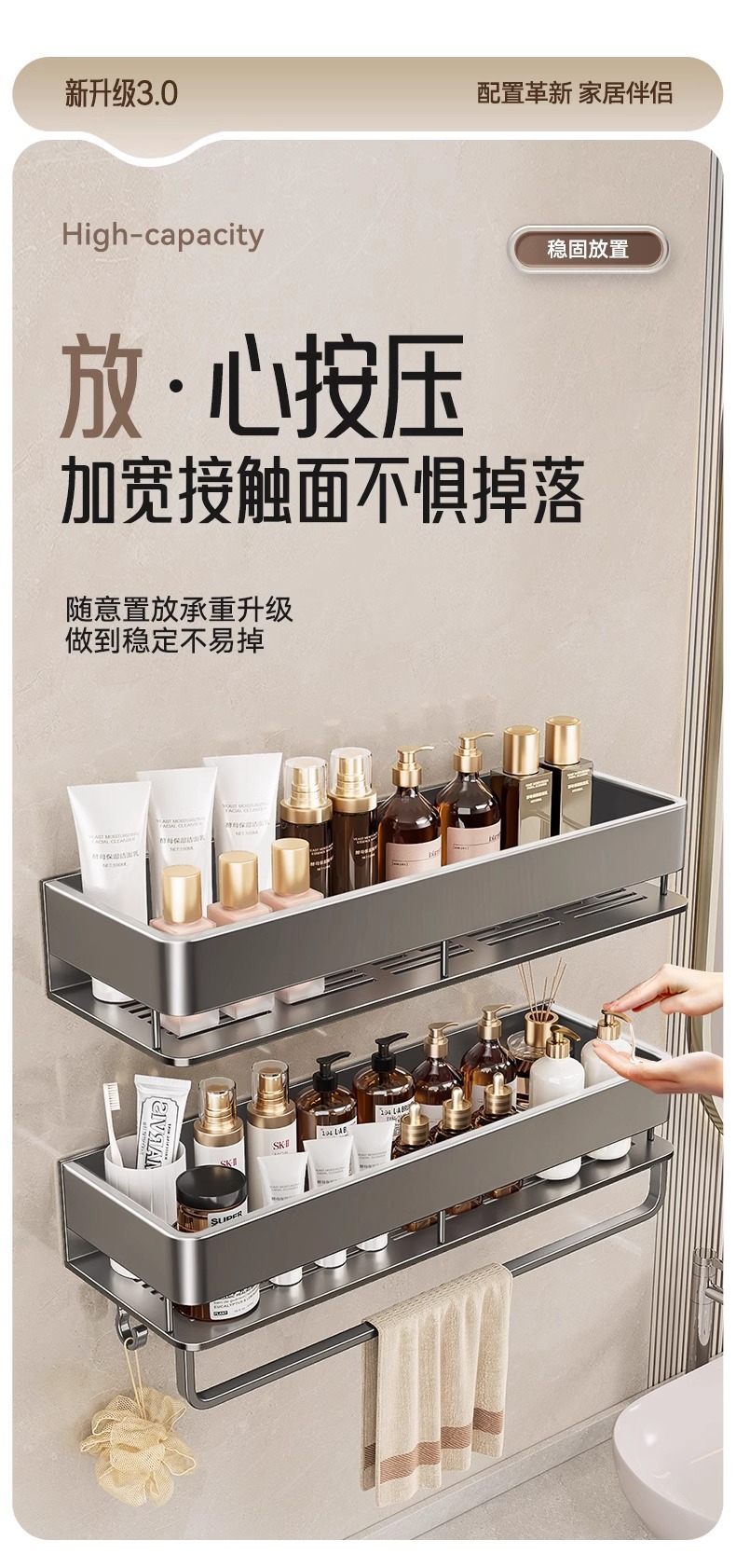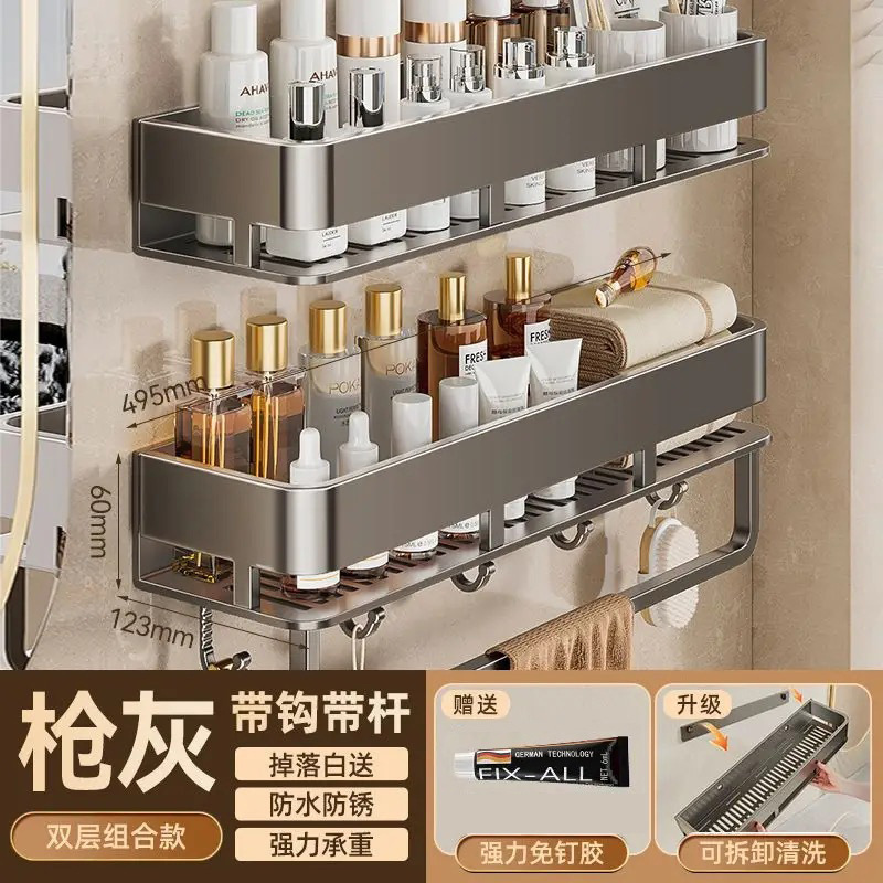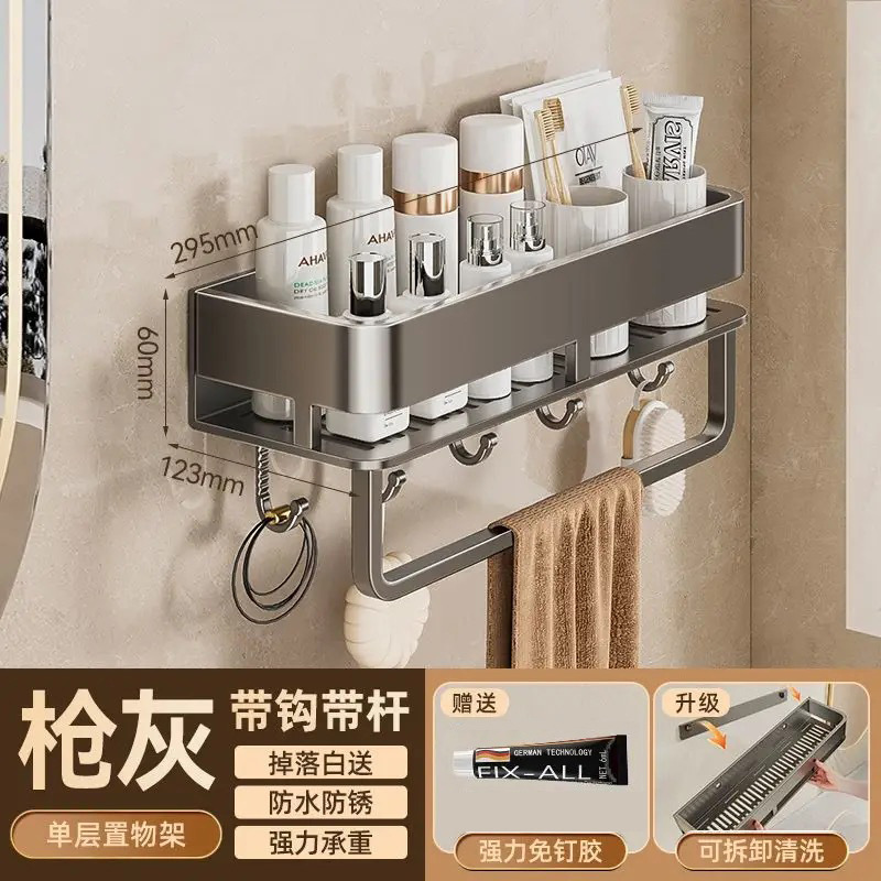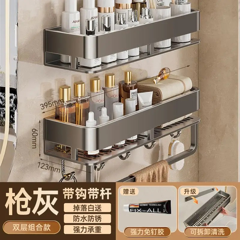 浴室加粗加厚四方篮免打孔墙上置物架可通风沥水挂架带毛巾杆的架子浴室可挂搓澡巾的置物架上下间距可调节置物架加粗加厚方形篮不生锈的浴室收纳神器洗漱用品收纳篮
