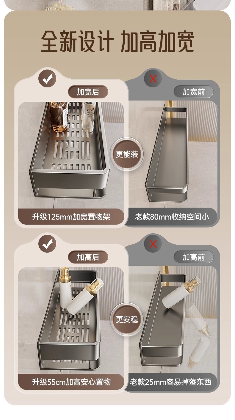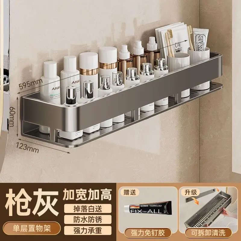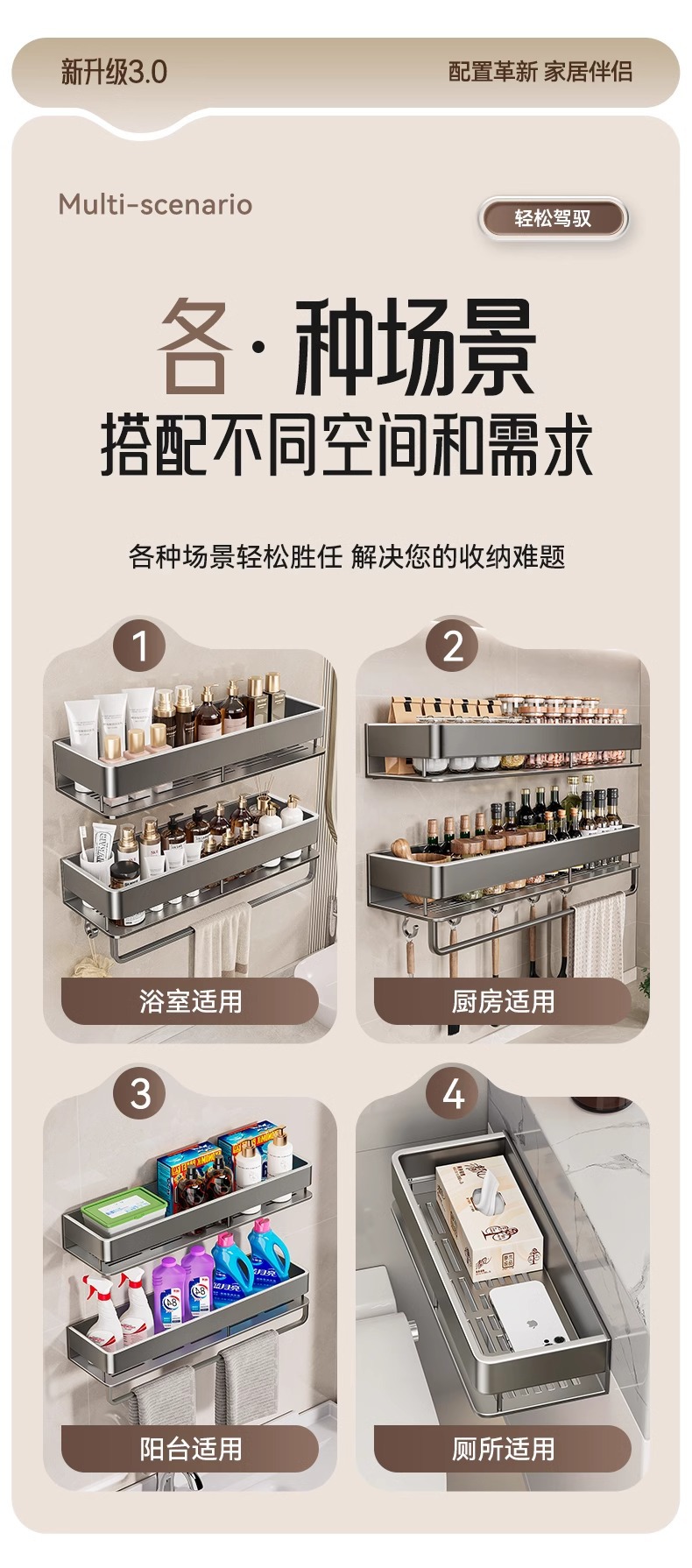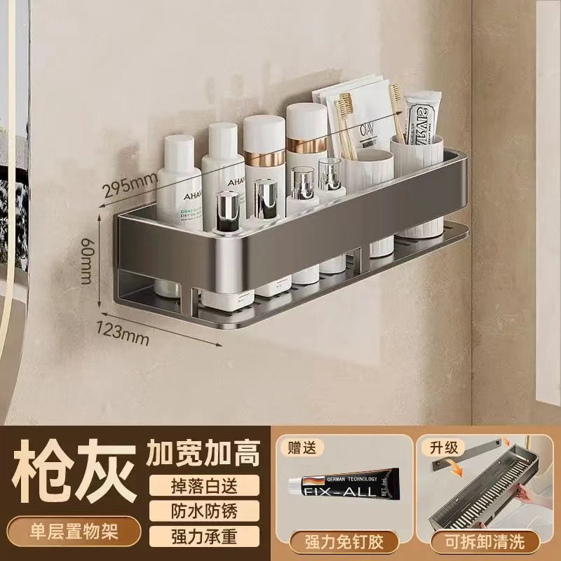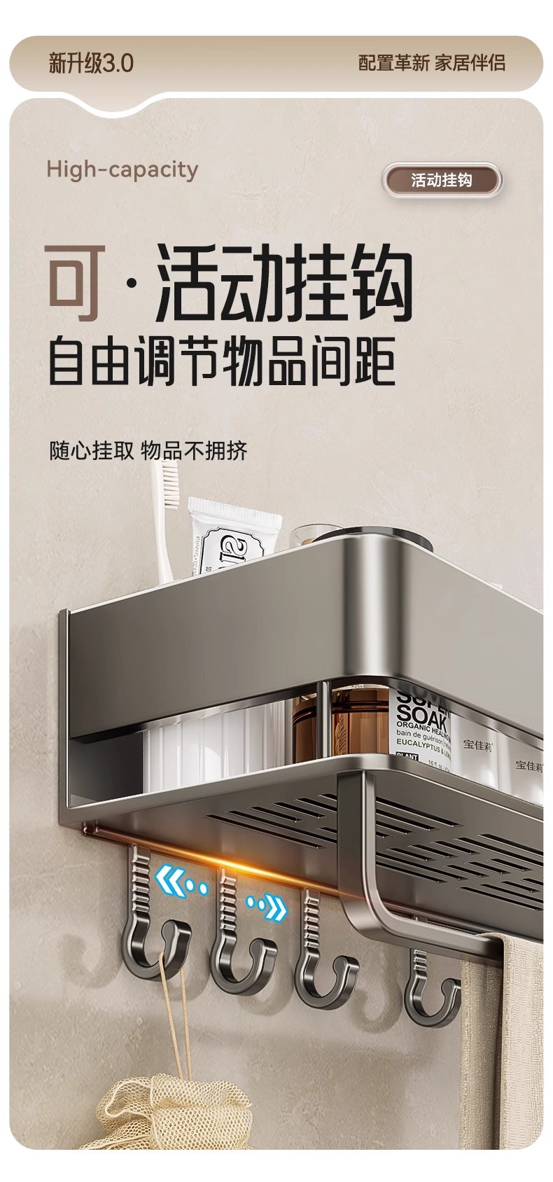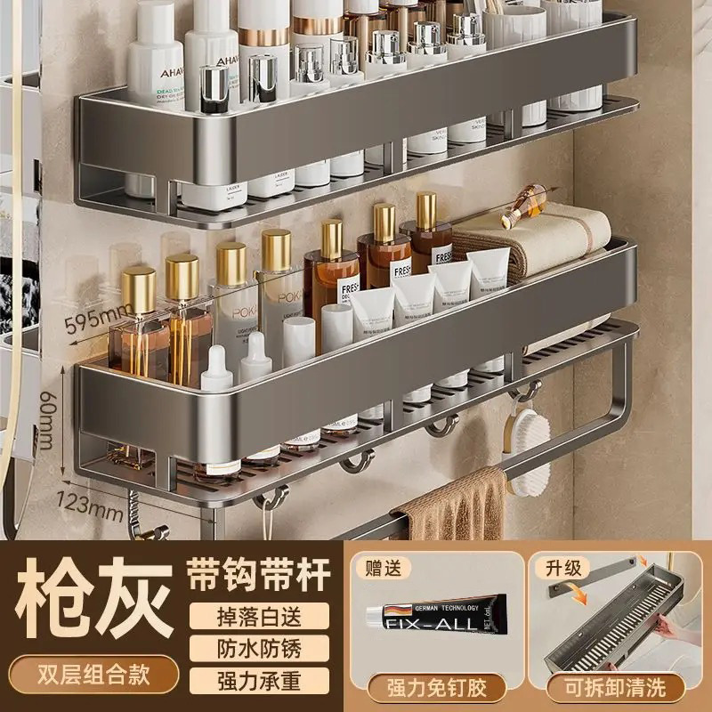 浴室加粗加厚四方篮免打孔墙上置物架可通风沥水挂架带毛巾杆的架子浴室可挂搓澡巾的置物架上下间距可调节置物架加粗加厚方形篮不生锈的浴室收纳神器洗漱用品收纳篮
