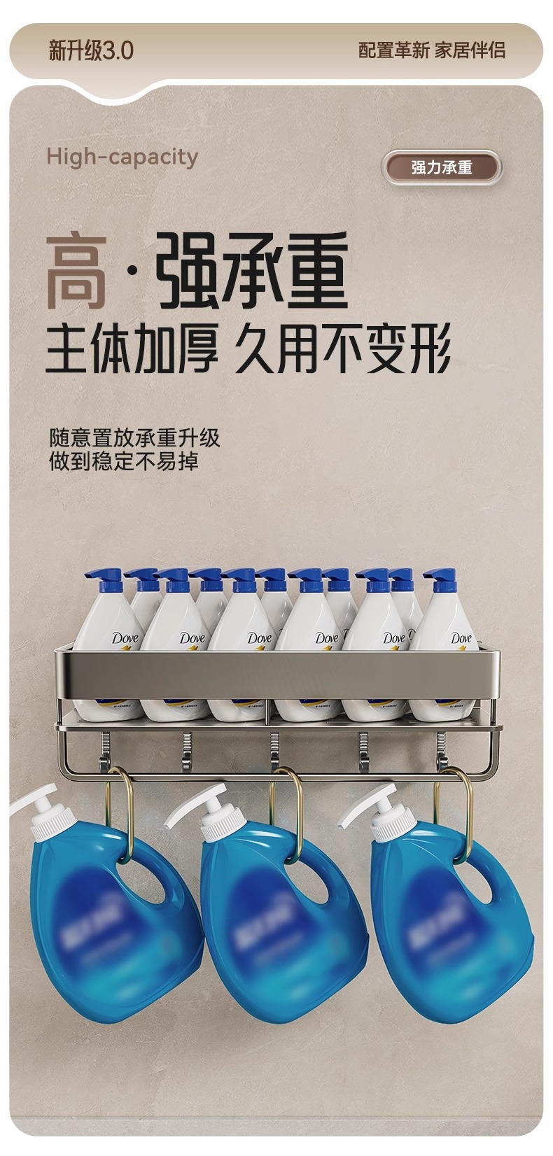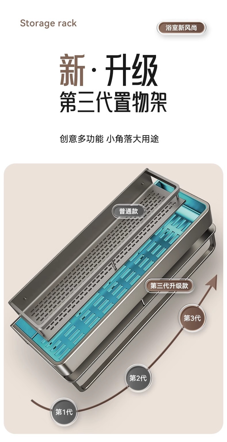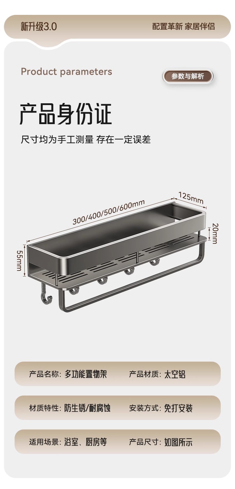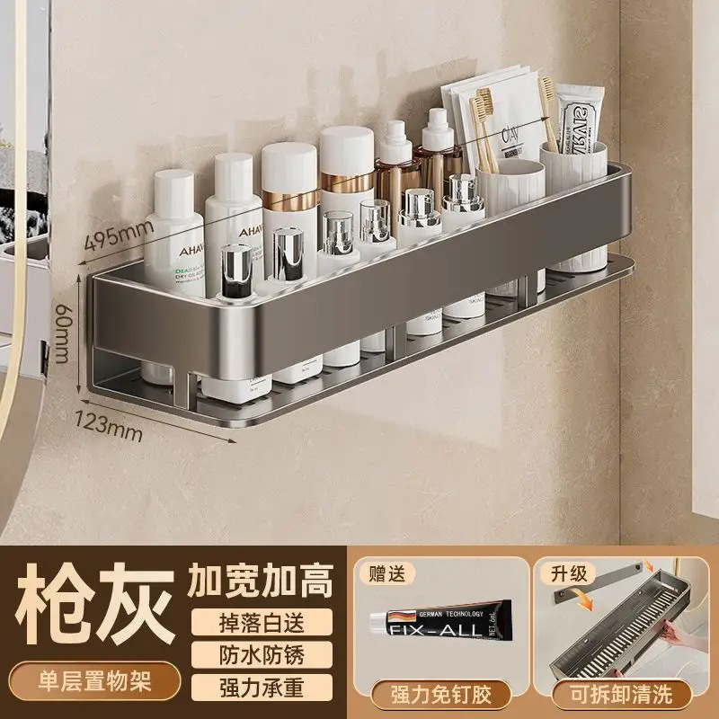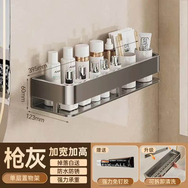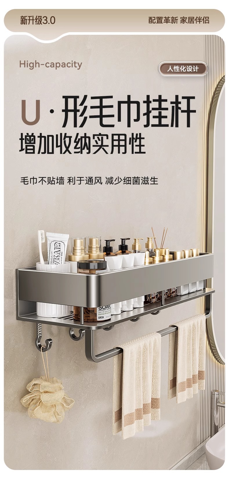 浴室加粗加厚四方篮免打孔墙上置物架可通风沥水挂架带毛巾杆的架子浴室可挂搓澡巾的置物架上下间距可调节置物架加粗加厚方形篮不生锈的浴室收纳神器洗漱用品收纳篮