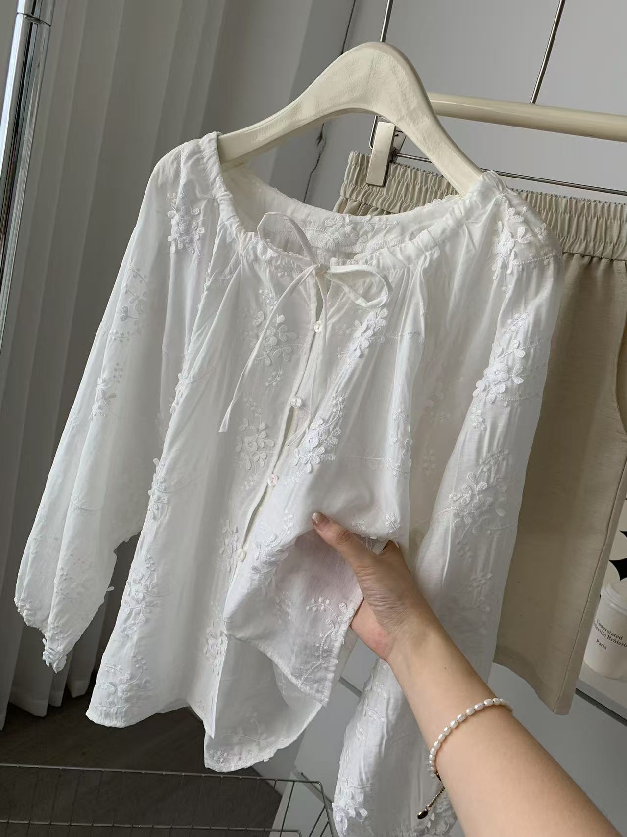 여름 디자인의 여성용 한국 복고풍 입체 자수 자카드 얇은 자외선 차단 셔츠, 살을 커버하는 헤비듀티 라운드 넥 탑