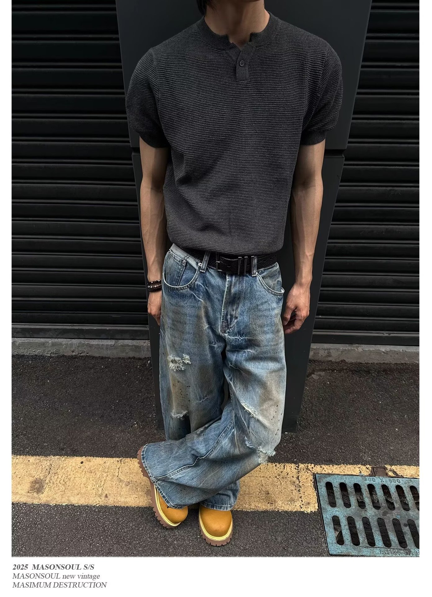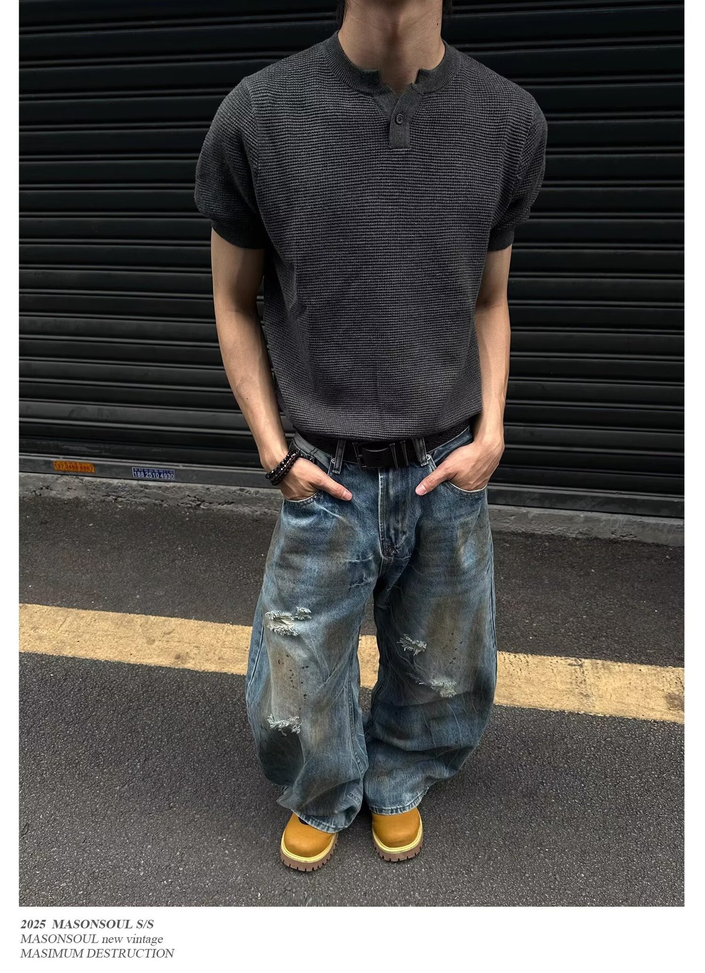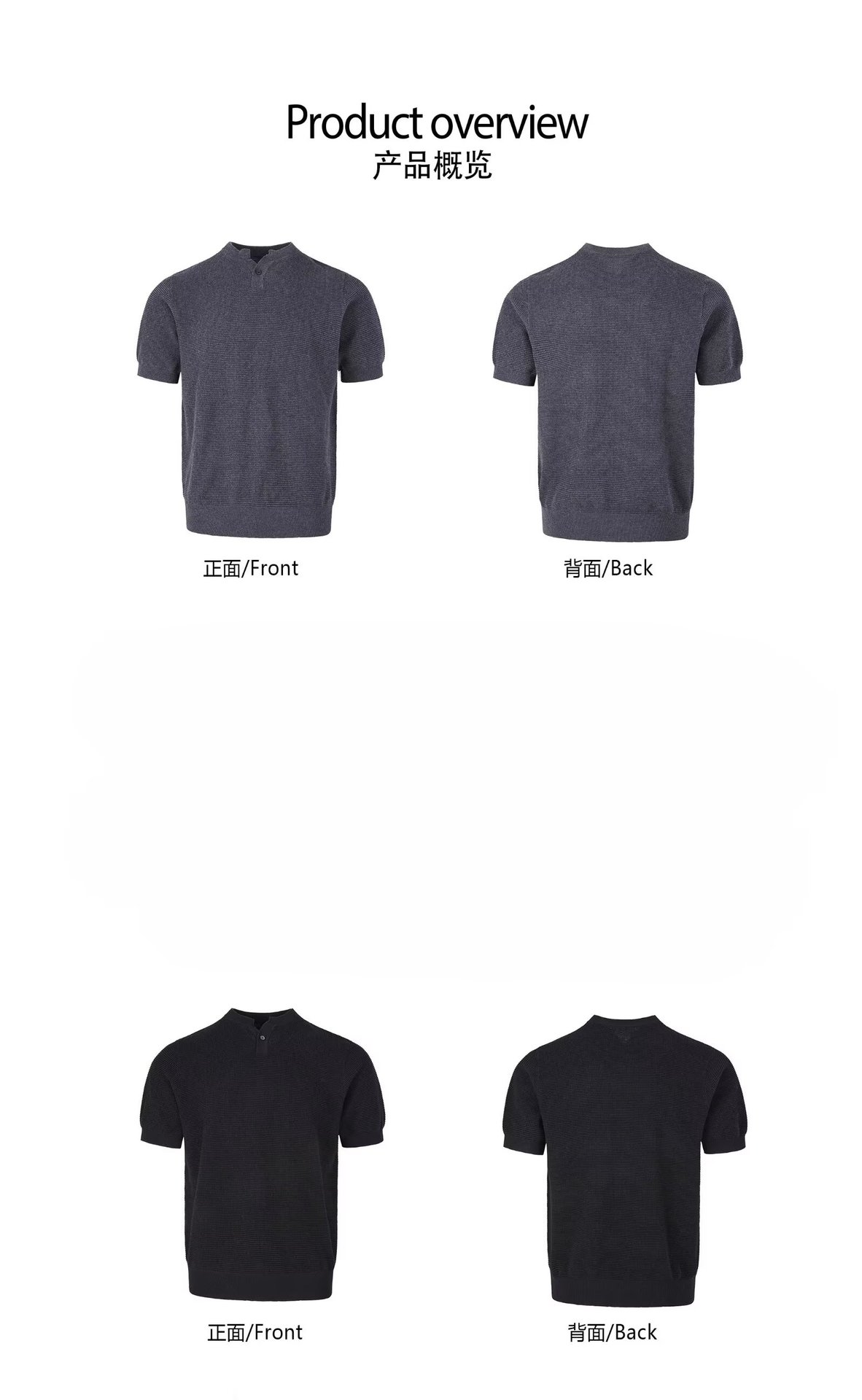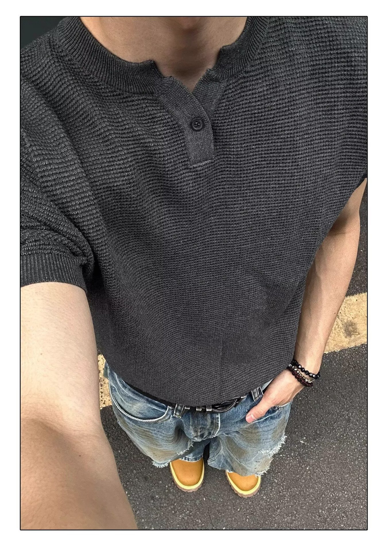 아메리칸 헨리 칼라 니트 반팔 티셔츠 남성 여름 올드 머니 스타일 와플 통기성 폴로 셔츠 가볍고 성숙한 스타일 반소매스토어 가기