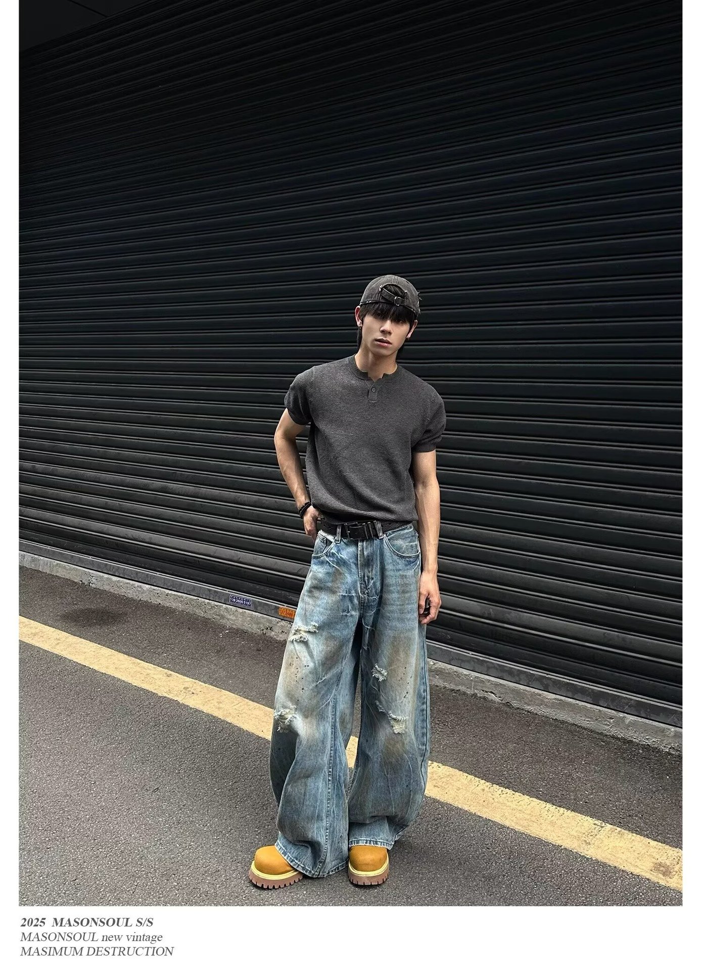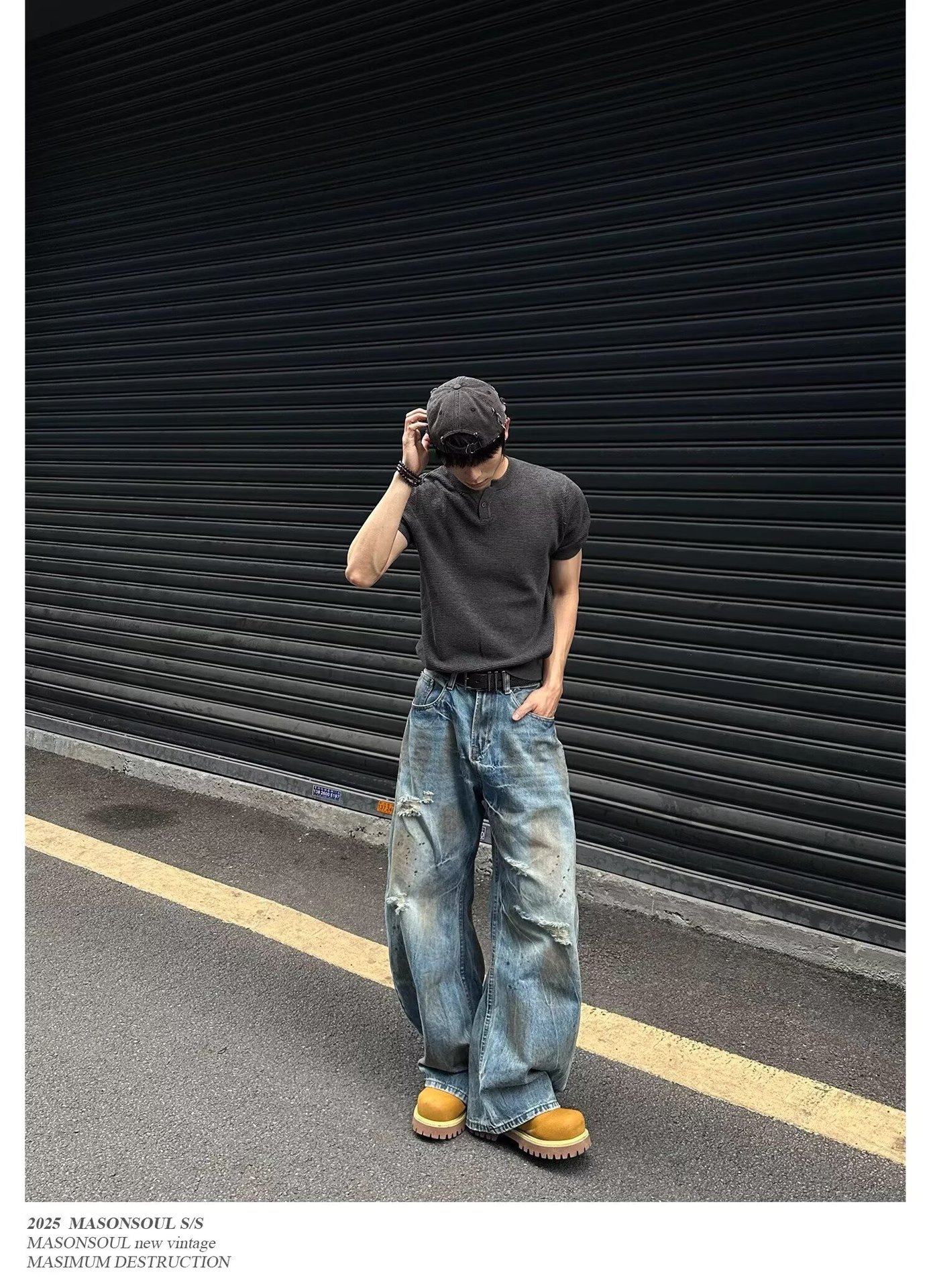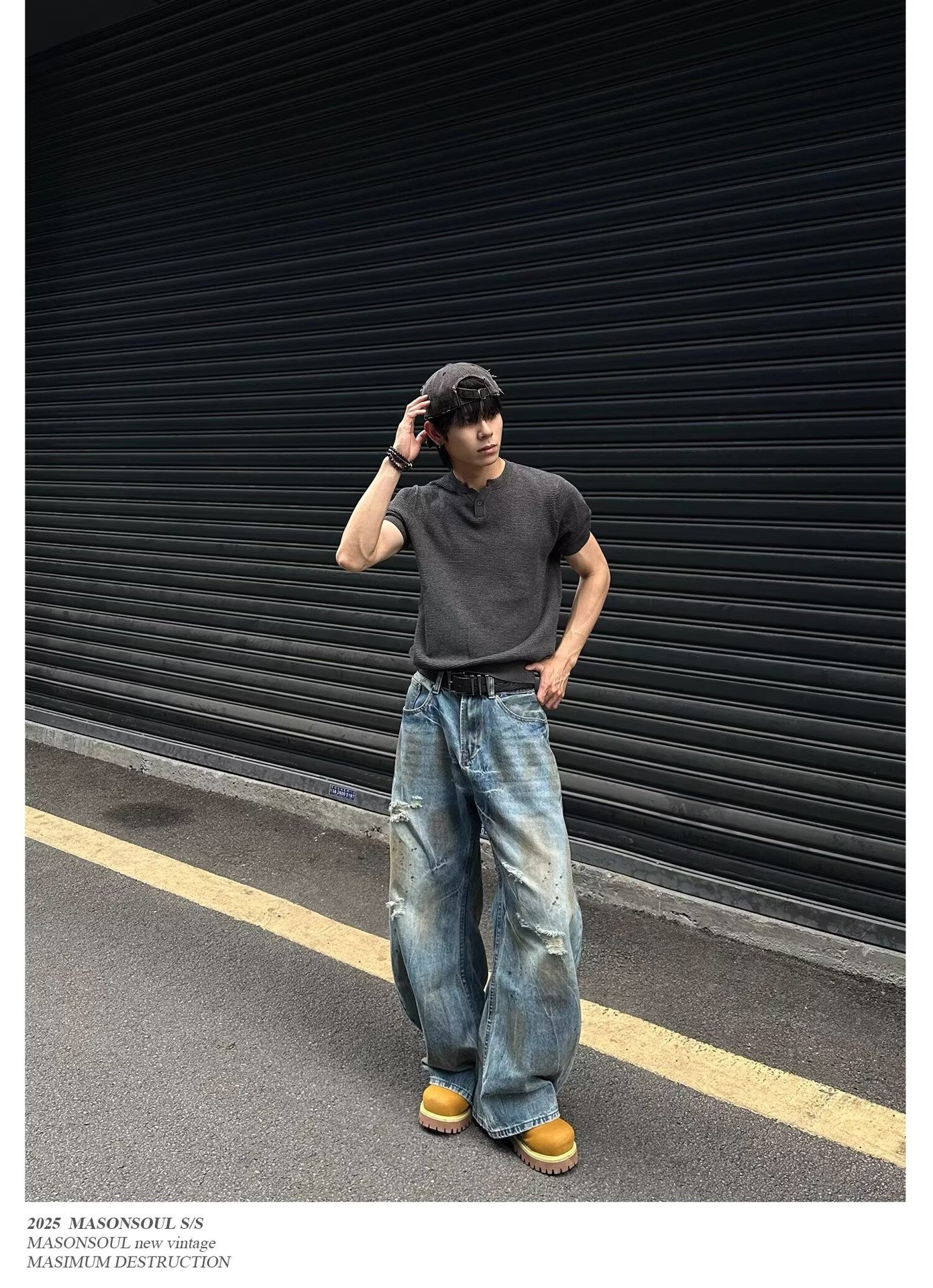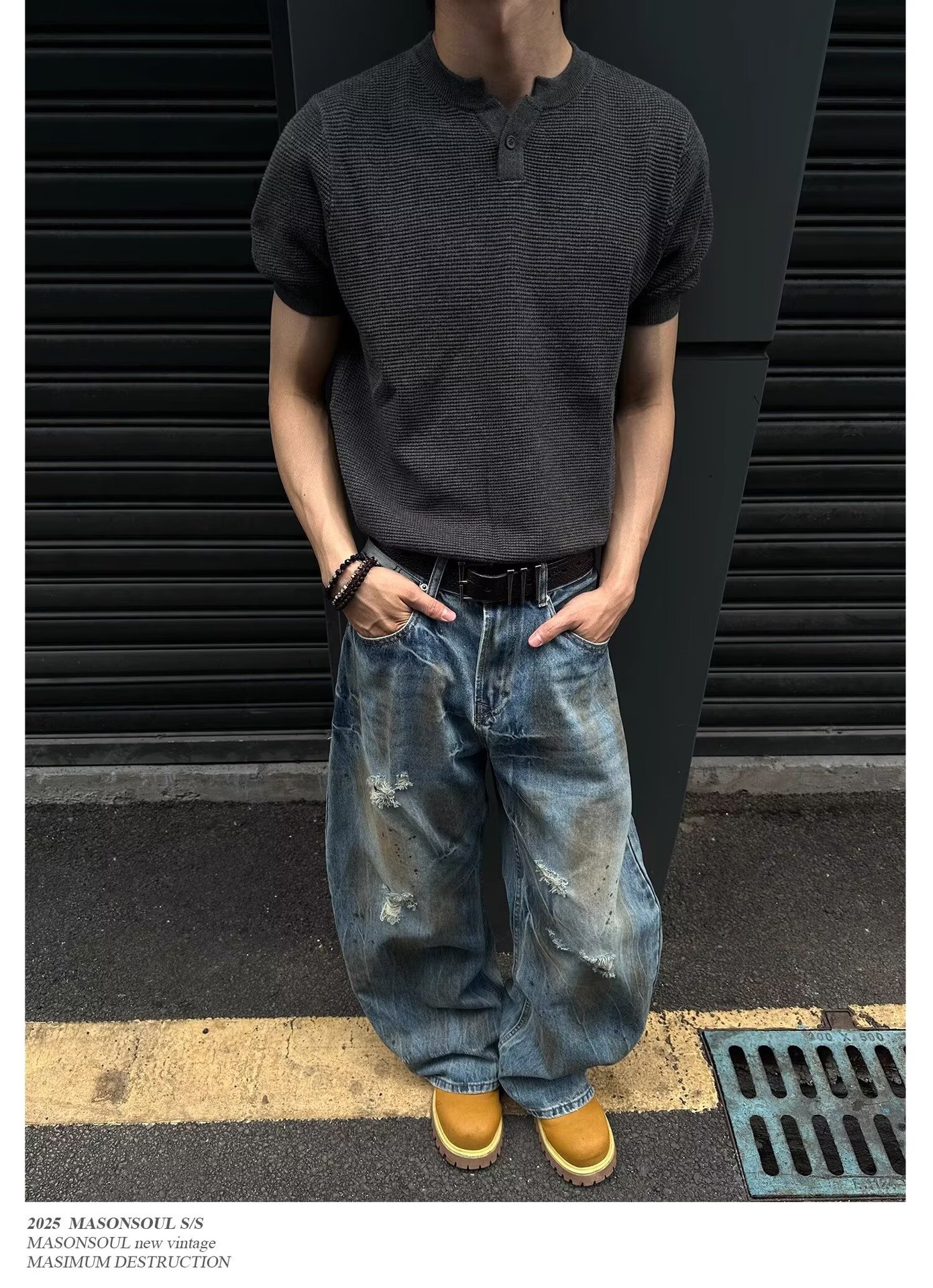 아메리칸 헨리 칼라 니트 반팔 티셔츠 남성 여름 올드 머니 스타일 와플 통기성 폴로 셔츠 가볍고 성숙한 스타일 반소매스토어 가기