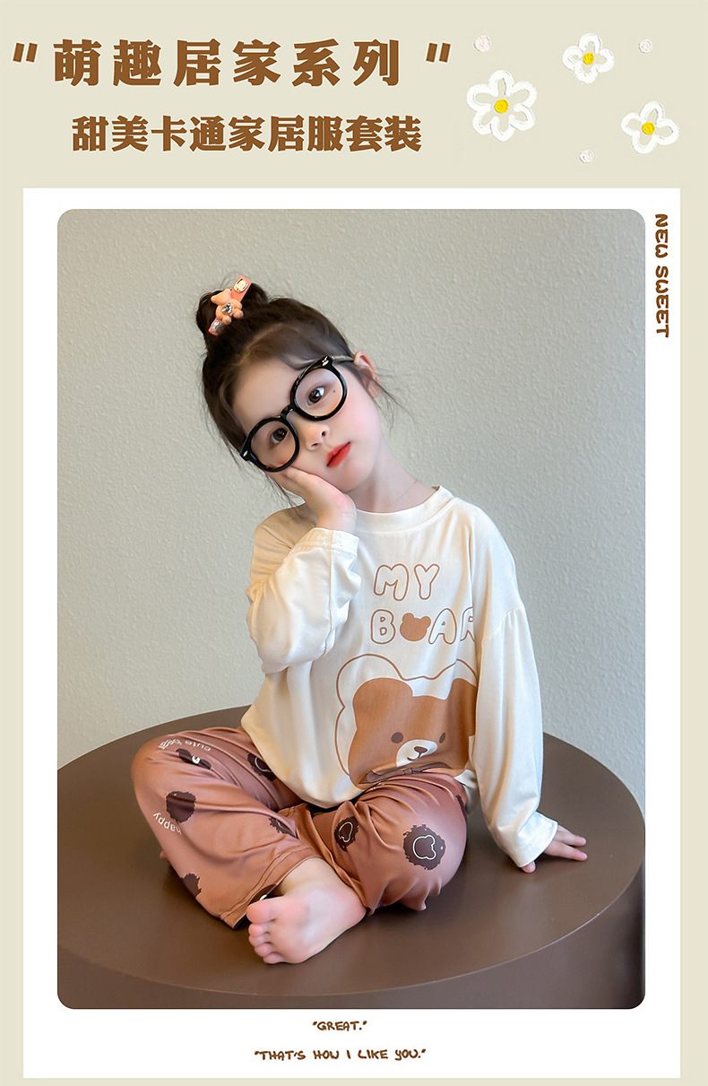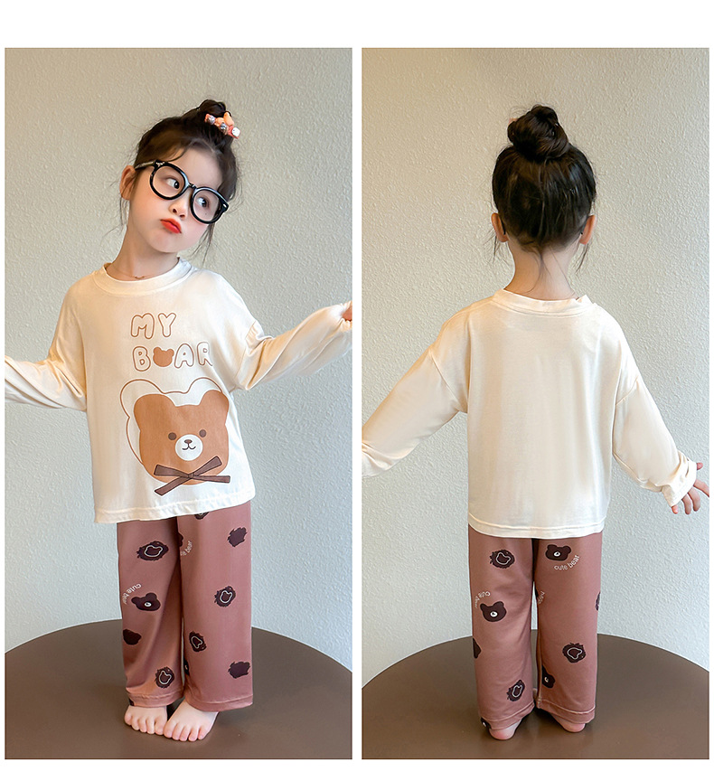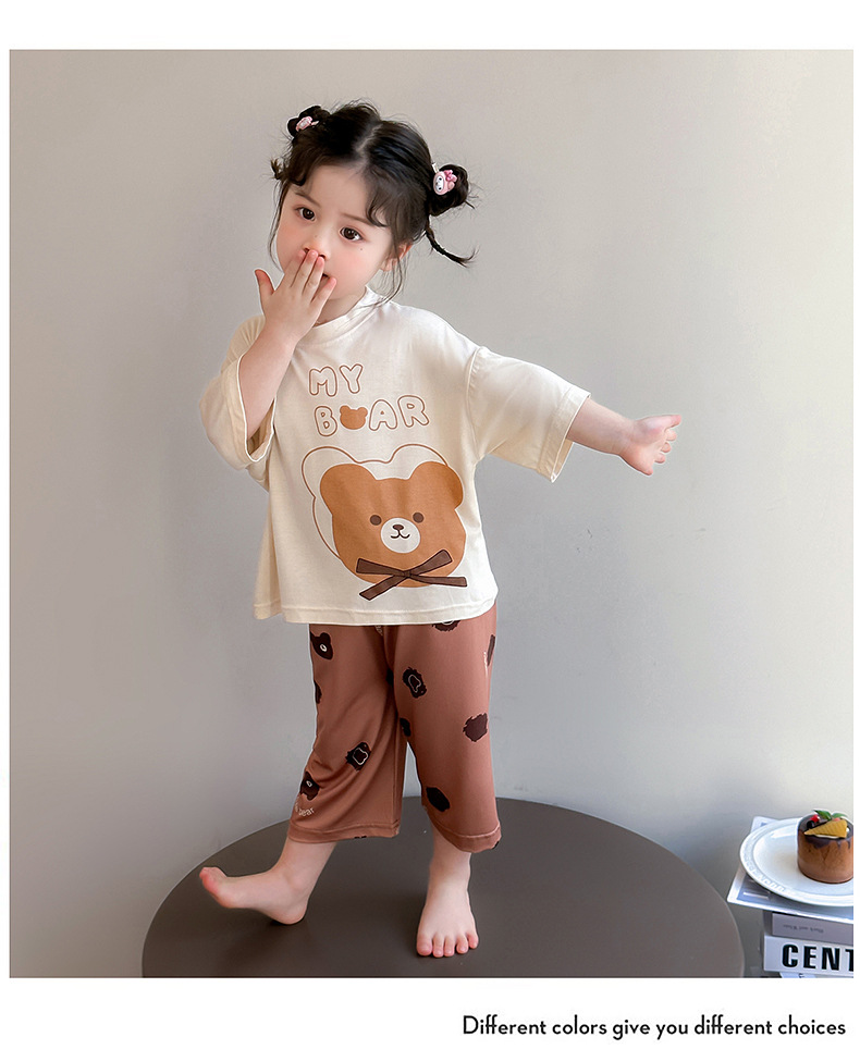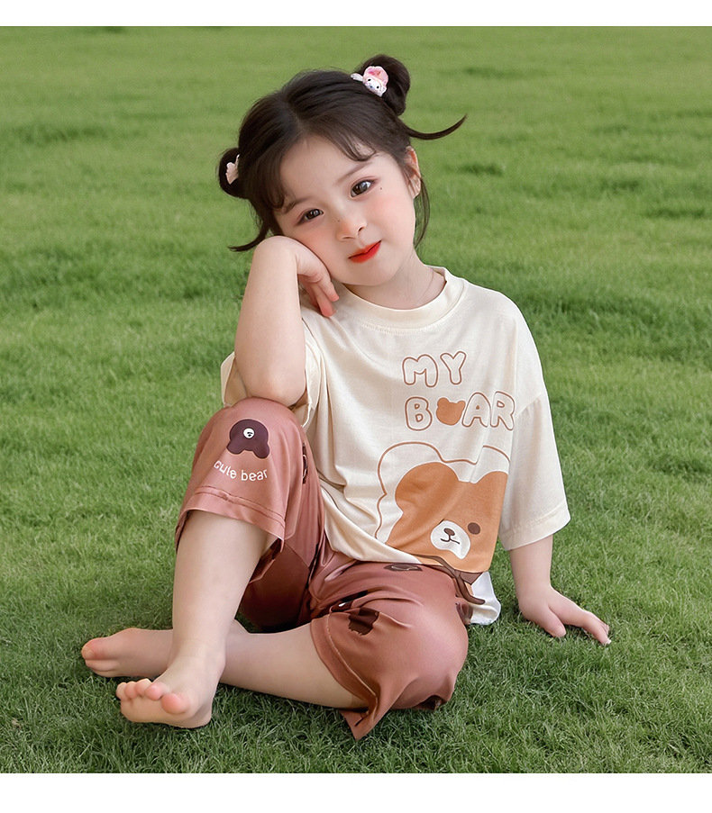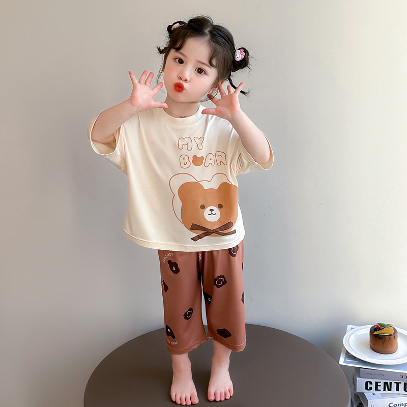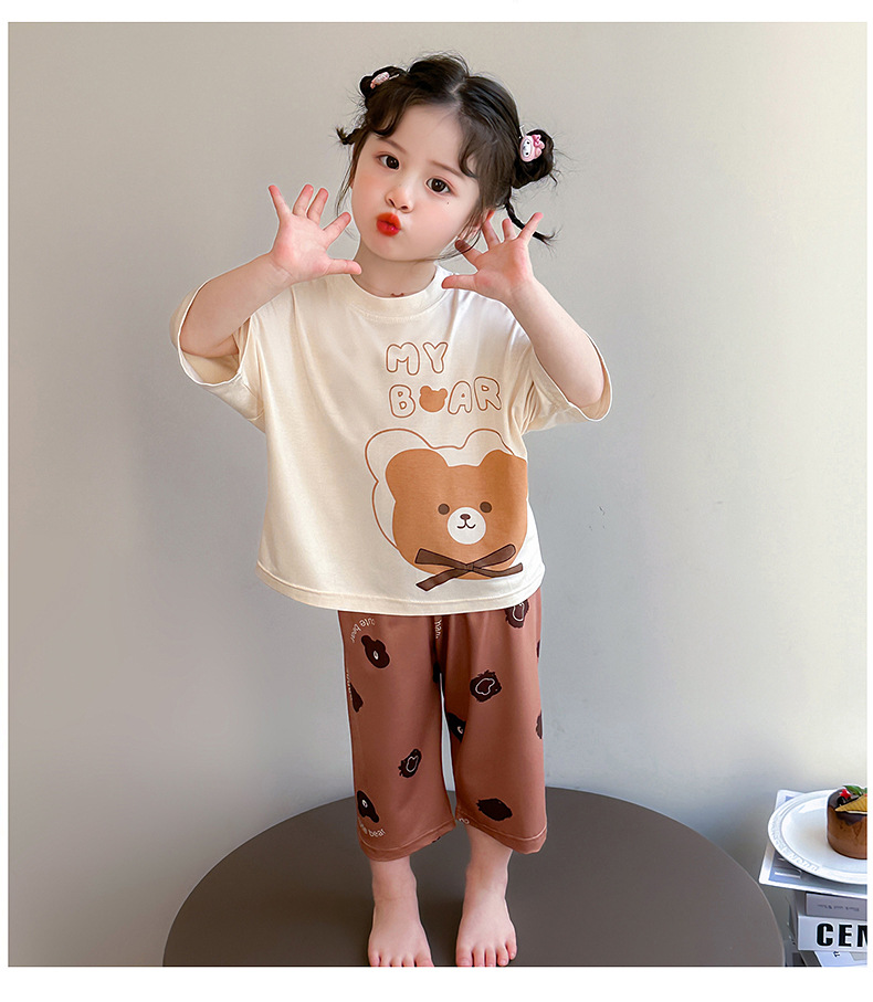 여아 잠옷 투피스 세트 봄 여름 얇은 스타일 2026년 신상 여아 반팔 만화 곰돌이 세트 홈웨어