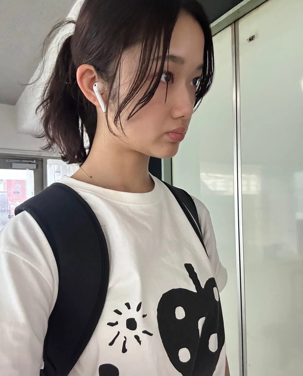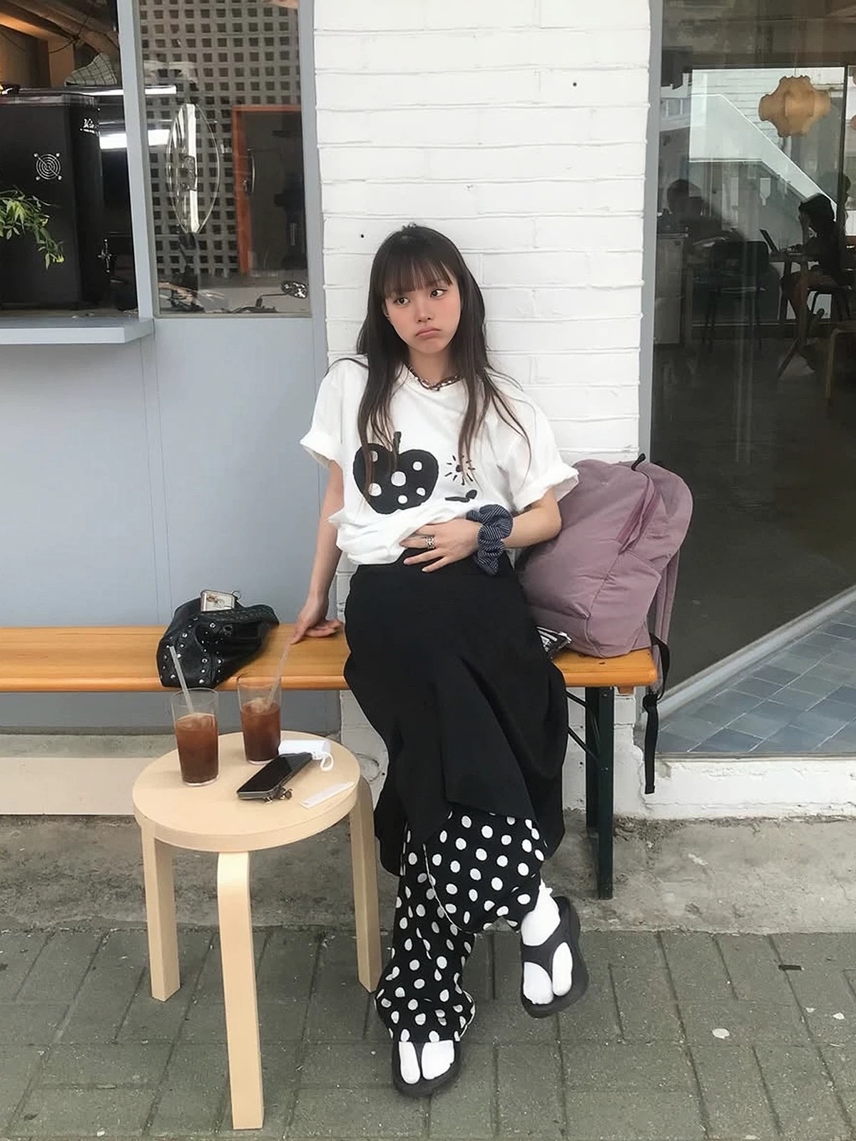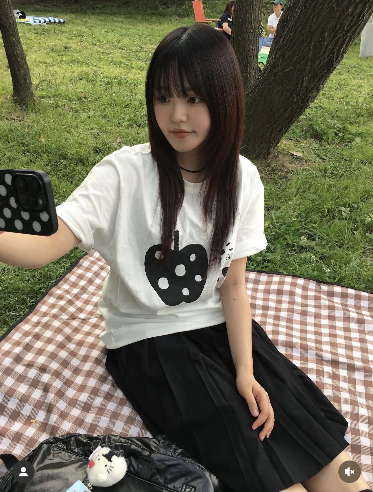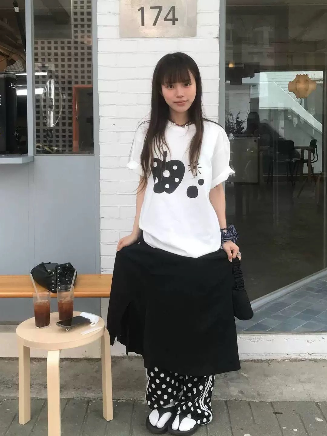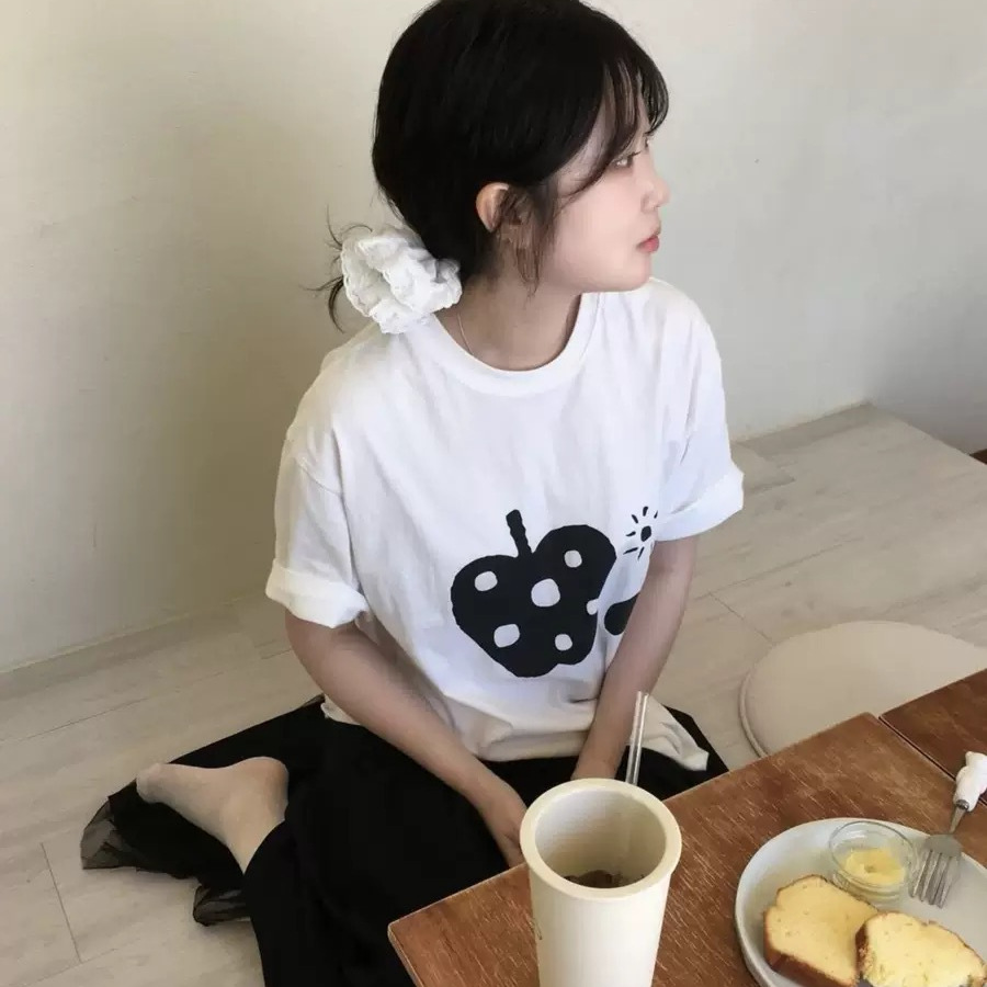 OHESH*O 한국 니치 블랙 애플 폴카 도트 프린트 루즈핏 반팔 티셔츠 소녀 캐주얼 티셔츠스토어 가기