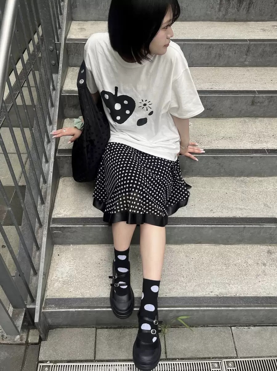 OHESH*O 한국 니치 블랙 애플 폴카 도트 프린트 루즈핏 반팔 티셔츠 소녀 캐주얼 티셔츠