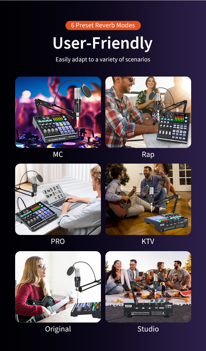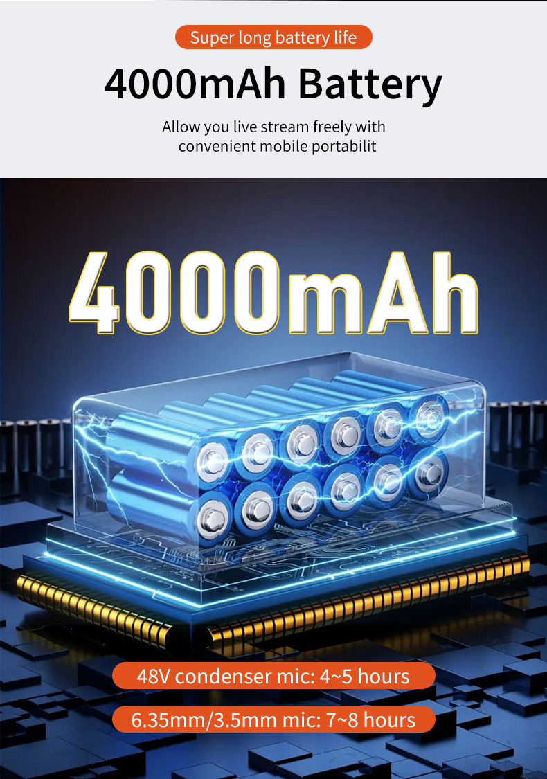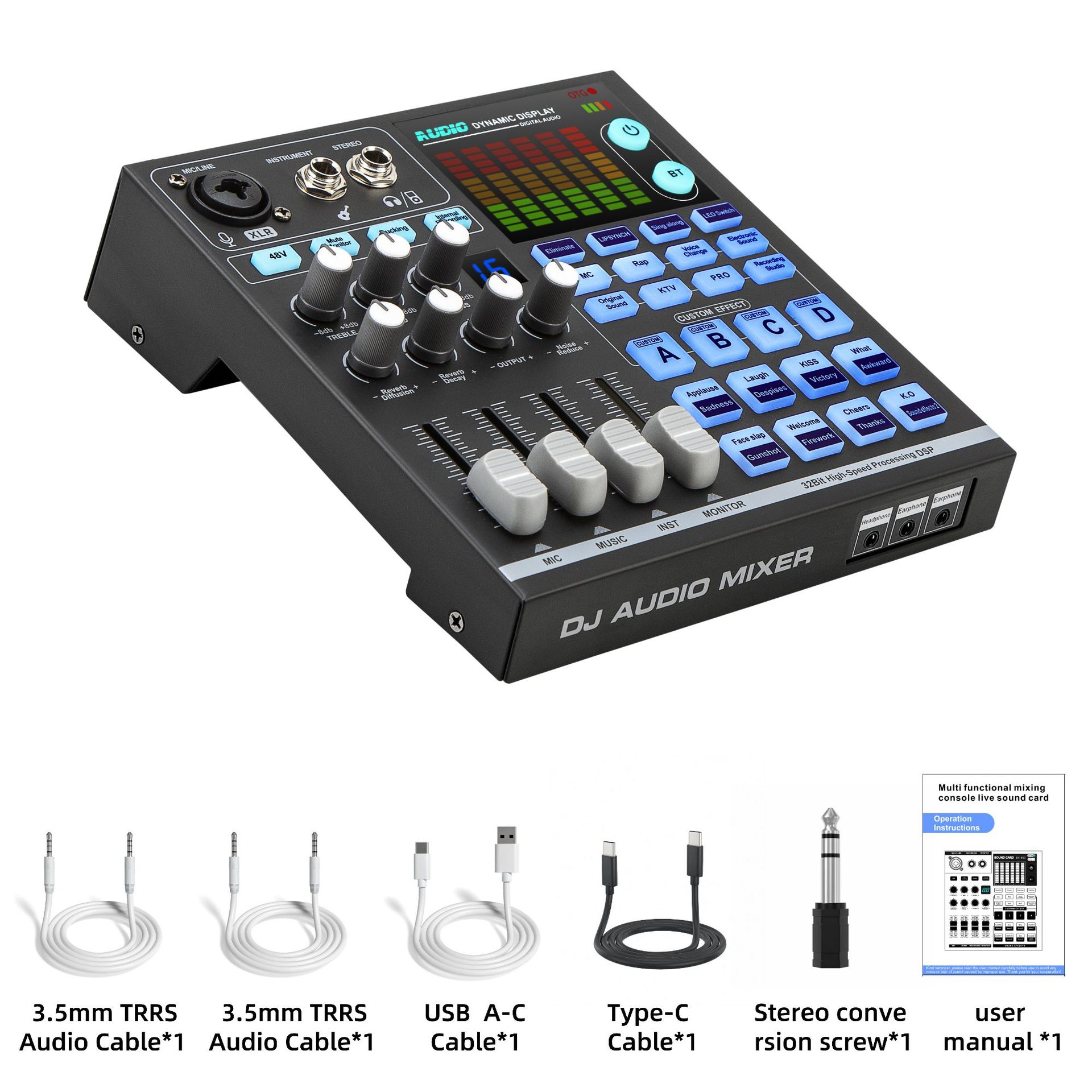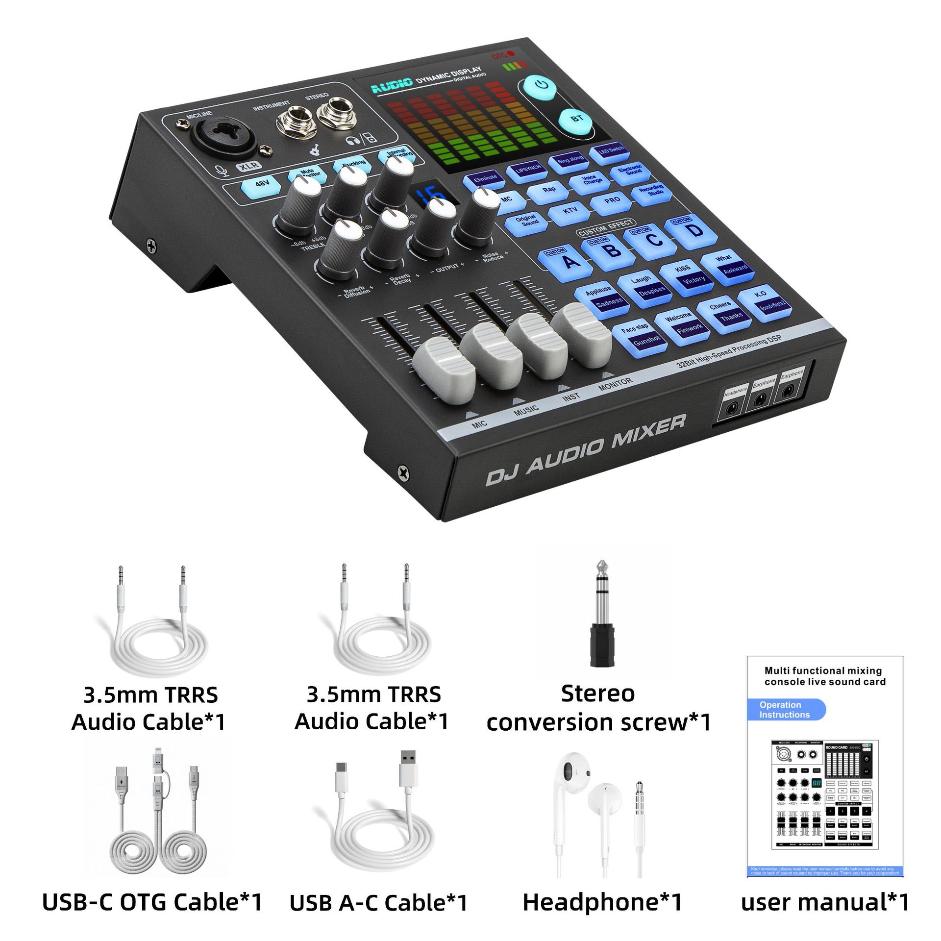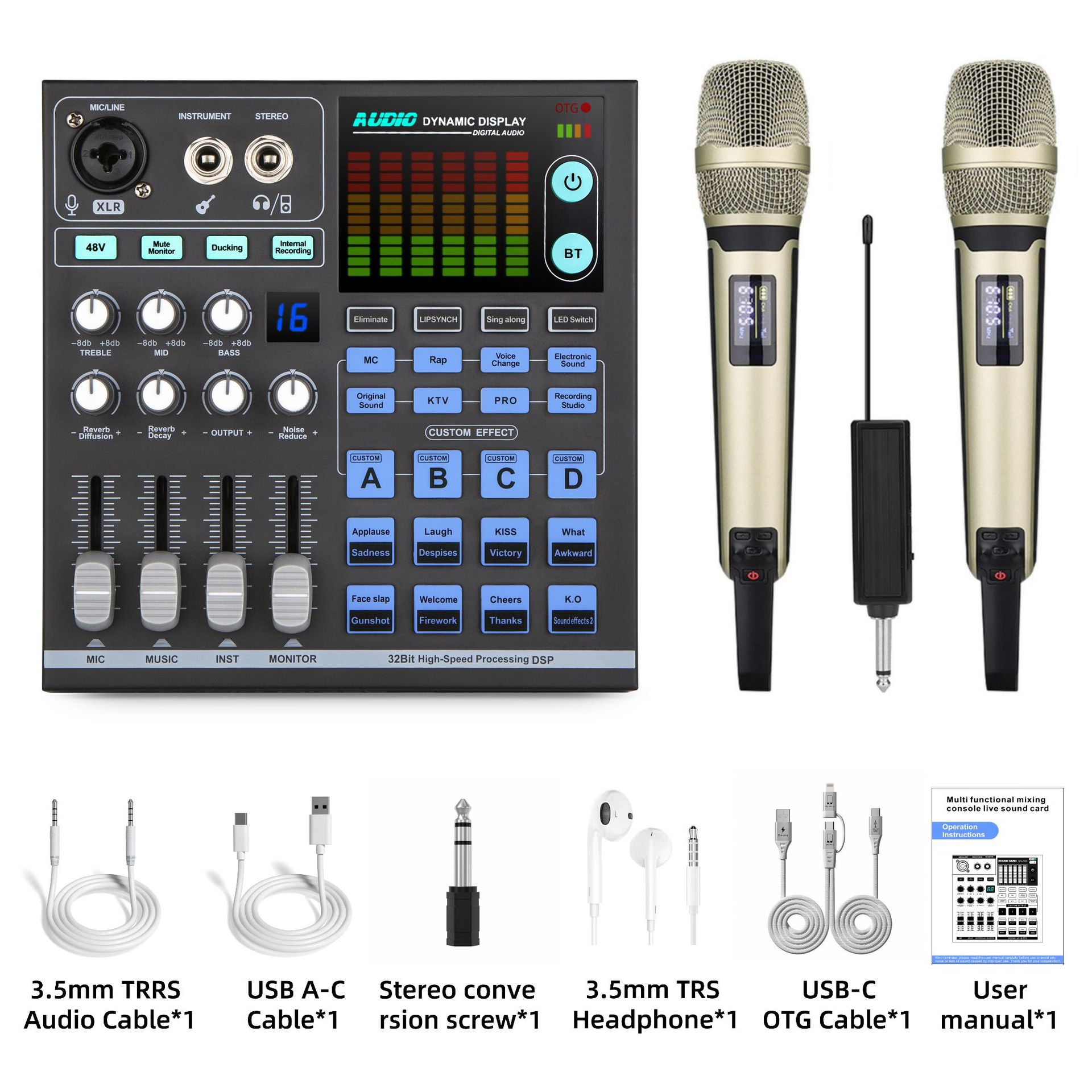 • 무선 마이크(2개용 1개) + SN-800 사운드 카드 + 2-in-1 라이브 방송 케이블 + 헤드폰 + 스테레오 변환 나사 + 충전 케이블.