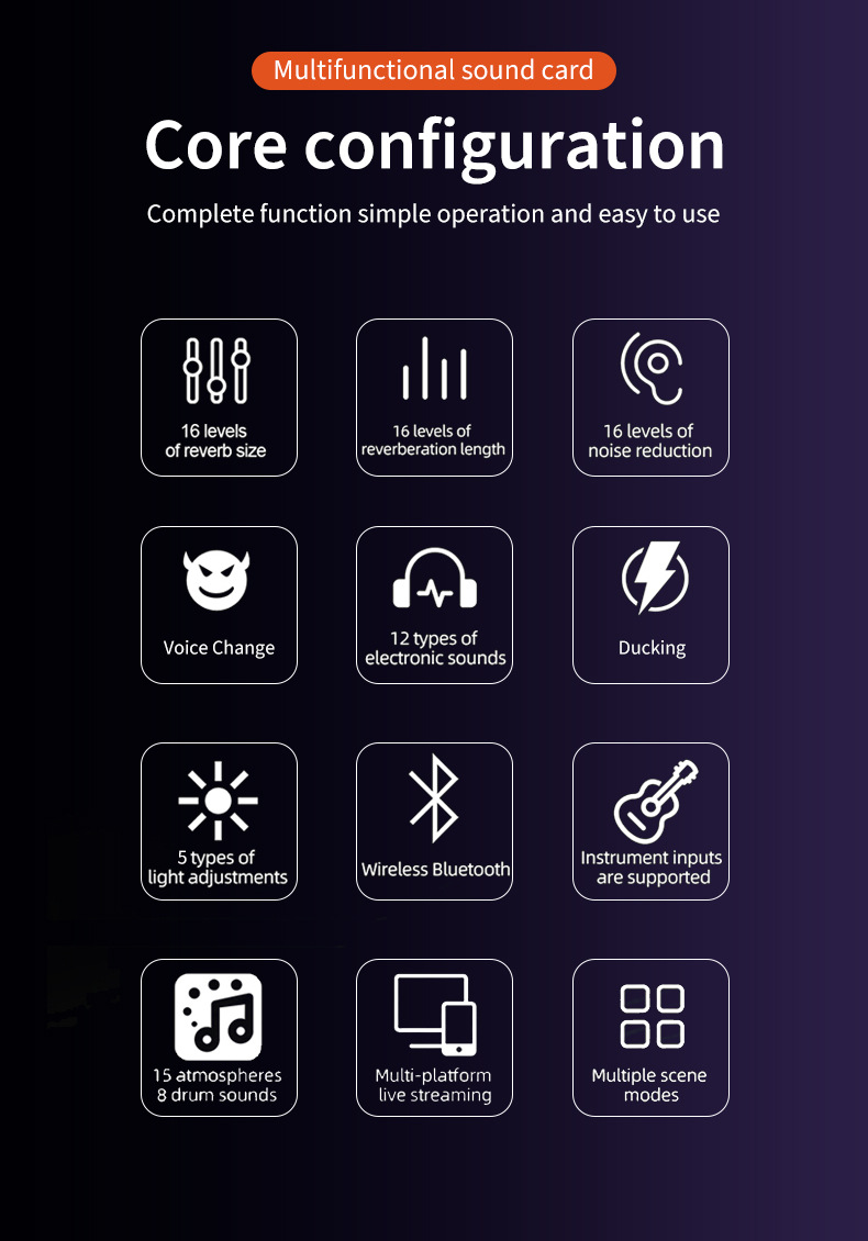 • K8 마이크 + SN-800 사운드 카드 + 캔틸레버 브래킷 + 마이크 클립 + 파열 방지 네트 + 투인원 라이브 방송 케이블 + 헤드폰 + 스테레오 변환 나사.