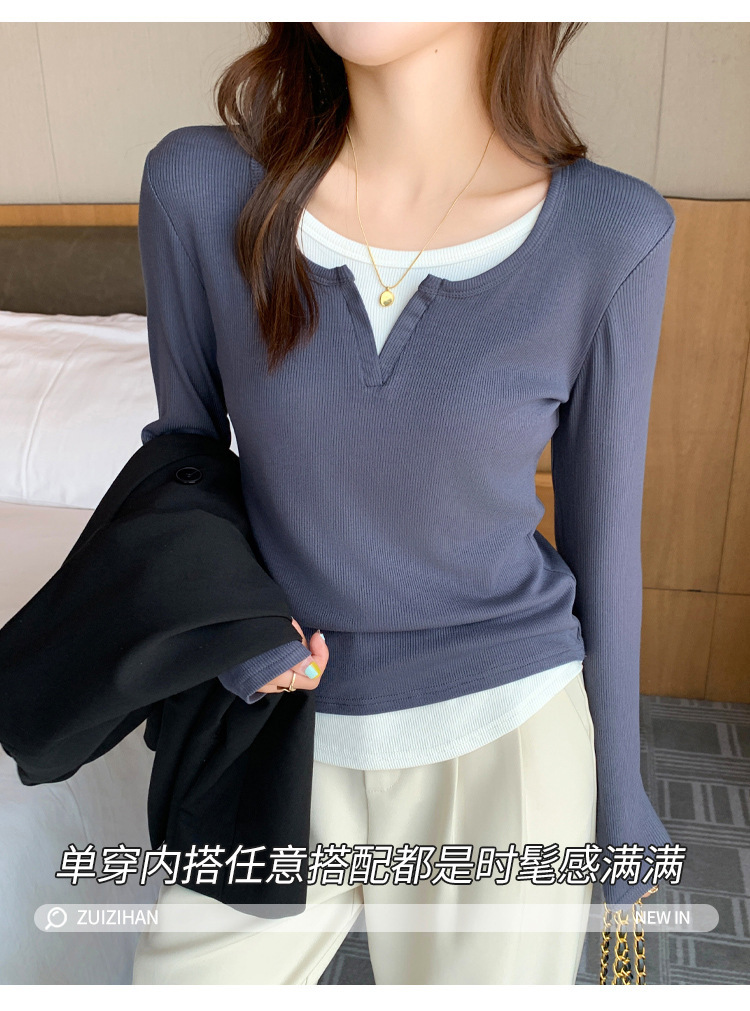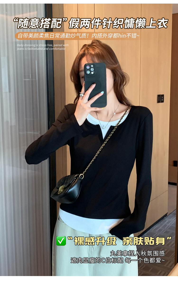 가을 여성용 페이크 투피스 디자인 긴팔 티셔츠, 슬림핏, 시크하고 아름다운 탑, 라운드넥 밑단 셔츠스토어 가기