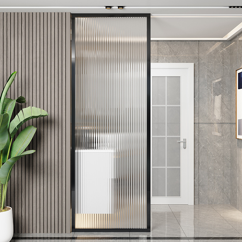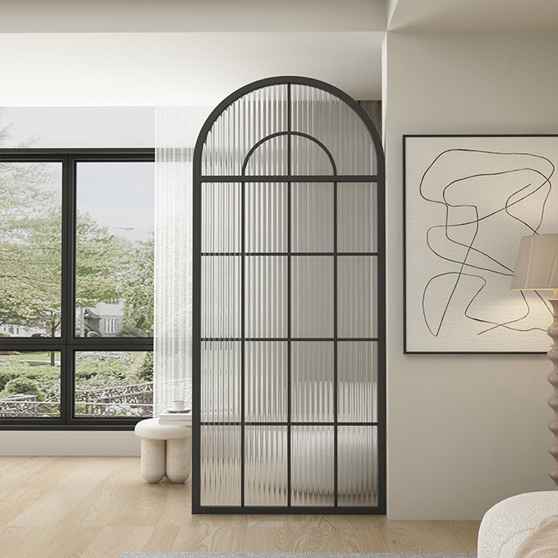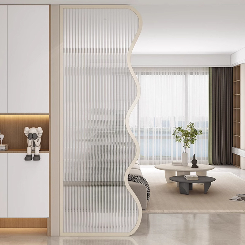 거실은 문을 향하고 있으며, 아름다운 아치형 유리 스크린 파티션이 간단하고 가벼운 고급스러운 스테인레스 스틸로 장식되어 입구를 가리고 있습니다.