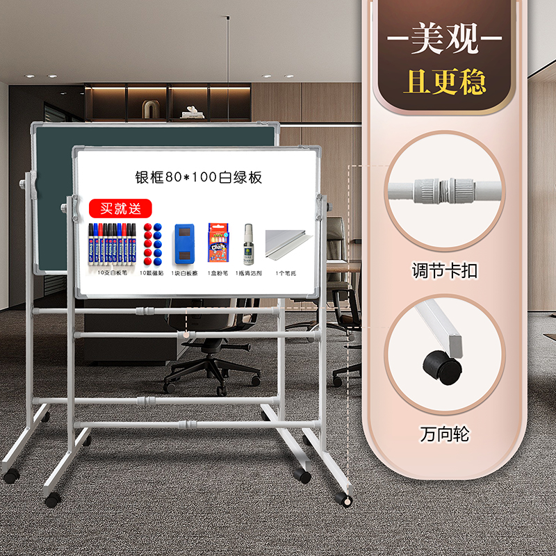 • [업그레이드된 이중극] 안정적인 60*90 흰색 및 녹색 보드 + 실버 브래킷 + 자석 12개 + 펜 10개 + 지우개 2개 + 분필 1상자 + 세제 1개 + 펜 홀더 1개