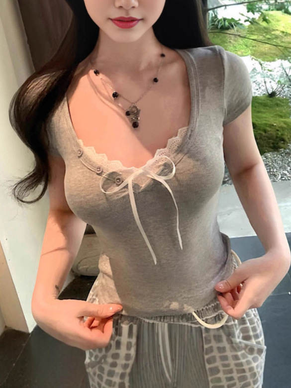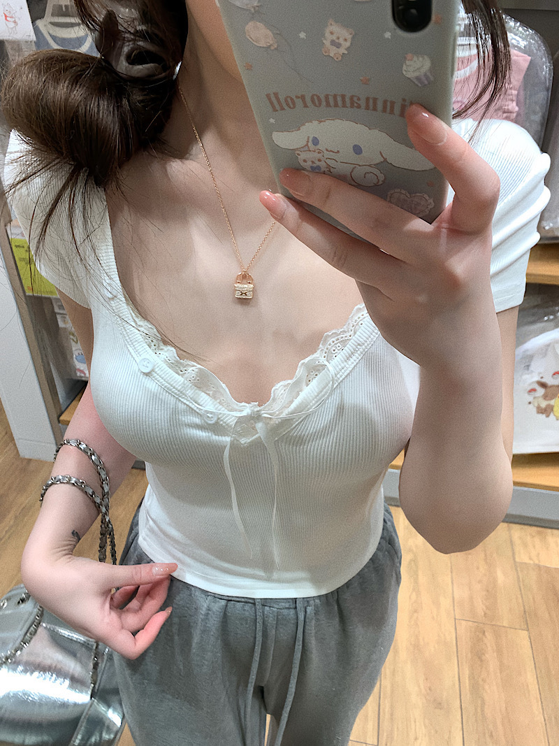 여성용 페이크 투피스 퓨어 러블리 스플라이스 레이스 반팔 티셔츠, 리본 허리 슬리밍 화이트 쇼트 탑 트렌디