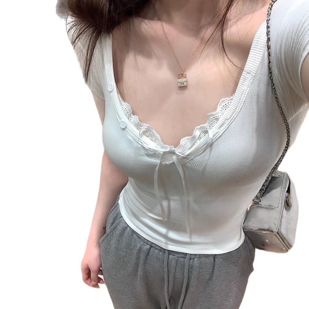 여성용 페이크 투피스 퓨어 러블리 스플라이스 레이스 반팔 티셔츠, 리본 허리 슬리밍 화이트 쇼트 탑 트렌디스토어 가기