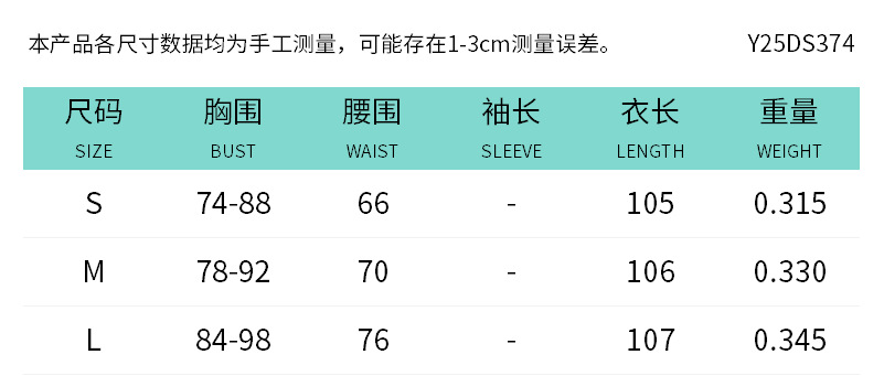 • Y25DS374 사이즈 차트, 최대 사이즈 무게: 0.345kg