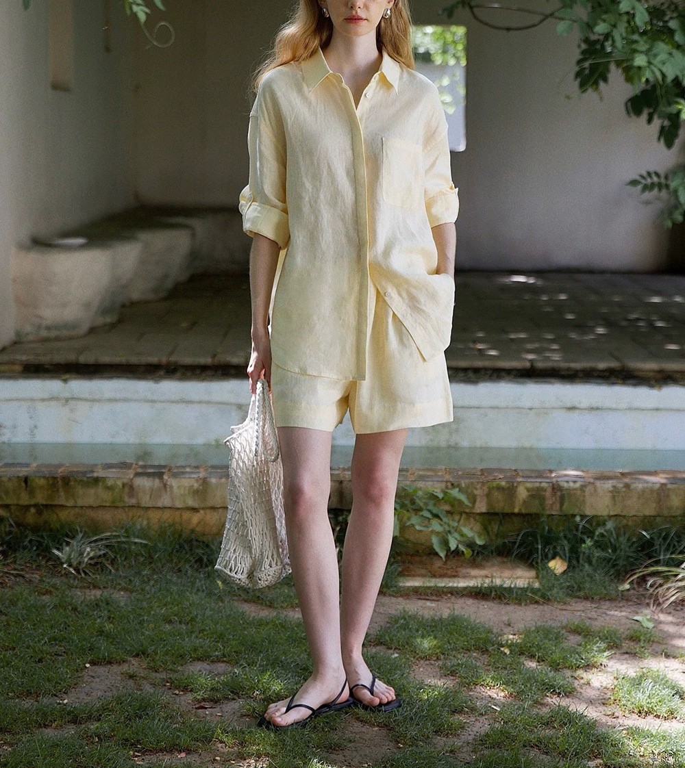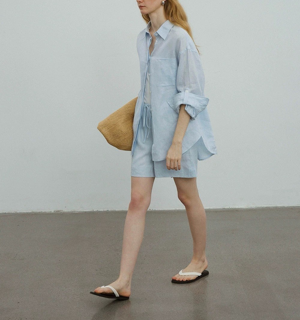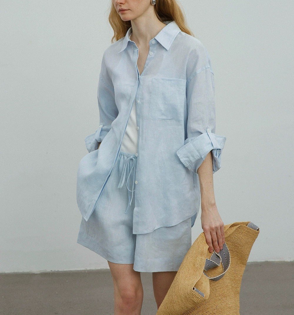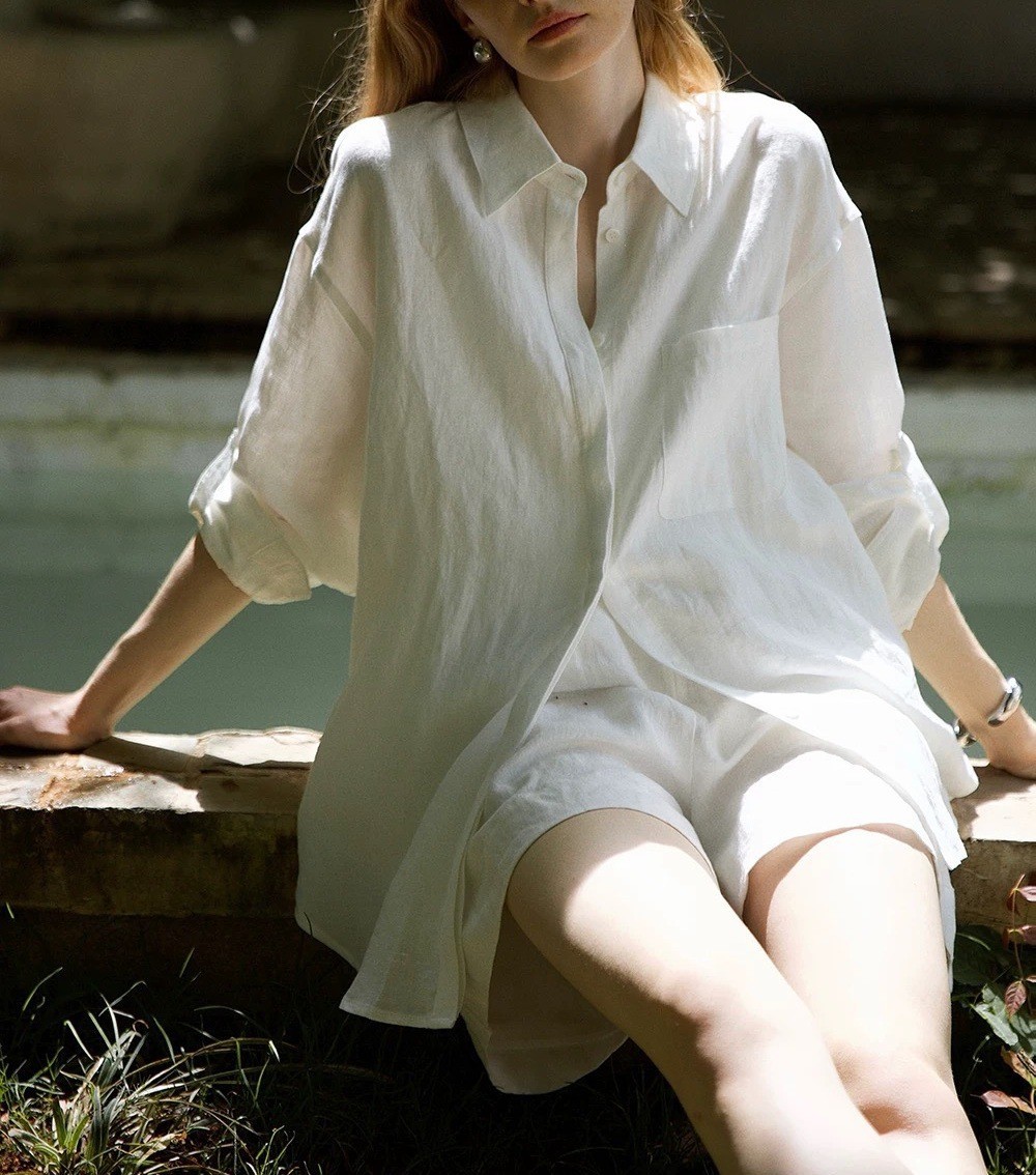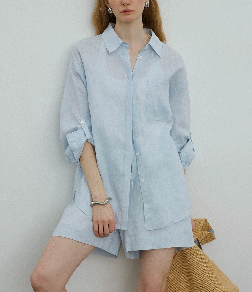릴렉스한 여름/레이지 캐주얼 올드머니 스타일 솔리드 화이트 린넨 실루엣 셔츠/반바지 슈트스토어 가기