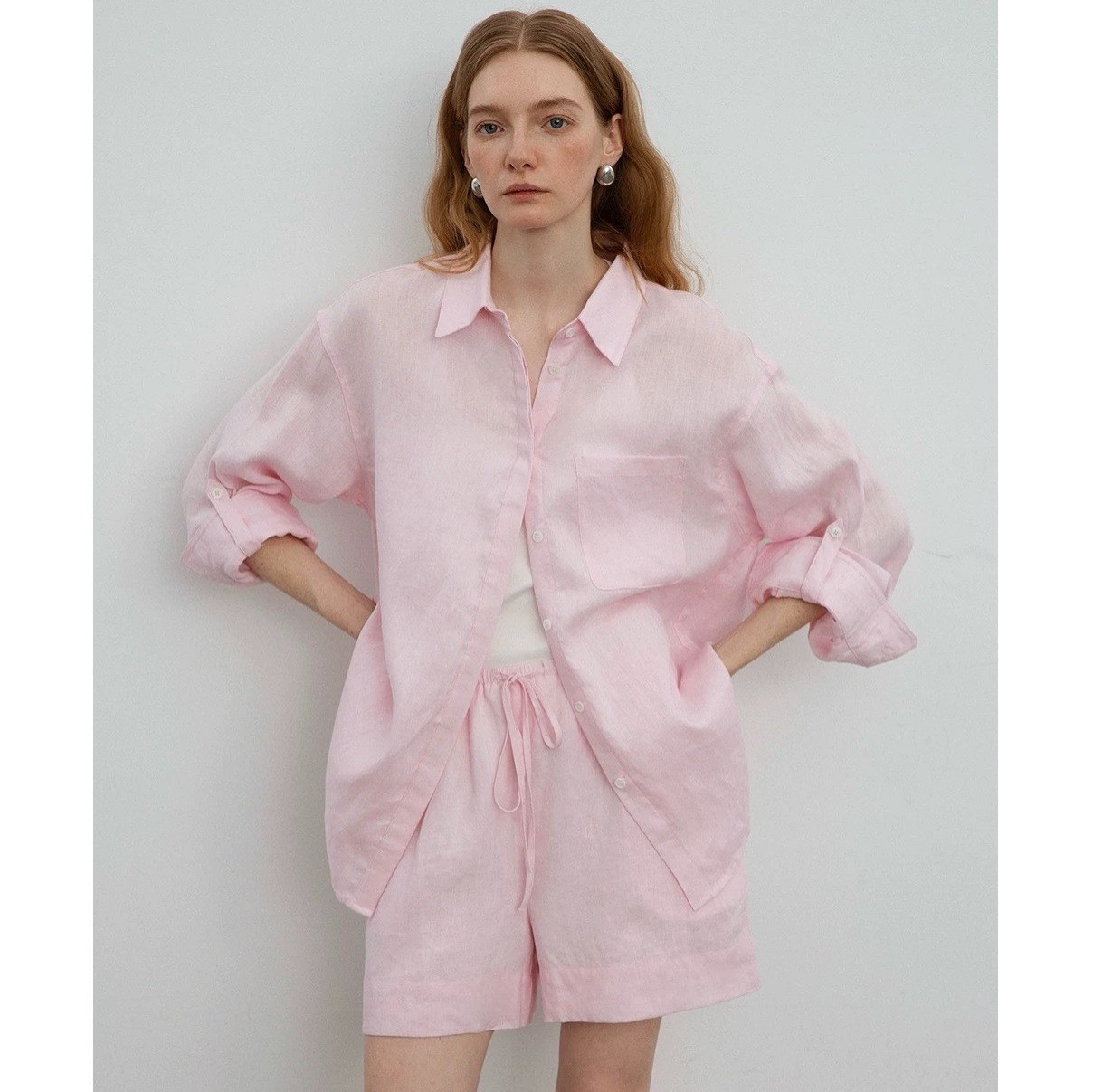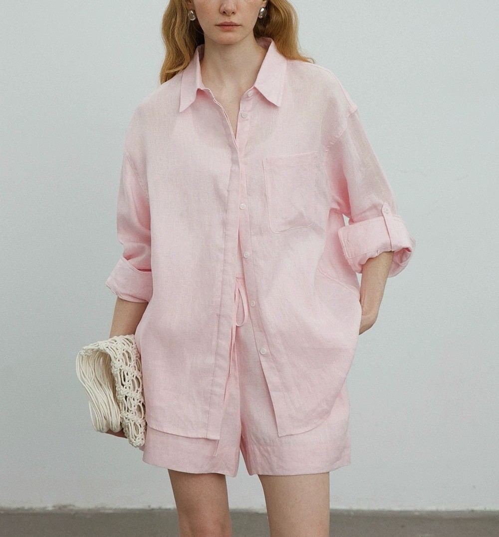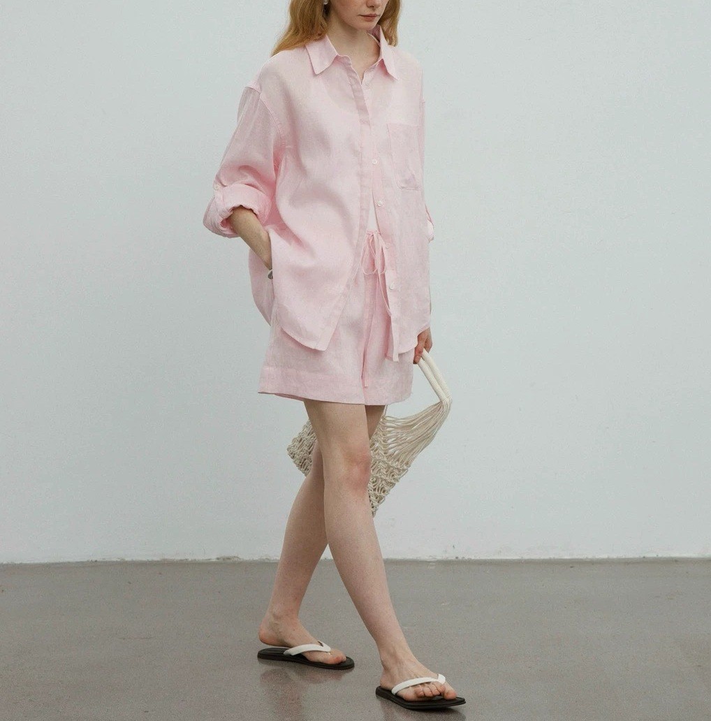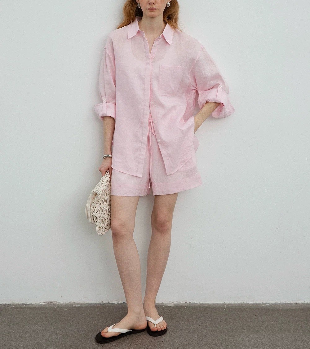 릴렉스한 여름/레이지 캐주얼 올드머니 스타일 솔리드 화이트 린넨 실루엣 셔츠/반바지 슈트스토어 가기