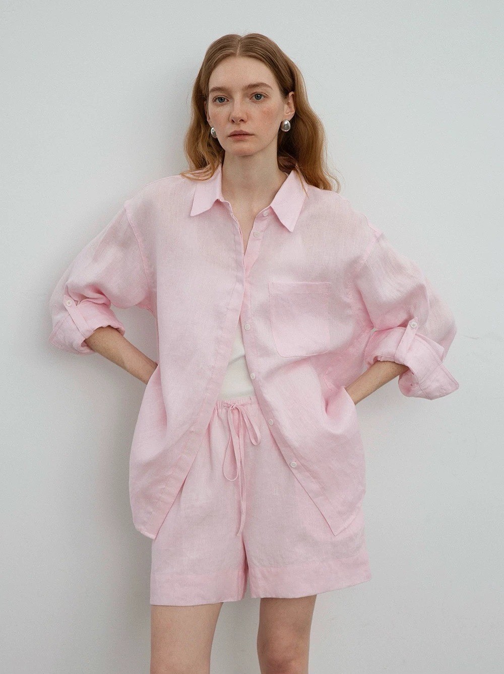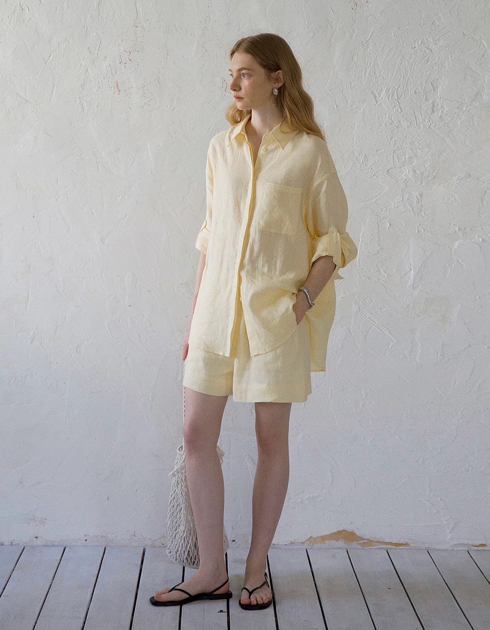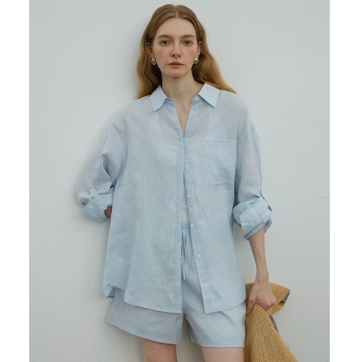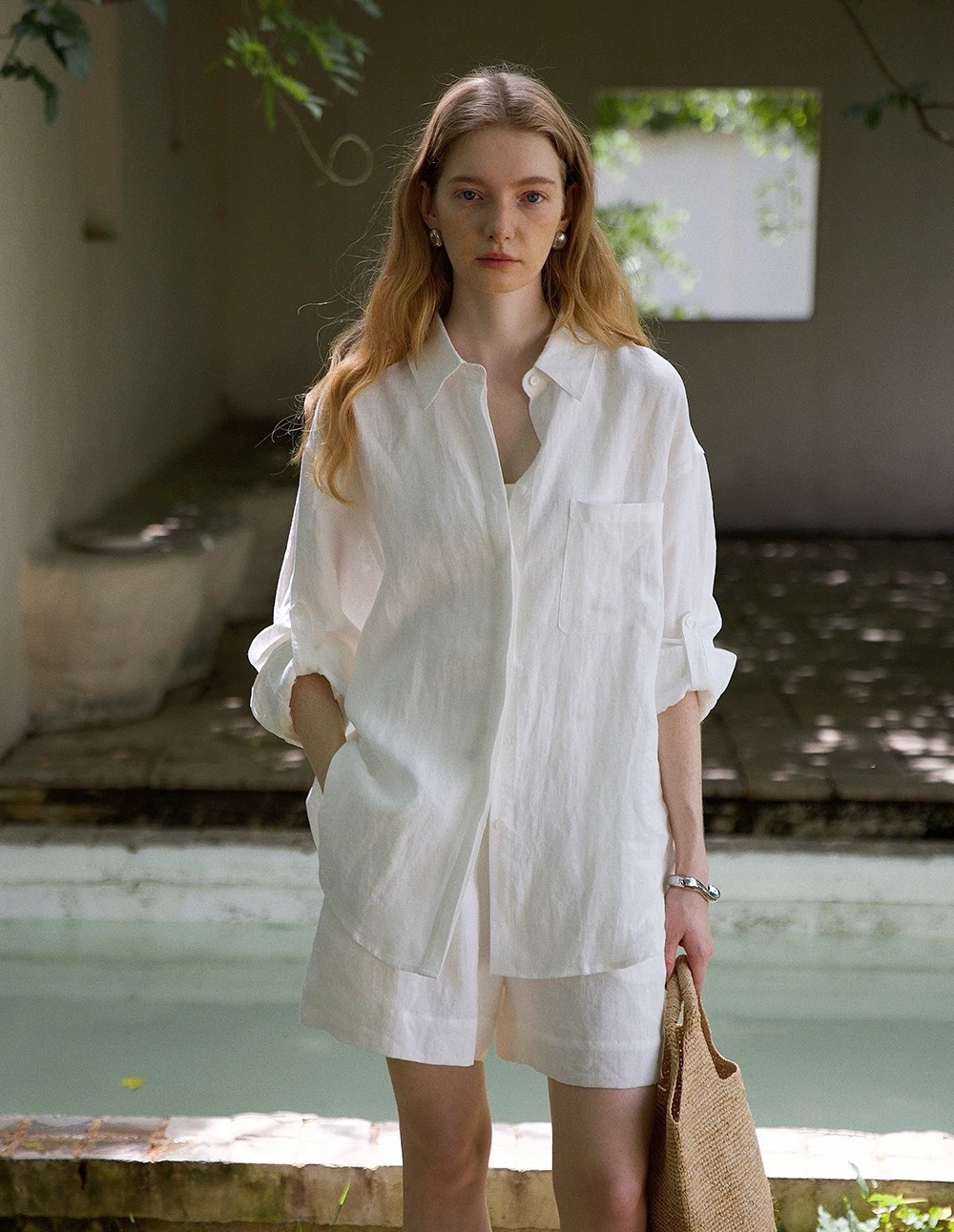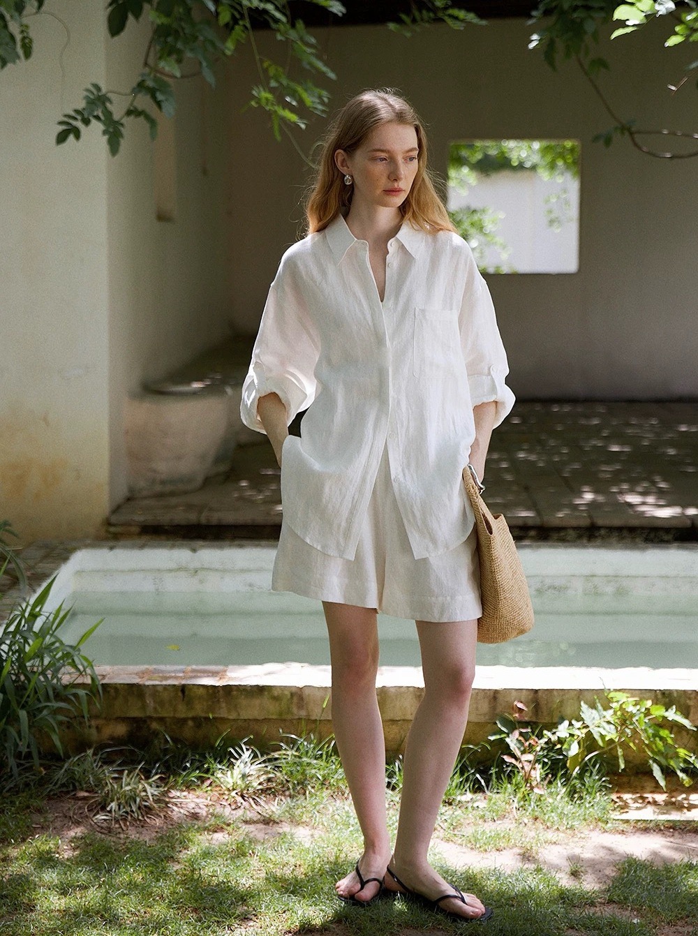 릴렉스한 여름/레이지 캐주얼 올드머니 스타일 솔리드 화이트 린넨 실루엣 셔츠/반바지 슈트스토어 가기