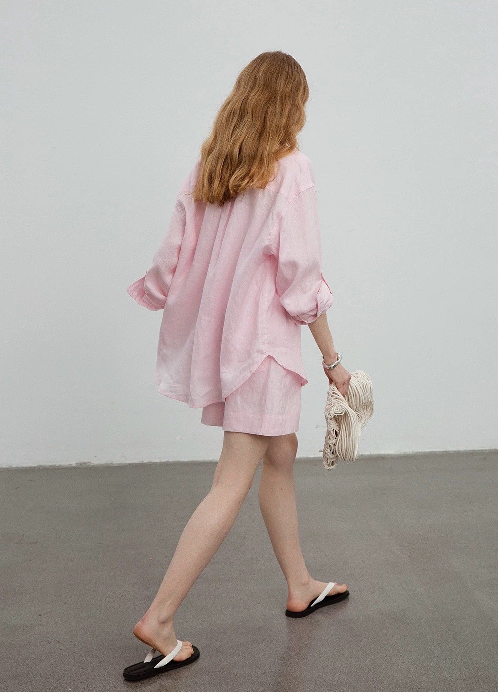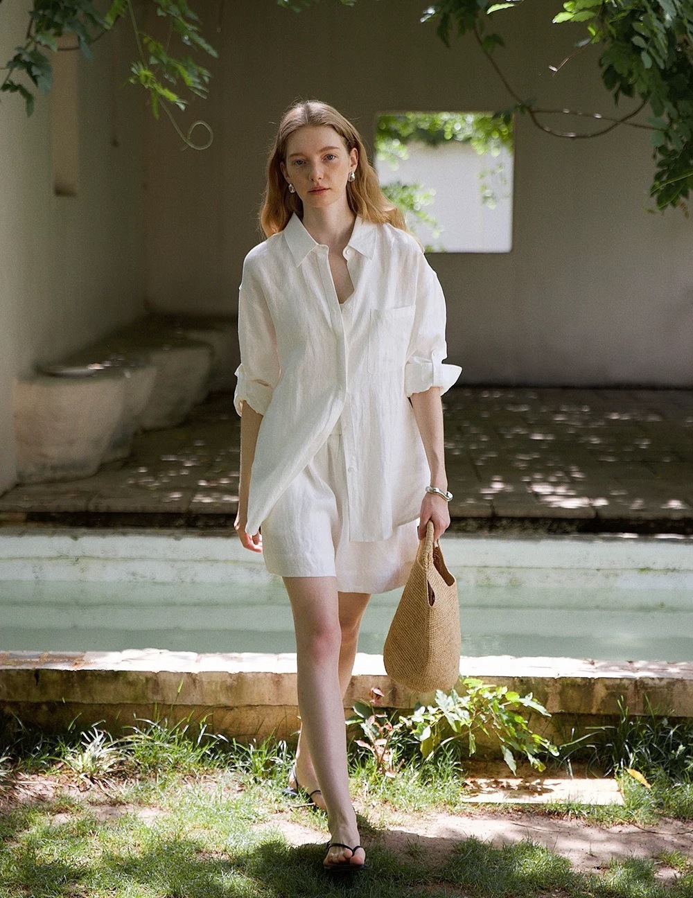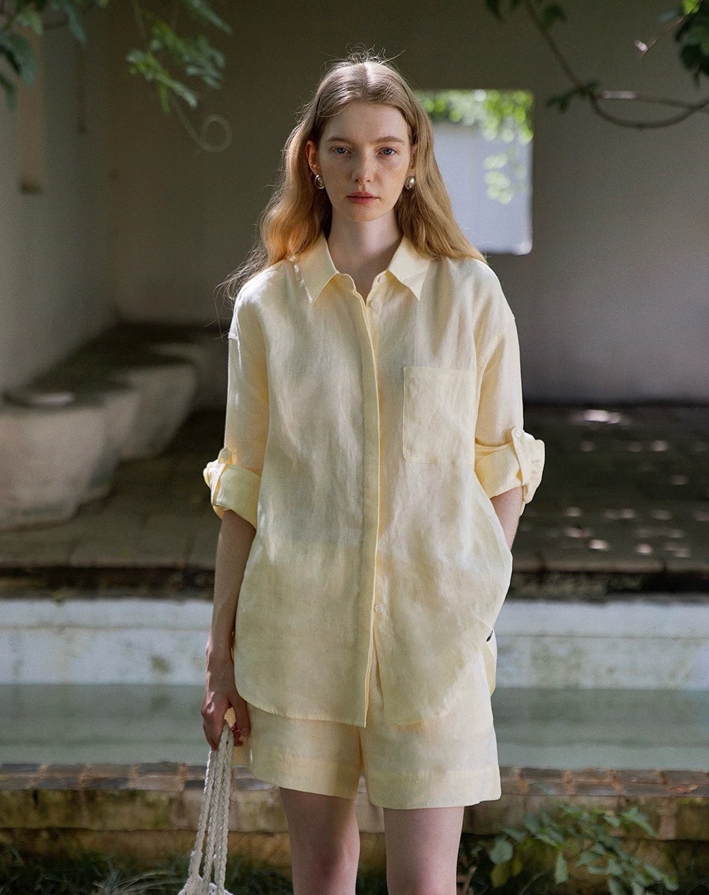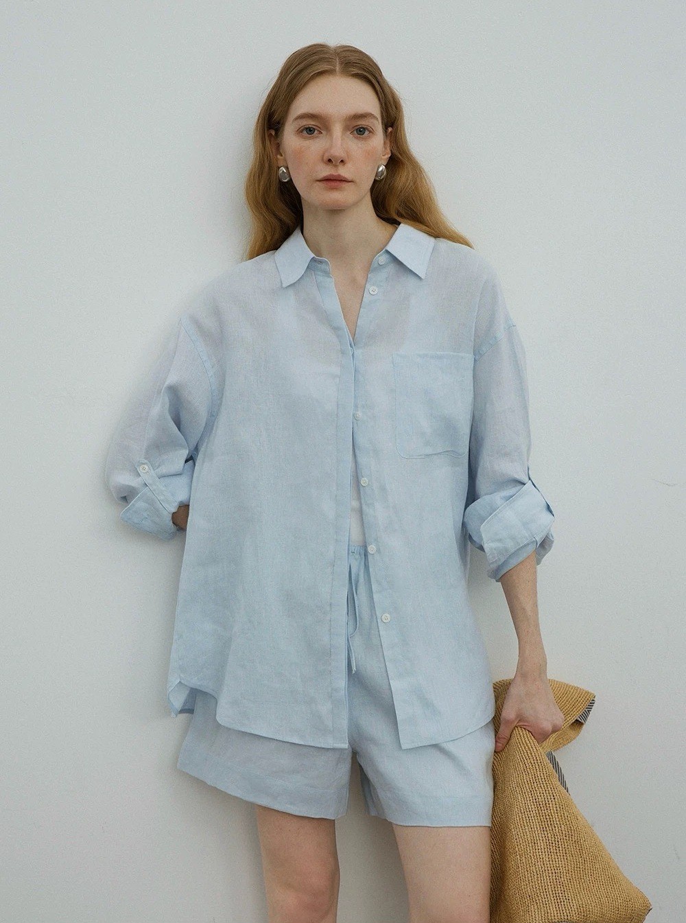 릴렉스한 여름/레이지 캐주얼 올드머니 스타일 솔리드 화이트 린넨 실루엣 셔츠/반바지 슈트스토어 가기