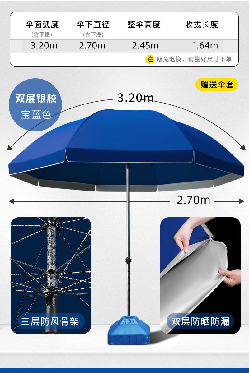 • [이중 우산 천 + 삼중 우산 프레임] 3.6m 특대 사파이어 블루 - 베이스 포함