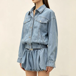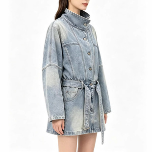 港风复古水洗牛仔外套女夏季新款做旧设计感系带收腰百搭休闲上衣