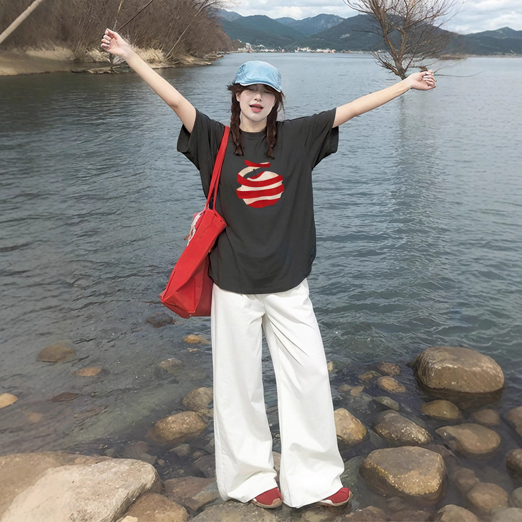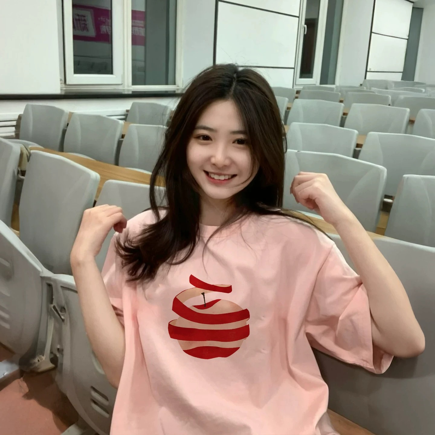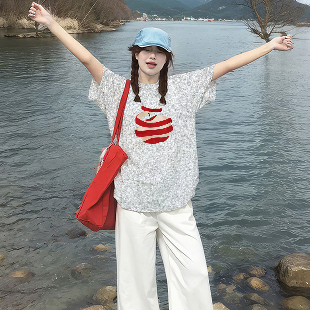순수 코튼 화이트 디자인 애플 프린트 라운드 넥 반팔 티셔츠 여성용 새로운 틈새 하이 엔드 루즈 탑 여름