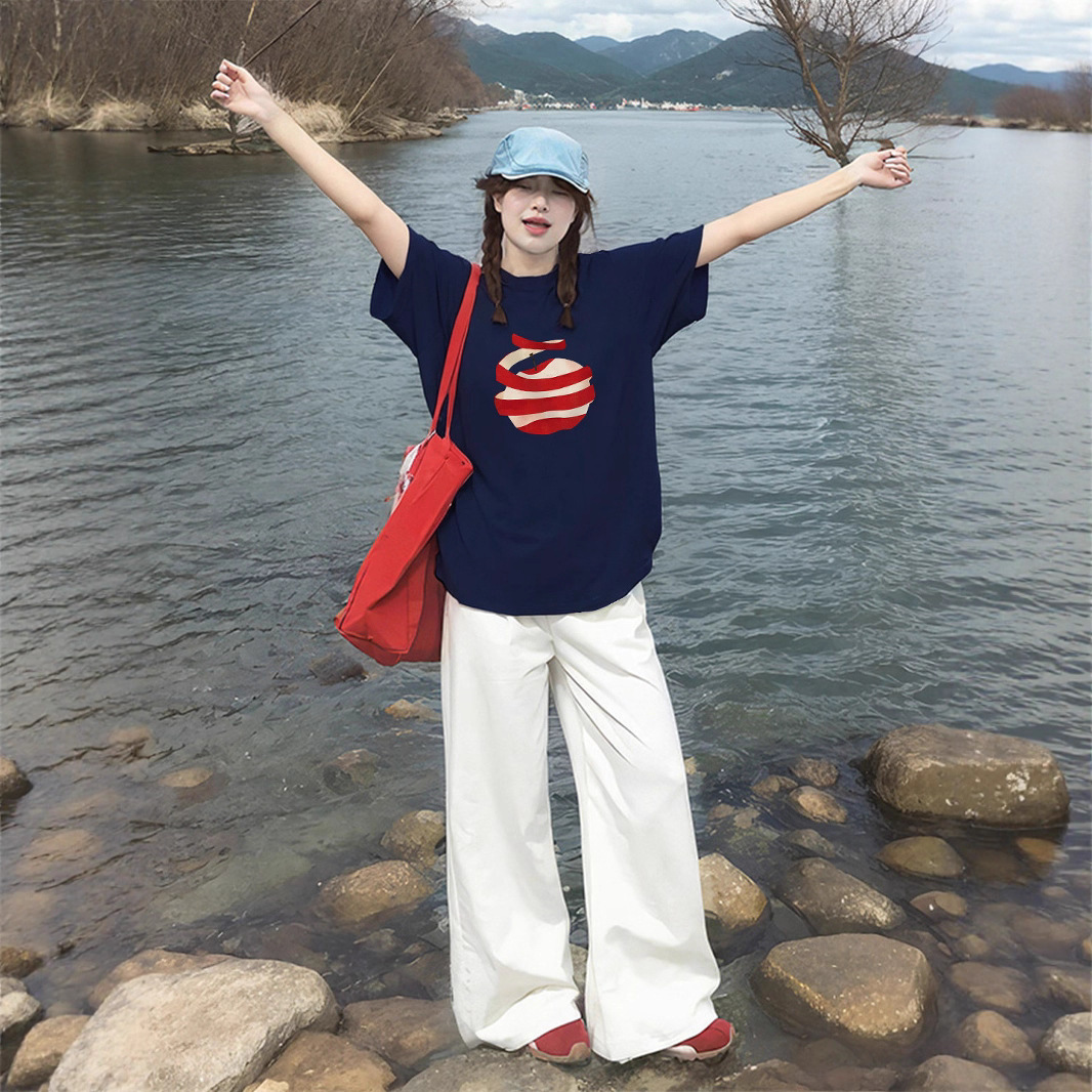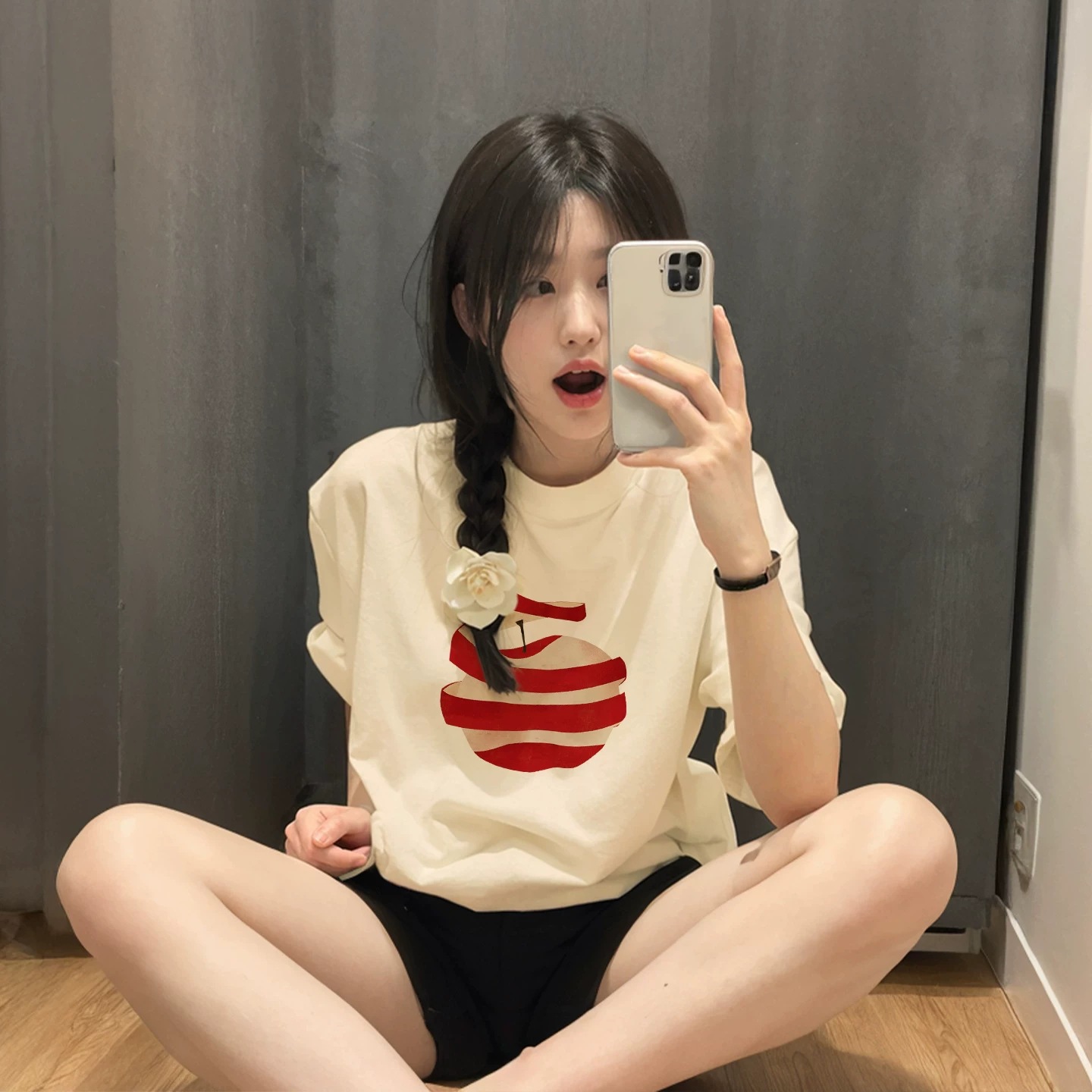 순수 코튼 화이트 디자인 애플 프린트 라운드 넥 반팔 티셔츠 여성용 새로운 틈새 하이 엔드 루즈 탑 여름스토어 가기