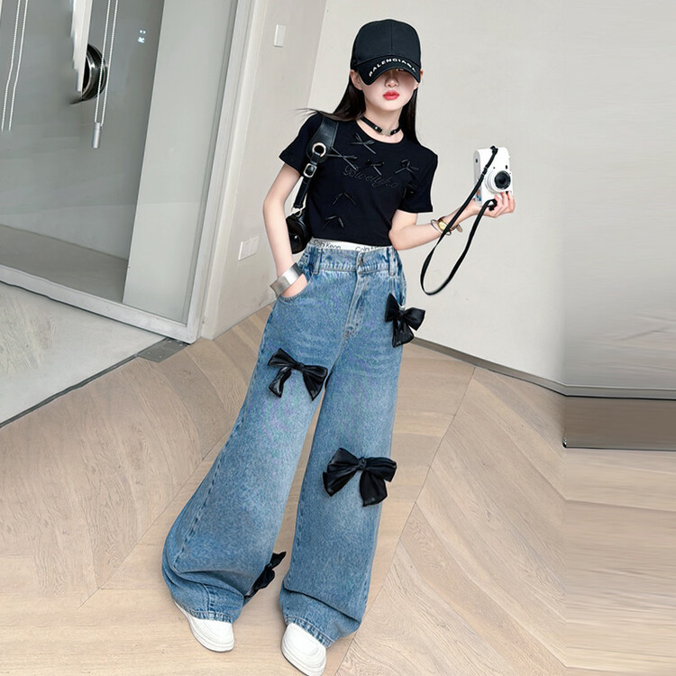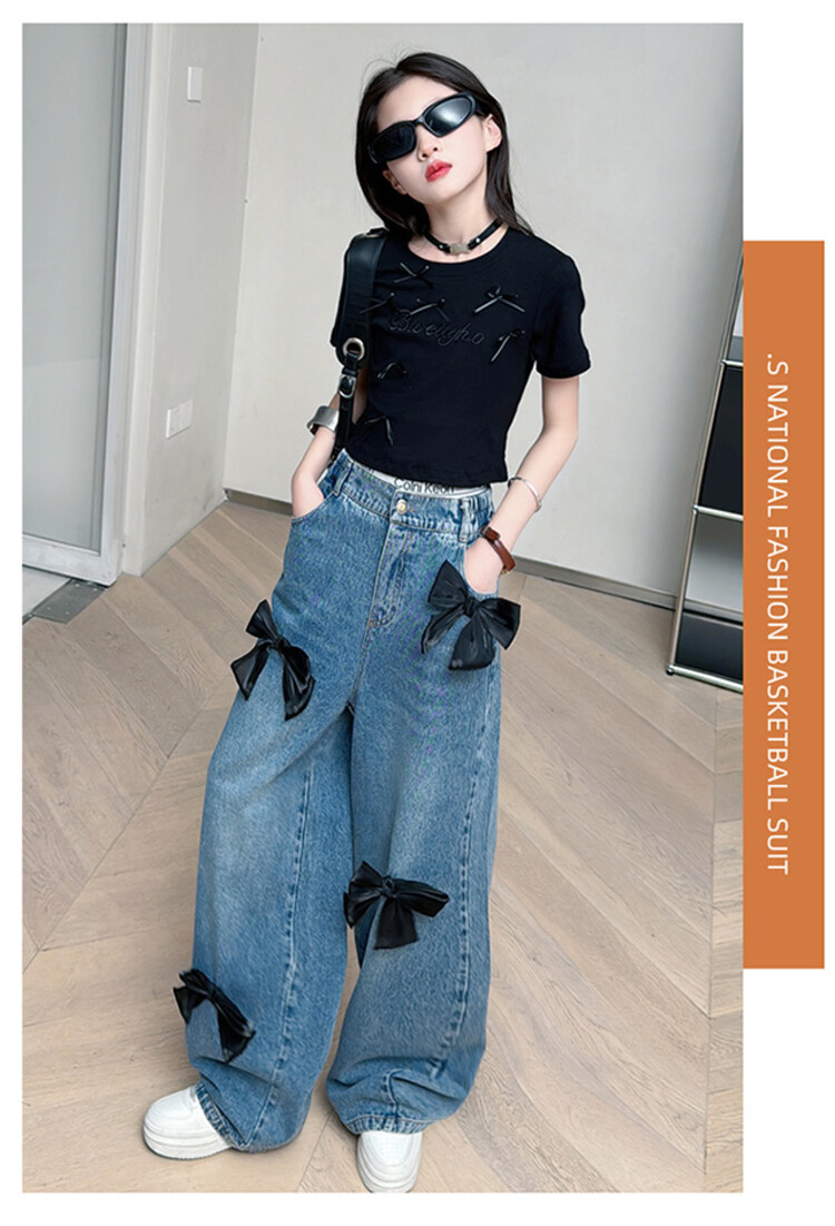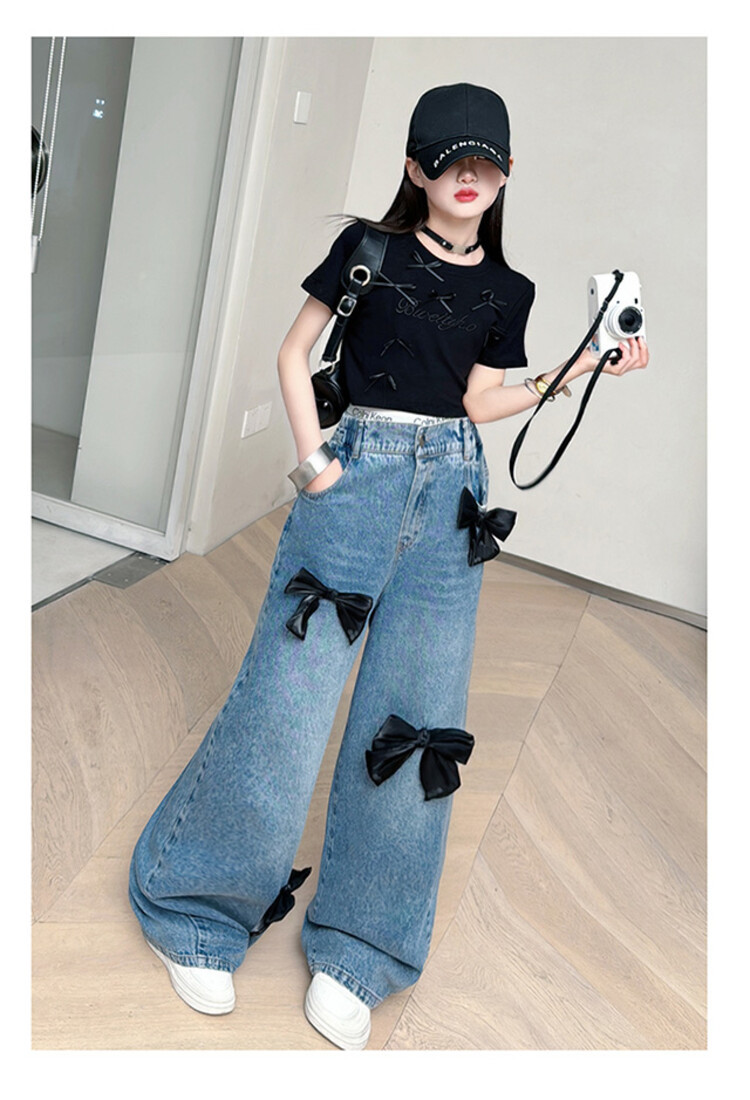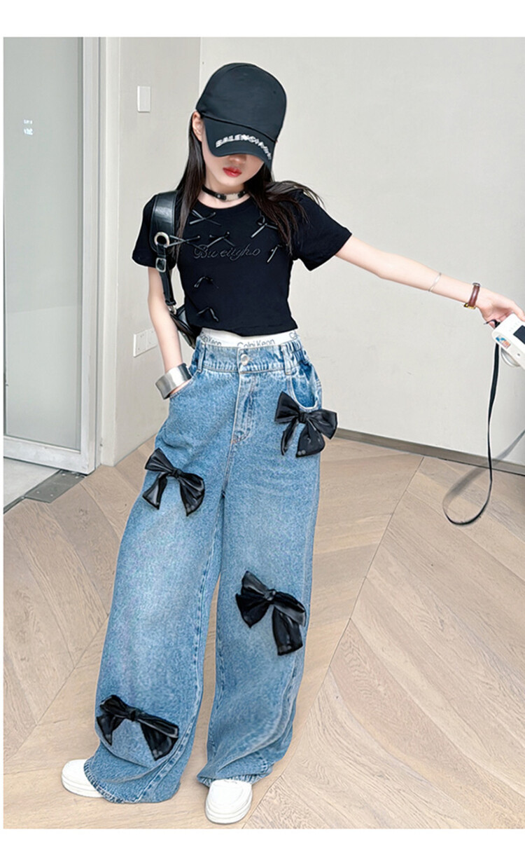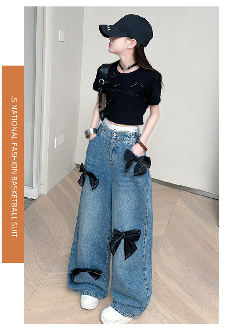 국경 간 도매 2025 여름 새 스타일 여자 청바지 투피스 세트 보우 와이드 레그 팬츠 여자를위한 새로운 바지