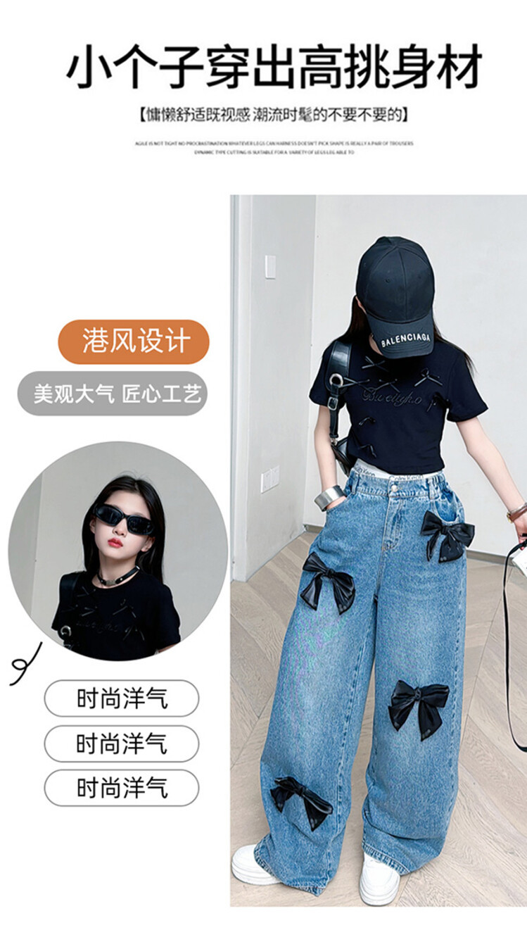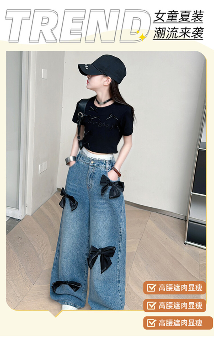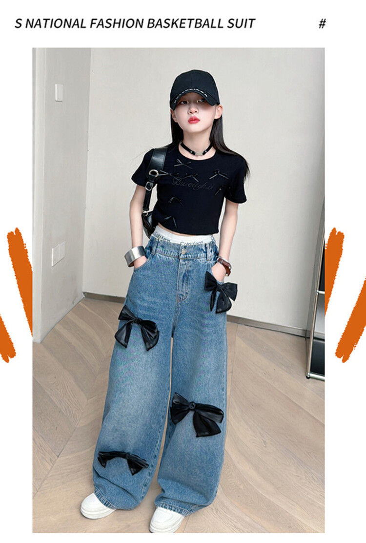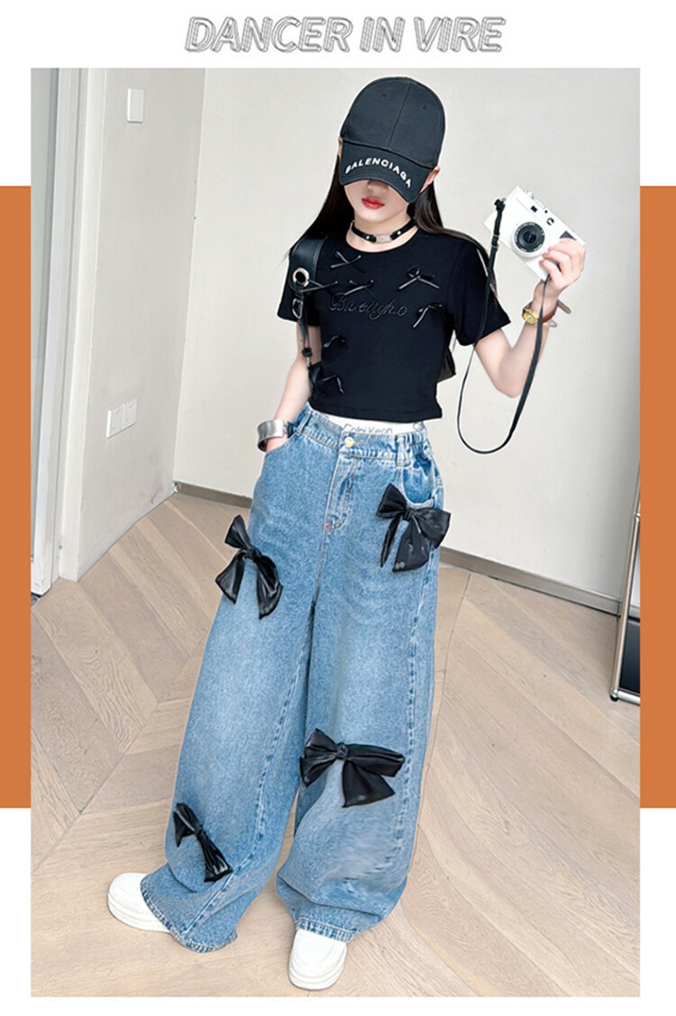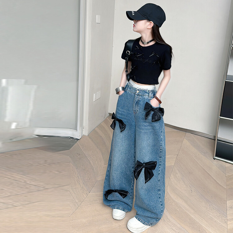 국경 간 도매 2025 여름 새 스타일 여자 청바지 투피스 세트 보우 와이드 레그 팬츠 여자를위한 새로운 바지