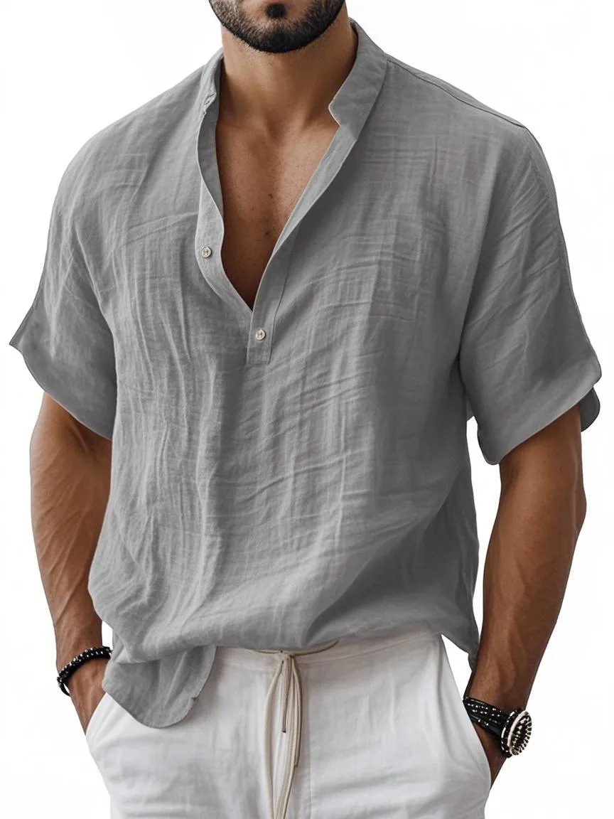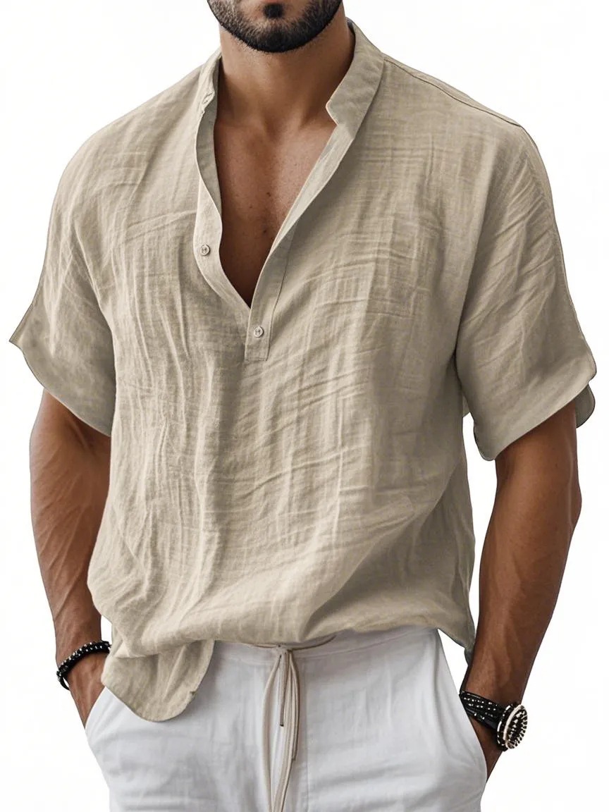 2025 대외 무역 유럽과 미국 남성 여름 신작 남성 라펠 셔츠 솔리드 컬러 반팔 캐주얼 다목적 코튼 린넨 셔츠