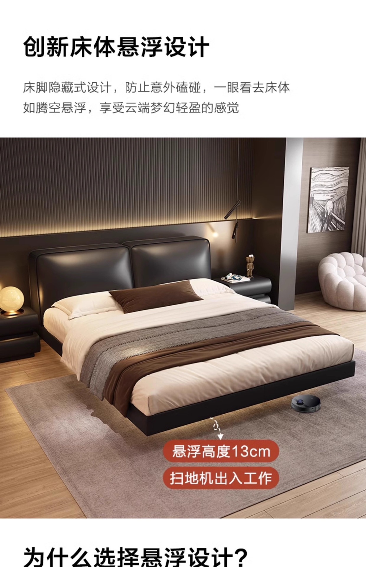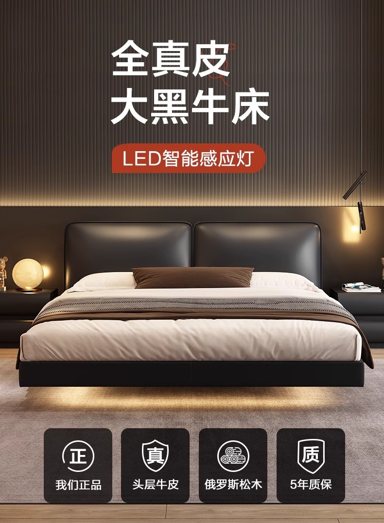 빅 블랙 소가죽 침대, 모던하고 심플한 풀 헤드 레이어 소가죽, 이탈리안 라이트 럭셔리 두부 블록, 서스펜션 마스터 침실 침대스토어 가기